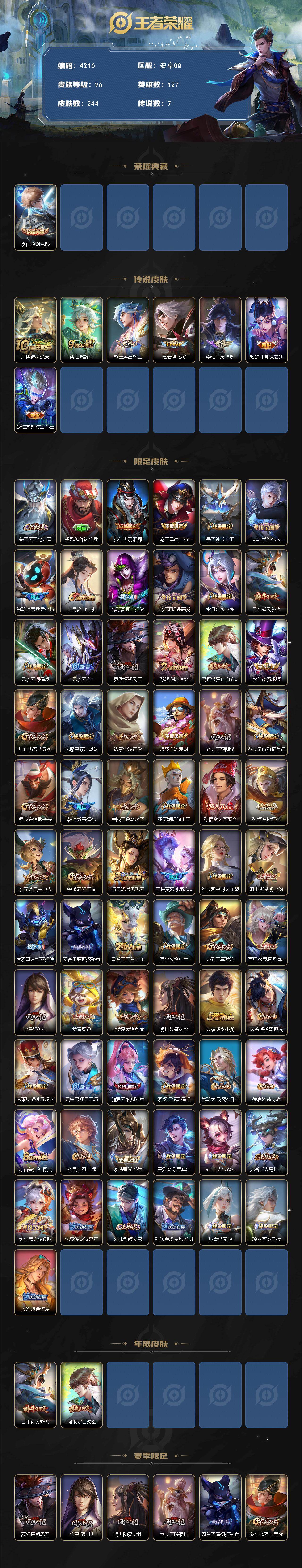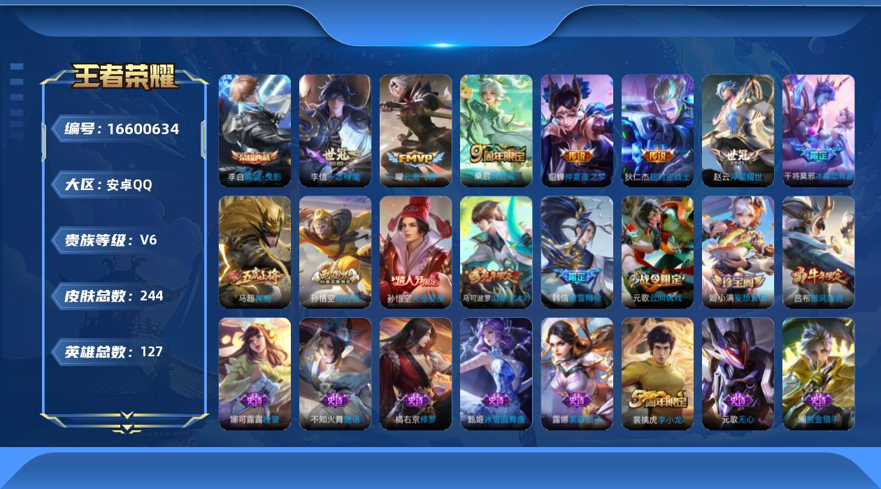 [16600634]安卓q-v6-至尊星耀iii段位-127英雄-244皮肤-1典藏皮肤-7传说-77史诗 【英雄全皮】:影全皮 【荣耀典藏】:李白鸣剑曳影 【传说皮肤】:后羿神树通天,桑启鸣野蒿,赵云淬星耀世,曜云鹰飞将,李信一念神魔,貂蝉仲夏夜之梦,狄仁杰超时空战士 【限定皮肤】:姜子牙天穹之誓,杨戬破阵退雄兵,狄仁杰阴阳师,赵云皇家上将,墨子神迹守卫,嬴政优雅恋人,鲁班七号乒乒小将,庄周高山流水,高渐离死亡摇滚,高渐离玩趣恶龙,芈月幻夜卜梦,吕布御风骁将,元歌云间偶戏,元歌无心,夏侯惇朔风刀,甄姬游园惊梦,马可波罗山海玄木吟,狄仁杰魔术师,狄仁杰万华元夜,达摩星际陆战队,达摩沙漠行僧,项羽海滩派对,老夫子醍醐杖,老夫子航海奇遇记,程咬金演武夺筹,韩信傲雪梅呛,兰陵王金庭之子,亚瑟潮玩骑士王,孙悟空大圣娶亲,孙悟空孙行者,李元芳云中旅人,钟馗驱傩正仪,杨玉环遇见飞天,干将莫邪冰霜恋舞曲,雅典娜单词大作战,雅典娜黎明之约,太乙真人华丽摇滚,鬼谷子原初探秘者,鬼谷子五谷丰年,黄忠火炮绅士,苏烈千军破阵,百里玄策原初追逐者,弈星混沌棋,梦奇顽趣,沈梦溪大漠名商,明世隐疑决卦,裴擒虎李小龙,裴擒虎擒涛扼浪,米莱狄胡桃异想国,云中君纤云弄巧,伽罗天狼溯光者,蒙犽狂想玩偶喵,鲁班大师探海日志,桑启海盐诗旅,阿古朵江河有灵,张良古海寻踪,蒙恬荣光圣徽,高渐离燃音魔法,妲己灵卜魔法,鬼谷子天穹祈灯,姬小满妄想食味,沈梦溪龙舞盛年,刘邦剑破天穹,程咬金群星魔术团,镜青焰无极,项羽苍威无极,周瑜熔金海岸 【年限皮肤】:吕布御风骁将,马可波罗山海玄木吟 【赛季限定】:夏侯惇朔风刀,弈星混沌棋,明世隐疑决卦,老夫子醍醐杖,鬼谷子原初探秘者,狄仁杰万华元夜,程咬金演武夺筹,钟馗驱傩正仪,苏烈千军破阵,达摩沙漠行僧,兰陵王金庭之子,沈梦溪大漠名商,李元芳云中旅人,桑启海盐诗旅,裴擒虎擒涛扼浪,鲁班大师探海日志,张良古海寻踪,鬼谷子天穹祈灯,刘邦剑破天穹,姜子牙天穹之誓,东皇太一噬灭天穹,太乙真人谧流熔炉,亚瑟荣光之誓,百里玄策原初追逐者,雅典娜黎明之约,梦奇顽趣,蒙恬荣光圣徽,牛魔星界战将 【战令限定】:蒙犽狂想玩偶喵,雅典娜单词大作战,元歌云间偶戏,亚瑟潮玩骑士王,米莱狄胡桃异想国,达摩星际陆战队,老夫子航海奇遇记,墨子神迹守卫,黄忠火炮绅士,芈月幻夜卜梦,高渐离燃音魔法,妲己灵卜魔法,镜青焰无极,项羽苍