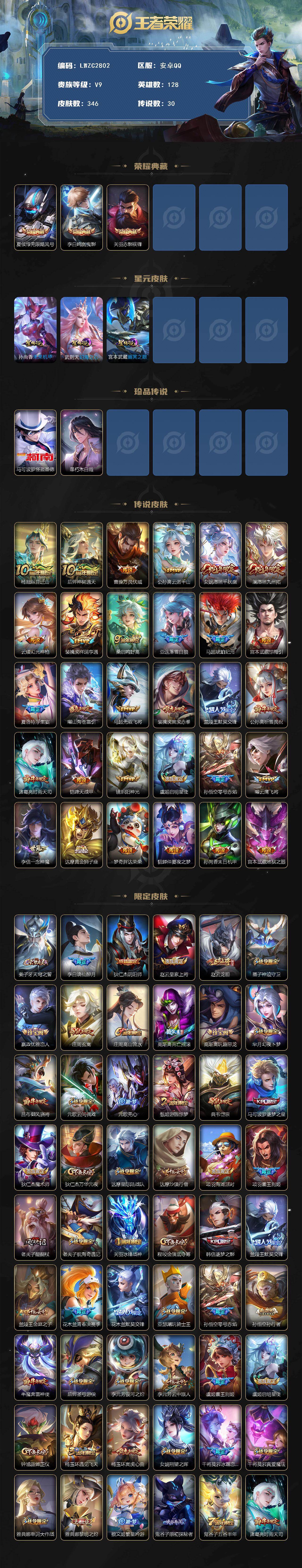 128英雄-346皮肤-可二次【特价出售/店主推荐/5市标/37段打野】:安卓q-v9-最强王者段位-128英雄-346皮肤-3典藏皮肤-2珍品传说-3星元-30传说-120史诗 【英雄全皮】:孙权全皮,亚连全皮,马超全皮,蒙恬全皮,夏洛特全皮,空空儿全皮,影全皮 【荣耀典藏】:夏侯惇无限飓风号,李白鸣剑曳影,关羽赤影疾锋