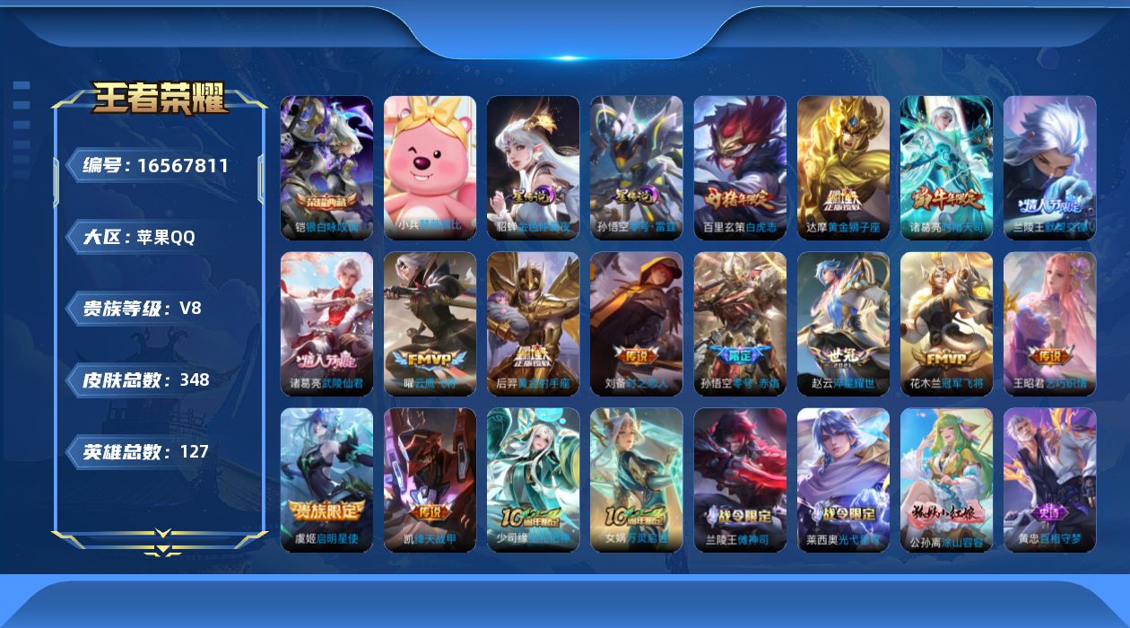 [16567811]苹果q-v8-最强王者段位-127英雄-348皮肤-1典藏皮肤-1典藏英雄-15传说-108史诗 【英雄全皮】:刘邦全皮,猪八戒全皮,蒙恬全皮,影全皮 【荣耀典藏】:武则天英雄,铠银白咏叹调 【传说皮肤】:后羿神树通天,赵云淬星耀世,王昭君乞巧织情,兰陵王默契交锋,诸葛亮时雨天司,铠绛天战甲,虞姬启明星使,孙悟空零号赤焰,曜云鹰飞将,刘备时之恋人,达摩黄金狮子座,百里玄策白虎志,花木兰冠军飞将,后羿黄金射手座,诸葛亮武陵仙君 【限定皮肤】:白起狰,狄仁杰阴阳师,虞姬凯尔特女王,赵云皇家上将,赵云龙胆,妲己时之彼端,嬴政白昼王子,孙尚香蔷薇恋人,鲁班七号狮舞东方,庄周蜃楼王,庄周高山流水,阿轲迷踪丽影,钟无艳王者之锤,钟无艳超时空战士,孙膑妖精王,孙膑天狼运算者,扁鹊炼金王,扁鹊奇幻香踪,白起夜都怪侠,芈月重明,芈月幻夜卜梦,吕布猎兽之王,元歌云间偶戏,元歌无心,夏侯惇朔风刀,甄姬游园惊梦,甄姬落雪兰心,曹操烛龙,典韦穷奇,典韦蓝屏警告,马可波罗暗影游猎,马可波罗山海玄木吟,狄仁杰魔术师,狄仁杰万华元夜,达摩沙漠行僧,项羽海滩派对,项羽霸王别姬,老夫子醍醐杖,关羽冰锋战神,程咬金演武夺筹,露娜一生所爱,刘邦夺宝奇兵,王昭君午后时光,兰陵王默契交锋,兰陵王金庭之子,花木兰瑞麟志,花木兰默契交锋,亚瑟狮心王,亚瑟潮玩骑士王,孙悟空美猴王,孙悟空至尊宝,孙悟空大圣娶亲,孙悟空零号赤焰,牛魔御旌,张飞虎魄,李元芳银河之约,李元芳云中旅人,虞姬启明星使,钟馗神迹守卫,钟馗驱傩正仪,杨玉环遇见飞天,杨戬潮玩骑兵,女娲朔望之晖,哪吒逐梦之翼,雅典娜单词大作战,蔡文姬繁星吟游,太乙真人饕餮,东皇太一逐梦之光,鬼谷子原初探秘者,诸葛亮武陵仙君,诸葛亮时雨天司,黄忠烈魂,黄忠火炮绅士,铠青龙志,苏烈玄武志,苏烈千军破阵,百里玄策白虎志,百里玄策原初追逐者,百里守约朱雀志,弈星混沌棋,沈梦溪星空之诺,沈梦溪大漠名商,明世隐疑决卦,明世隐吟游魔法,裴擒虎天狼狩猎者,裴擒虎李小龙,裴擒虎擒涛扼浪,狂铁御狮,狂铁电玩高手,米莱狄御霄,米莱狄胡桃异想国,云中君纤云弄巧,盾山御銮,猪八戒西部大镖客,猪八戒猪悟能,上官婉儿梁祝,上官婉儿天狼绘梦者,嫦娥拒霜思,嫦娥暖冬兔眠,西施玲珑珍味,蒙犽狂想玩偶喵,鲁班大师探海日志,桑启海盐诗旅,暃星界游侠,张良古海寻踪,蒙犽百解令,蒙恬荣光圣徽,鬼谷子天穹祈灯