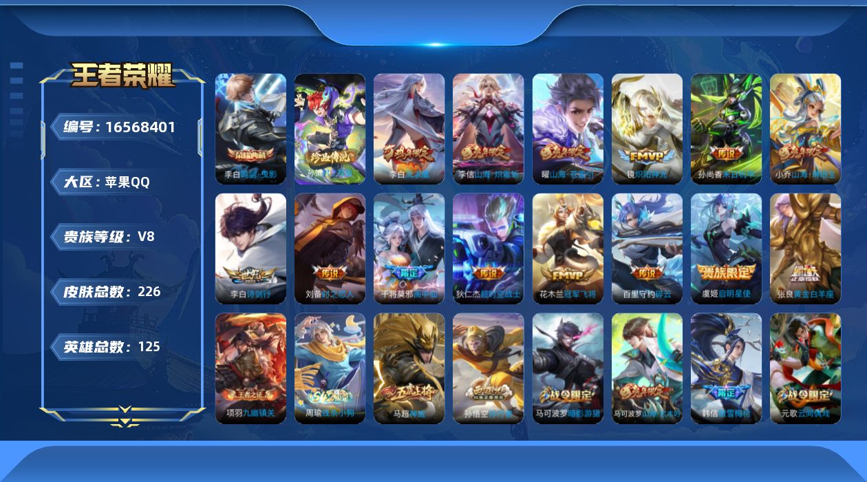 [16568401]苹果q-v8-永恒钻石ii段位-125英雄-226皮肤-1典藏皮肤-1珍品传说-14传说-65史诗 【英雄全皮】:影全皮 【荣耀典藏】:李白鸣剑曳影 【珍品传说】:孙策时之奇旅 【传说皮肤】:干将莫邪画中仙,小乔山海琳琅生,曜山海苍雷引,李信山海炽霜斩,李白诗剑行,百里守约碎云,镜炽阳神光,虞姬启明星使,刘备时之恋人,张良黄金白羊座,花木兰冠军飞将,李白凤求凰,孙尚香末日机甲,狄仁杰超时空战士 【限定皮肤】:狄仁杰阴阳师,小乔山海琳琅生,赵云皇家上将,墨子神迹守卫,墨子降魔,庄周高山流水,高渐离死亡摇滚,阿轲迷踪丽影,吕布御风骁将,周瑜赤莲之焰,元歌云间偶戏,元歌无心,夏侯惇朔风刀,马可波罗暗影游猎,马可波罗山海玄木吟,狄仁杰魔术师,狄仁杰万华元夜,达摩沙漠行僧,项羽海滩派对,老夫子醍醐杖,老夫子航海奇遇记,程咬金演武夺筹,刘邦夺宝奇兵,韩信傲雪梅呛,兰陵王驯魔猎人,兰陵王金庭之子,亚瑟潮玩骑士王,孙悟空孙行者,后羿圣弓游侠,李元芳银河之约,李元芳云中旅人,虞姬启明星使,钟馗驱傩正仪,杨玉环遇见飞天,干将莫邪真爱魔法,干将莫邪画中仙,雅典娜单词大作战,雅典娜黎明之约,蔡文姬繁星吟游,太乙真人华丽摇滚,鬼谷子原初探秘者,鬼谷子五谷丰年,苏烈千军破阵,百里玄策原初追逐者,弈星混沌棋,梦奇顽趣,沈梦溪星空之诺,沈梦溪大漠名商,明世隐疑决卦,裴擒虎李小龙,裴擒虎擒涛扼浪,云中君纤云弄巧,李信山海炽霜斩,盾山御銮,猪八戒西部大镖客,上官婉儿梁祝,曜山海苍雷引,蒙犽狂想玩偶喵,桑启海盐诗旅,艾琳女武神,张良古海寻踪,蒙恬荣光圣徽,鬼谷子天穹祈灯,姬小满妄想食味 【年限皮肤】:李白凤求凰,吕布御风骁将,小乔山海琳琅生,曜山海苍雷引,李信山海炽霜斩,马可波罗山海玄木吟 【赛季限定】:盾山御銮,夏侯惇朔风刀,弈星混沌棋,明世隐疑决卦,老夫子醍醐杖,鬼谷子原初探秘者,狄仁杰万华元夜,程咬金演武夺筹,钟馗驱傩正仪,苏烈千军破阵,达摩沙漠行僧,兰陵王金庭之子,沈梦溪大漠名商,李元芳云中旅人,桑启海盐诗旅,裴擒虎擒涛扼浪,张良古海寻踪,鬼谷子天穹祈灯,东皇太一噬灭天穹,太乙真人谧流熔炉,钟馗虚灵犬护,甄姬逆浪荇歌,百里玄策原初追逐者,雅典娜黎明之约,梦奇顽趣,蒙恬荣光圣徽,项羽九幽镇关 【战令限定】:兰陵王驯魔猎人,周瑜赤莲之焰,李元芳银河之约,沈梦溪星空之诺,阿轲迷踪丽影,刘邦夺宝奇兵,