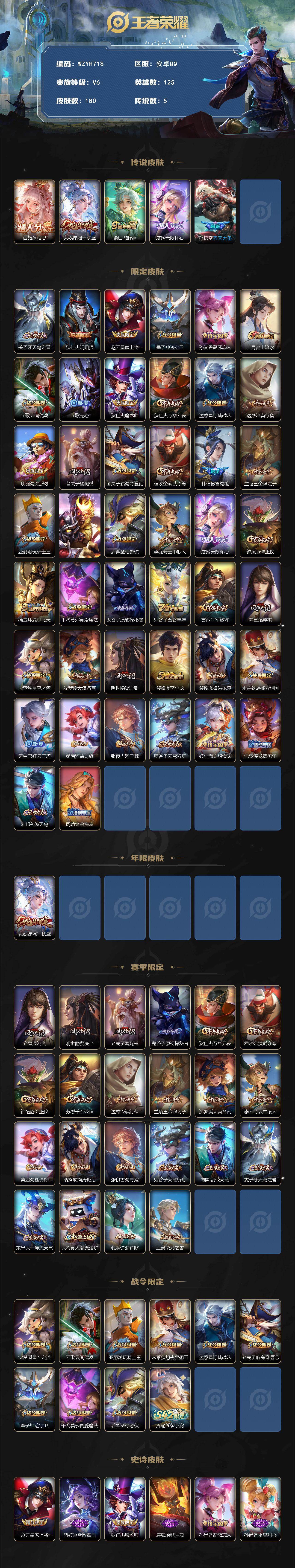 【wzyh718】贵族6/皮肤180/传说5/史诗38/英雄125/孙权全皮/西施续相思/女娲愿照千秋盛/桑启鸣野蒿/虞姬无限倾心/孙悟空齐天大圣/姜子牙天穹之誓/狄仁杰阴阳师/赵云皇家上将/墨子神迹守卫/孙尚香蔷薇恋人/庄周高山流水/元歌云间偶戏/元歌无心/狄仁杰魔术师/狄仁杰万华元夜/达摩星际陆战队/达摩沙漠行僧/项羽海滩派对/老夫子醍醐杖/老夫子航海奇遇记/程咬金演武夺筹/韩信傲雪梅呛/兰陵王金庭之子/亚瑟潮玩骑士王/后羿圣弓游侠/李元芳云中旅人/钟馗驱傩正仪/杨玉环遇见飞天/干将莫邪真爱魔法/鬼谷子原初探秘者/鬼谷子五谷丰年/苏烈千军破阵/弈星混沌棋/沈梦溪星空之诺/沈梦溪大漠名商/明世隐疑决卦/裴擒虎李小龙/裴擒虎擒涛扼浪/米莱狄胡桃异想国/云中君纤云弄巧/桑启海盐诗旅/张良古海寻踪/鬼谷子天穹祈灯/姬小满妄想食味/沈梦溪龙舞盛年/刘邦剑破天穹/周瑜熔金海岸/东皇太一噬灭天穹/太乙真人谧流熔炉/甄姬逆浪荇歌/亚瑟荣光之誓/周瑜线条小狗/甄姬冰雪圆舞曲/廉颇地狱岩魂/孙尚香水果甜心/妲己魅力维加斯/妲己女仆咖啡/墨子金属风暴/曹操幽灵船长/吕布末日机甲/花木兰水晶猎龙者/亚瑟心灵战警/雅典娜冰冠公主/李元芳逐浪之夏/白起星夜王子/阿轲节奏热浪/孙策猫狗日记/大乔猫狗日记/狄仁杰鹰眼统帅/孙尚香时之恋人/西施诗语江南/赵怀真器灵浮梦炉/狂铁龙之律动/百里守约雪豹霜爪/黄忠百相守梦/韩信教廷特使/韩信街头霸王/露娜哥特玫瑰/阿轲爱心护理/芈月红桃皇后/白起白色死神/牛魔西部大镖客/扁鹊化身博士/安琪拉玩偶对对碰/妲己少女阿狸/典韦黄金武士/亚瑟死亡骑士/达摩拳王/花木兰兔女郎/张飞五福同心/甄姬花好人间/刘备万事如意/关羽龙腾万里/钟无艳海滩丽影/宫本武藏霸王丸/狂铁命运角斗场/老夫子功夫老勺/孙尚香沉稳之力/鬼谷子幻乐之宴/苏烈坚韧之力/大乔守护之力/庄周奇妙博物学/沈梦溪鲨炮海盗猫/姜子牙炽热元素使/哪吒次元突破/鲁班七号黑桃队长/盾山圆桌骑士/刘禅秘密基地/杨戬次元傲视/露娜瓷语鉴心/张良缤纷绘卷/盘古重装意志/鲁班大师乓乓大师/典韦铁甲之心/妲己紫罗兰之誓/蒙犽胡桃狂想曲/蒙恬蔚蓝守将/猪八戒潮玩探月行/太乙真人劲辣红锅/莱西奥西部游侠/亚连破局者/海诺时空谍影/盘古敬我三分/西施雪境奇遇/姜子牙星梦巡礼/少司缘灵卦秘语/戈娅玫蓝誓约/张良灵野札记/阿古朵布丁狗之约/高渐离落日弦歌/莱西奥踏浪烽翎/桑启青衿临川/孙权径山谋武/艾琳鹤鸣心笺/鲁班七号福禄兄弟/高渐离金属狂潮/露娜绯红之刃/钟无艳生化警戒/貂蝉异域舞娘/老夫子潮流仙人/狄仁杰锦衣卫/曹操超能战警/小乔万圣前夜/孙膑未来旅行/周瑜海军大将/刘禅英喵野望/兰陵王隐刃/李白范海辛/李元芳特种部队/虞姬加勒比小姐/哪吒三太子/黄忠芝加哥教父/干将莫邪第七人偶/铠龙域领主/百里守约绝影神呛/百里玄策威尼斯狂欢/梦奇美梦成真/女娲尼罗河女神/明世隐占星师/公孙离花间舞/杨玉环霓裳曲/弈星踏雪寻梅/元歌午夜歌剧院/司马懿魇语军师/沈梦溪棒球奇才/李信灼热之刃/嫦娥露花倒影/盘古创世神祝/瑶森/云中君荷鲁斯之眼/曜归虚梦演/马超幸存者/西施归虚梦演/蒙犽归虚梦演/镜冰刃幻境/蒙恬秩序猎龙将/澜孤猎/司空震启蛰/云缨赤焰之缨/暃碧珀绯影