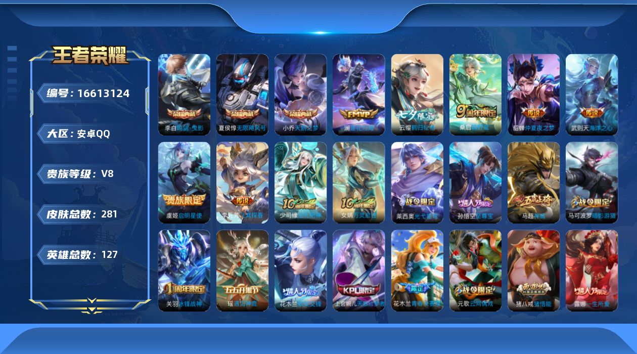 [16613124]v8 3典藏 8传说 127英雄 281皮肤 典藏英雄武则天 可修改实名 【英雄全皮】孙权全皮蚩奼全皮猪八戒全皮 【稀有英雄】大司命嬴政始皇帝韩信韩跳跳夏洛特夏师傅艾琳橘右京橘子娜可露露鸟人不知火舞赵云金蝉唐僧戈娅 【荣耀水晶】鸣剑·曳影天鹅之梦小乔典藏无限飓风号高达 【传说皮】神树通天仲夏夜之梦大飞蛾海洋之心飞鸢探春鹤归松栖云缨澜逐花归海 【珍宝阁皮】蔷薇恋人女武神 【赛季/战令皮】古海寻踪s33海盐诗旅s30擒涛扼浪s31探海日志s32驭风魔法玲珑珍味流音漫舞剑破天穹s35天穹祈灯s34虞姬夏日便利店炼金王s6凯尔特女王s7狰s8饕餮s9烛龙s10重明s11穷奇s12御狮s13御霄s14御旌s15御銮s16朔风刀s17混沌棋s18疑决卦s19醍醐杖s20原初探秘者s21万华元夜s22演武夺筹s23驱傩正仪s24千军破阵s25星空之诺银河之约西部大镖客-猪八戒暗影游猎游乐娃子单词大作战狂想玩偶喵潮玩骑士王云间偶戏圣弓游侠真爱魔法火炮绅士沙漠行僧s26幻夜卜梦金庭之子s27云中旅人s29 【史诗皮】光弋星穹巫礼祀神万灵启世遇见神鹿紫霞仙子苍穹之光电玩小子小书包黄金分割率特工魅影千年之狐龙骑士小龙虾冰冠公主偶像歌手无限星赏官江河有灵暗夜猫娘末日机甲-吕布猫狗日记-孙策乱世虎臣节奏热浪修罗女仆咖啡摇滚巨星水果甜心天才门将星夜王子心灵骇客功夫厨神德古拉伯爵暗隐猎兽者幽灵船长鬼剑武藏心灵战警天秀·启明舞动绿茵地狱岩魂纤云弄巧拒霜思缤纷独角兽乘风破浪逐浪之夏水晶猎龙者曙光守护者箭羽风息金属风暴原初追逐者圣诞狂欢圣诞恋歌鹰眼统帅暗夜贵公子魅力维加斯未来纪元-赵云 【限定皮】鸣野蒿至尊宝神威电光马子遇见飞天高山流水冰锋战神游园惊梦梁祝天狼绘梦者李小龙默契交锋-花木兰猪悟能一生所爱青春决赛季 【普通皮】劲辣红锅铁骨偃魂苍林狼骑星梦巡礼熔金海岸街头霸王