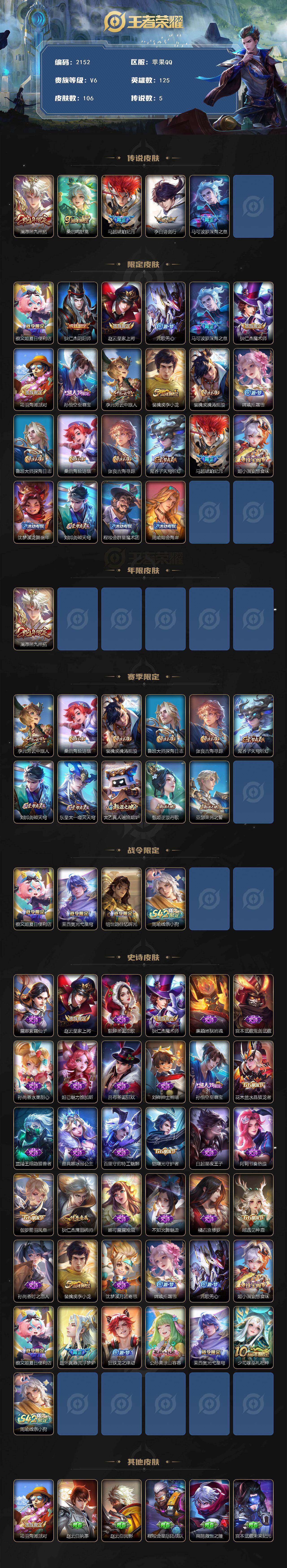 125英雄-106皮肤-【2152】df苹果q-v6-【打野小号,至尊宝,九州拓,马超琥珀,】至尊星耀ii段位-125英雄-106皮肤-5传说-36史诗 【英雄全皮】:孙权全皮 【传说皮肤】:澜愿照九州拓,桑启鸣野蒿,马超琥珀纪元,李白诗剑行,马可波罗深海之息 【限定皮肤】:蔡文姬夏日便利店,狄仁杰阴阳师,赵云皇家上将,元歌无心,马可波罗深海之息,狄仁杰魔术师,项羽海滩派对,孙悟空至尊宝,李元芳云中旅人,裴擒虎李小龙