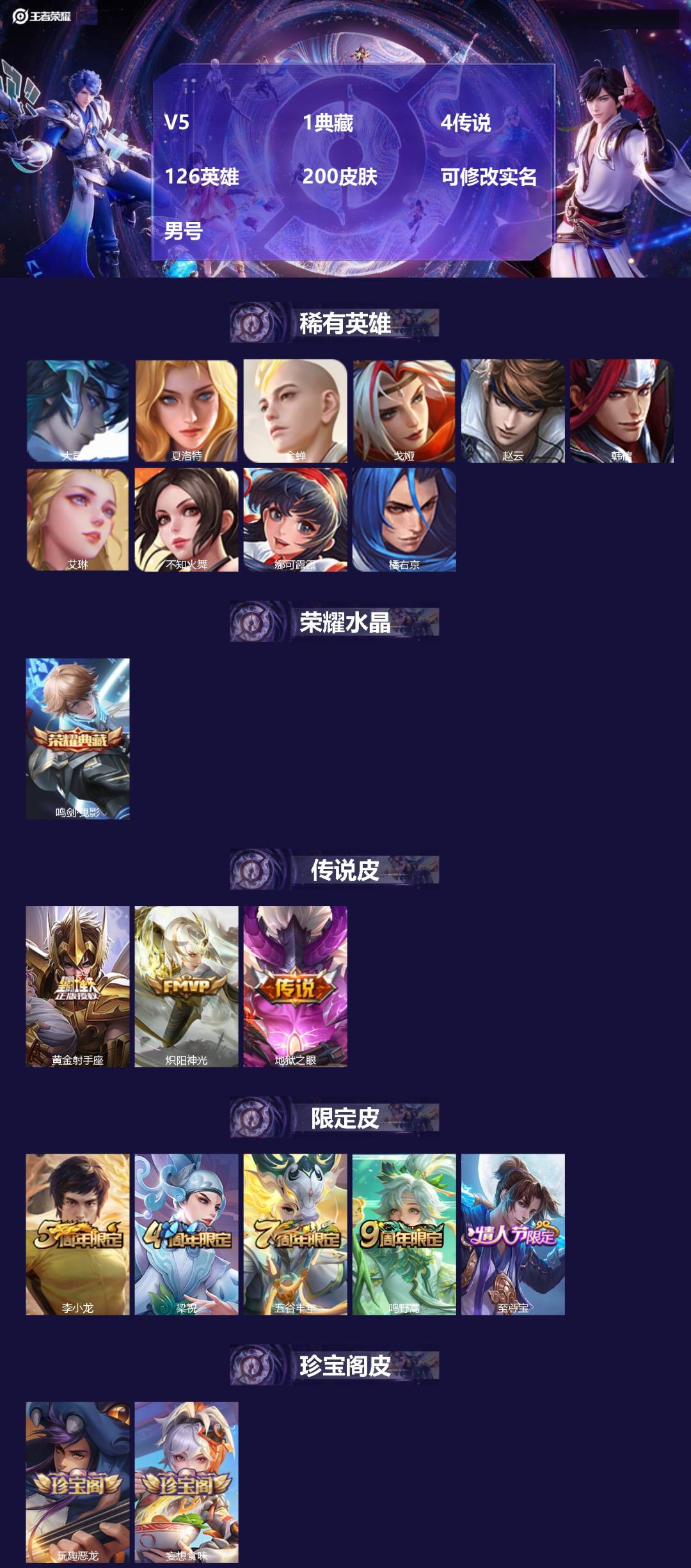 v5 1典藏 4传说 126英雄 200皮肤 可修改实名 男号 【英雄全皮】狂铁全皮大禹全皮 【稀有英雄】大司命韩信韩跳跳夏洛特夏师傅艾琳橘右京橘子娜可露露鸟人不知火舞赵云金蝉唐僧戈娅 【荣耀水晶】鸣剑·曳影 【传说皮】黄金射手座地狱之眼炽阳神光 【珍宝
