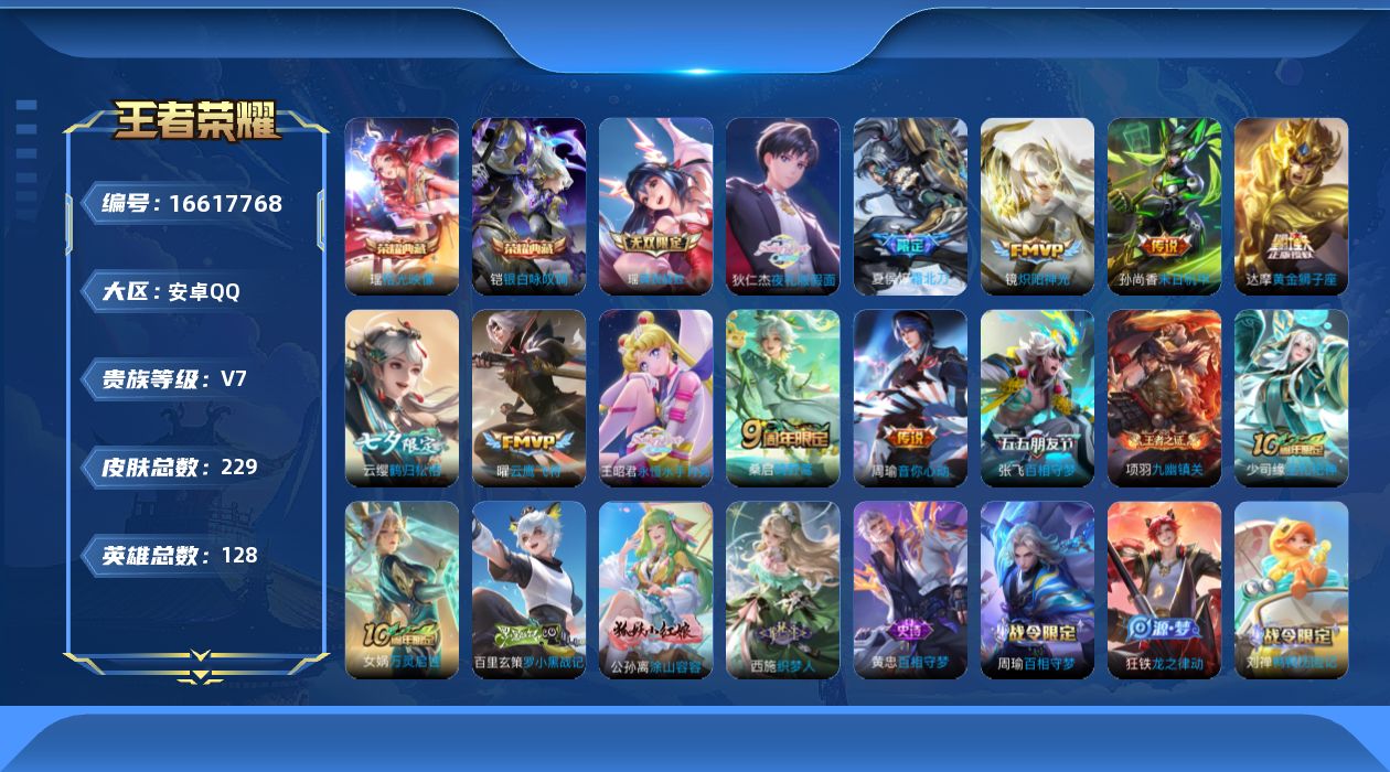 [16617768]v7 2典藏 1无双 12传说 128英雄 229皮肤 可修改实名 男号 【英雄全皮】敖隐全皮空空儿全皮蚩奼全皮刘邦全皮影全皮大禹全皮 【稀有英雄】敖隐小龙人大司命嬴政始皇帝韩信韩跳跳夏洛特夏师傅艾琳橘右京橘子娜可露露鸟人不知火舞赵云金蝉唐僧戈娅 【荣耀水晶】拾光映像瑶典藏银白咏叹调倪克斯侍卫 【无双皮】真我赫兹瑶瑶无双 【传说皮】神树通天永恒水手月亮黄金狮子座末日机甲-孙尚香绿蚂蚱云鹰飞将小将军炽阳神光音你心动-周瑜百相守梦张飞鹤归松栖云缨夜礼服假面 【珍宝阁皮】妄想食味 【赛季/战令皮】噬灭天穹s37古海寻踪s33海盐诗旅s30擒涛扼浪s31潮玩骑兵奇幻香踪探海日志s32驭风魔法玲珑珍味流音漫舞顽趣-梦奇地狱燃心剑破天穹s35天穹祈灯s34青焰无极苍威无极天穹之誓s36蔡文姬夏日便利店虞姬夏日便利店狮舞东方驯魔猎人银河之约夺宝奇兵云间偶戏胡桃异想国电玩高手电玩铁子超时空战士-钟无艳 【史诗皮】鸭鸭历险记-刘禅龙之律动百相守梦-周瑜百相守梦-黄忠织梦人撼地雄心茶境仙星界战将百相守梦-百里守约谪仙醉月破空之剑战舞者蒙犽顽岩魄埋骨钱芈月浮光幕影怒海争锋涂山容容罗小黑战记-百里玄策九幽镇关万灵启世巫礼祀神遇见神鹿紫霞仙子电玩小子小书包特工魅影千年之狐鹤归松栖赵怀真百解令蒙犽高渐离燃音魔法龙骑士小龙虾冰冠公主偶像歌手晚萤江河有灵暗夜猫娘匿光破解者电玩·爆裂旋风末日机甲-吕布猫狗日记-孙策猫狗日记-大乔乱世虎臣修罗摇滚巨星水果甜心绅士熊喵星夜王子心灵骇客功夫厨神德古拉伯爵暗隐猎兽者鬼剑武藏舞动绿茵纤云弄巧拒霜思缤纷独角兽乘风破浪曙光守护者金属风暴鹰眼统帅王者之锤魅力维加斯 【限定皮】逐霄战戟鸣野蒿夏侯惇霜北刀魔法小厨娘天狼运算者岱宗典韦年限李小龙孙行者 【普通皮】谧流熔炉百相守梦-老夫子雾都夜雨魅影绮裳刘邦虎啸剑宗访茗客苍林狼骑雪境奇遇-西施星梦巡礼劲辣红锅大乔绒语心约景韶洛都街头霸王功夫炙烤熔金
