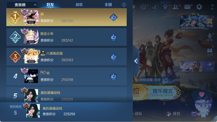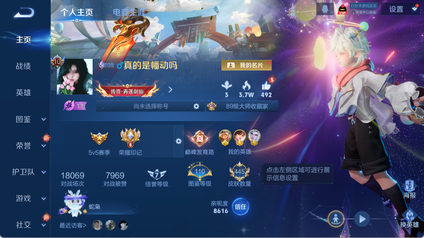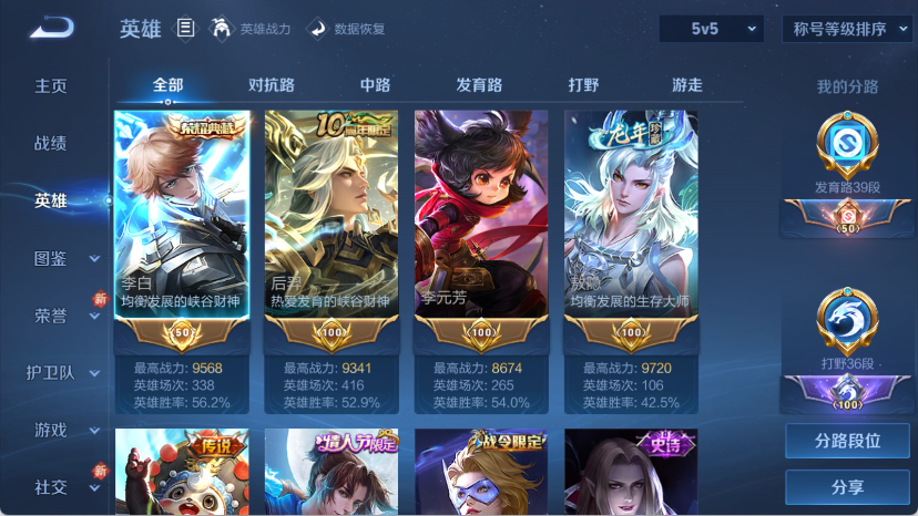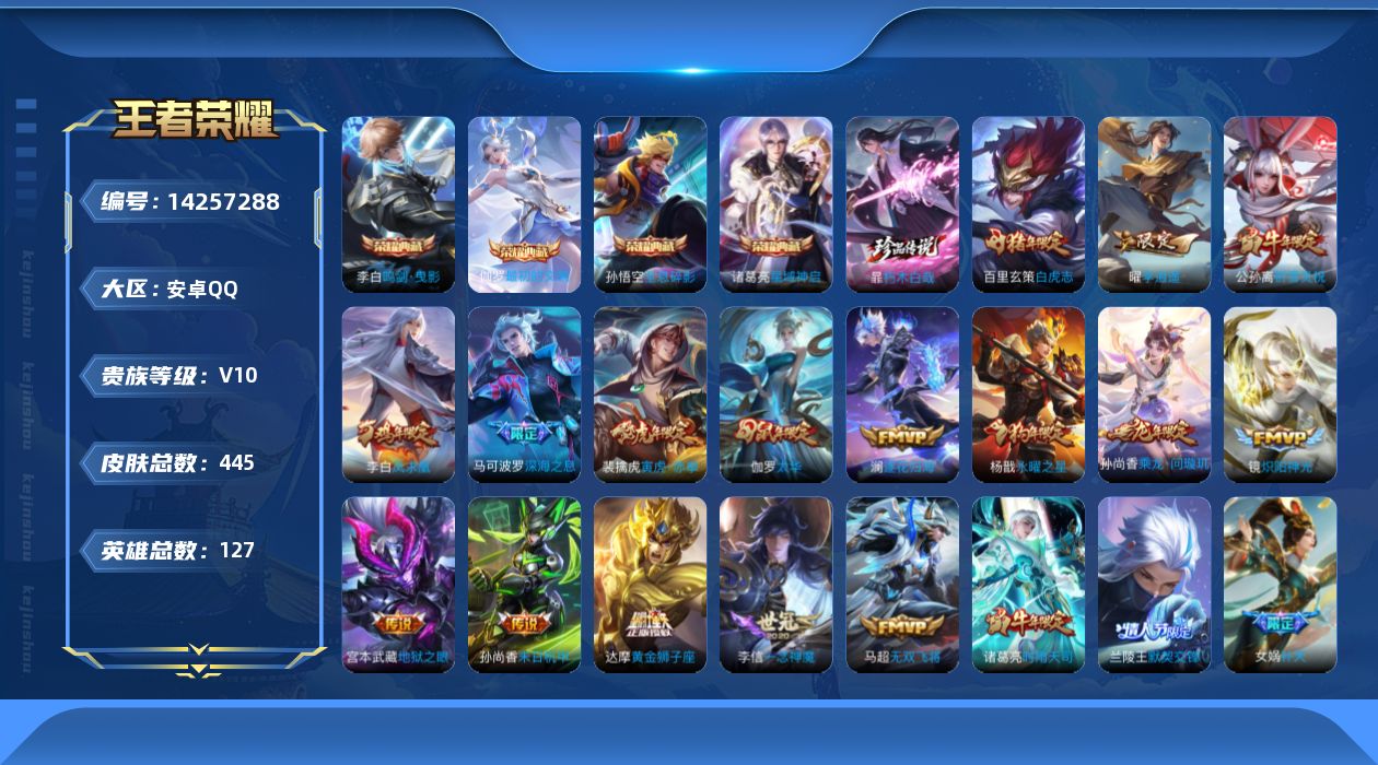 实名: 可修改 贵族等级: v10 英雄数: 127 皮肤数: 445 荣耀水晶: 鸣剑·曳影全息碎影星域神启最初的交响 珍品传说: 朽木白哉 传说皮: 黄金狮子座黄金射手座云鹰飞将黄金白羊座炽阳神光一念神魔云霓雀翎末日机甲-孙尚香地狱火仲夏夜之梦零号·赤焰地狱之眼音你
