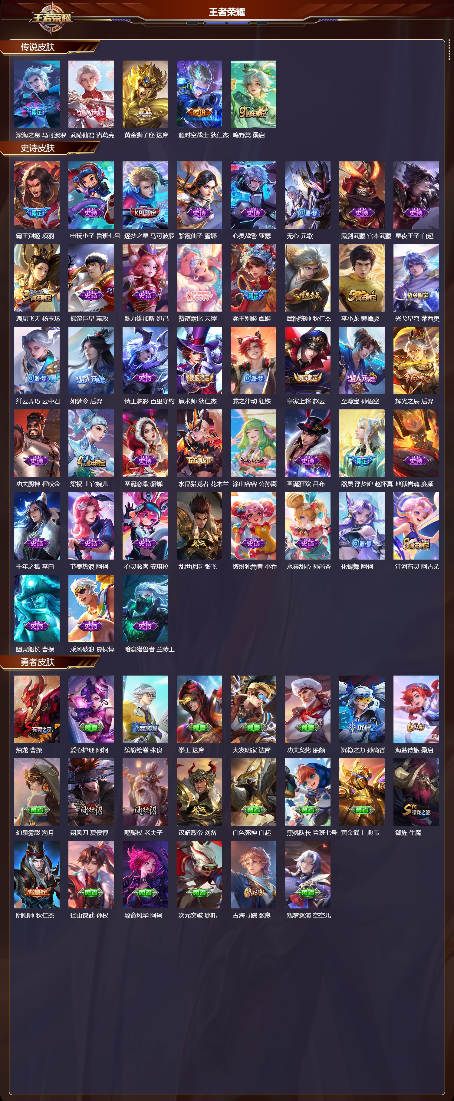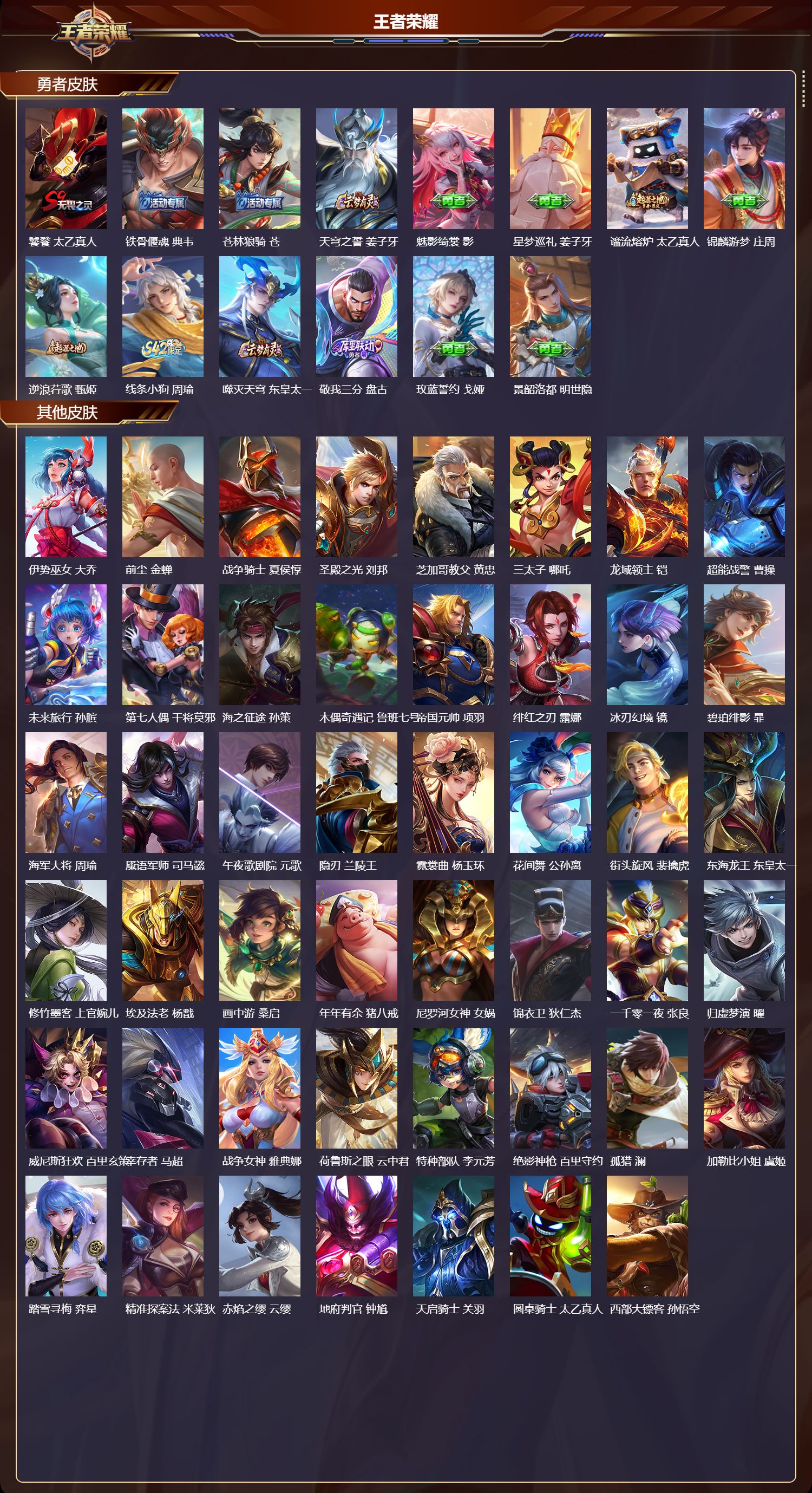 苹果qq/至尊星耀/200皮肤/127英雄/0典藏/0珍品无双/0无双/0珍品传说/5传说/43史诗/8稀有英雄【5 传说皮肤】深海之息 马可波罗武陵仙君 诸葛亮黄金狮子座 达摩超时空战士 狄仁杰鸣野蒿 桑启【43 史诗皮肤】霸王别姬 项羽电玩小子 鲁班七号逐梦之星 马可波罗紫霞仙子 露娜心灵战警 亚瑟无心 元歌鬼剑武藏 宫本武藏星夜王子 白起遇见飞天