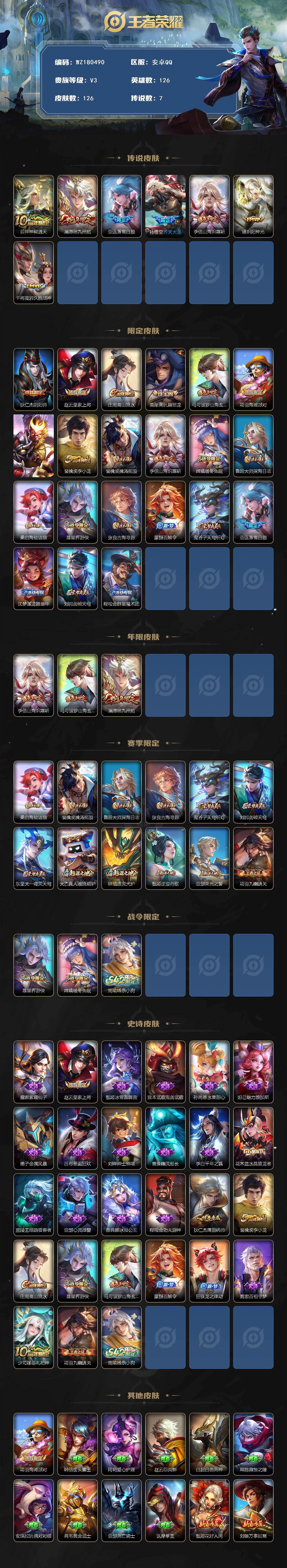 【wz180490】安卓q-v3-永恒钻石iii段位-126英雄-126皮肤-7传说-26史诗 【传说皮肤】:后羿神树通天,澜愿照九州拓,亚连落雪白狼,孙悟空齐天大圣,李信山海炽霜斩,镜炽阳神光,干将莫邪久胜战神 【限定皮肤】:狄仁杰阴阳师,赵云皇家上将,庄周高山流水,高渐离玩趣恶龙,马可波罗山海玄木吟,项羽海滩派对,孙悟空齐天大圣,裴擒虎李小龙,裴擒虎擒涛扼浪,李信山海炽霜斩,嫦娥暖冬兔眠,鲁班大师探海日志,桑启海盐诗旅,暃星界游侠,张良古海寻踪,蒙犽百解令,鬼谷子天穹祈灯,亚连落雪白狼,沈梦溪龙舞盛年,刘邦剑破天穹,程咬金群星魔术团 【年限皮肤】:李信山海炽霜斩,马可波罗山海玄木吟,澜愿照九州拓 【赛季限定】:桑启海盐诗旅,裴擒虎擒涛扼浪,鲁班大师探海日志,张良古海寻踪,鬼谷子天穹祈灯,刘邦剑破天穹,东皇太一噬灭天穹,太乙真人谧流熔炉,钟馗虚灵犬护,甄姬逆浪荇歌,亚瑟荣光之誓,项羽九幽镇关 【战令限定】:暃星界游侠,嫦娥暖冬兔眠,周瑜线条小狗 【史诗皮肤】:露娜紫霞仙子,赵云皇家上将,甄姬冰雪圆舞曲,宫本武藏鬼剑武藏,孙尚香水果甜心,妲己魅力维加斯,墨子金属风暴,吕布圣诞狂欢,刘禅绅士熊喵,曹操幽灵船长,李白千年之狐,花木兰水晶猎龙者,兰陵王暗隐猎兽者,亚瑟心灵战警,雅典娜冰冠公主,程咬金功夫厨神,狄仁杰鹰眼统帅,裴擒虎李小龙,庄周高山流水,暃星界游侠,马可波罗山海玄木吟,蒙犽百解令,狂铁龙之律动,黄忠百相守梦,少司缘巫礼祀神,项羽九幽镇关,周瑜线条小狗 【其他皮肤】:项羽海滩派对,韩信街头霸王,阿轲爱心护理,赵云忍炎影,白起白色死神,扁鹊救世之瞳,安琪拉玩偶对对碰,典韦黄金武士,亚瑟死亡骑士,达摩拳王,甄姬花好人间,刘备万事如意,狄仁杰阴阳师,刘备纽约教父,关羽龙腾万里,钟无艳海滩丽影,狂铁命运角斗场,李白敏锐之力,大乔守护之力,吕布野性能量,高渐离玩趣恶龙,哪吒次元突破,狂铁特工战影,廉颇无尽征程,蒙犽胡桃狂想曲,桑启海盐诗旅,嫦娥暖冬兔眠,猪八戒潮玩探月行,牛魔牛运亨通,白起乐园追猎者,裴擒虎擒涛扼浪,太乙真人劲辣红锅,莱西奥西部游侠,鲁班大师探海日志,姬小满零食大作战,李元芳妄想特派,张良古海寻踪,亚连破局者,后羿完美运算,鬼谷子天穹祈灯,嫦娥漠中幻影,亚瑟鸿运当头,沈梦溪龙舞盛年,钟无艳春野之旅,扁鹊无尽旅途,刘邦剑破天穹,程咬金群星魔术团,东皇太一噬灭天穹,苍苍林狼骑,太乙真人谧流熔炉,典韦铁骨偃魂,西施雪境奇遇,达摩爆裂喵拳,戈娅玫蓝誓约,钟馗虚灵犬护,苏烈春野闲踪,张良灵野札记,阿古朵布丁狗之约,露娜命运加冕,甄姬逆浪荇歌,庄周锦麟游梦,莱西奥踏浪烽翎,鬼谷子克喵,哪吒罗小黑战记,亚瑟荣光之誓,艾琳鹤鸣心笺,蚩奼极光幻客,虞姬溯影追猎,高渐离金属狂潮,项羽帝国元帅,后羿精灵王,李元芳特种部队,夏侯惇战争骑士,苍维京掠夺者,黄忠芝加哥教父,大乔伊势巫女,铠龙域领主,百里守约绝影神呛,明世隐占星师,公孙离花间舞,元歌午夜歌剧院,孙策海之征途,司马懿魇语军师,李信灼热之刃,云中君荷鲁斯之眼,马超幸存者,蒙犽归虚梦演,镜冰刃幻境,澜孤猎,司空震启蛰,云缨赤焰之缨,暃碧珀绯影 【内测皮肤】:高渐离玩趣恶龙,狂铁特工战影 【