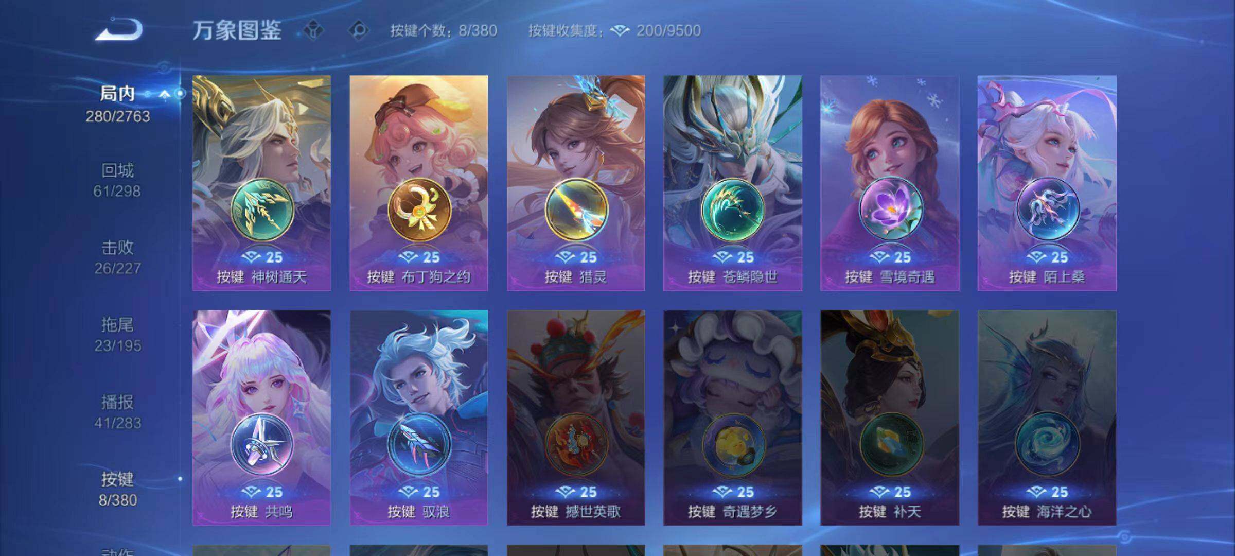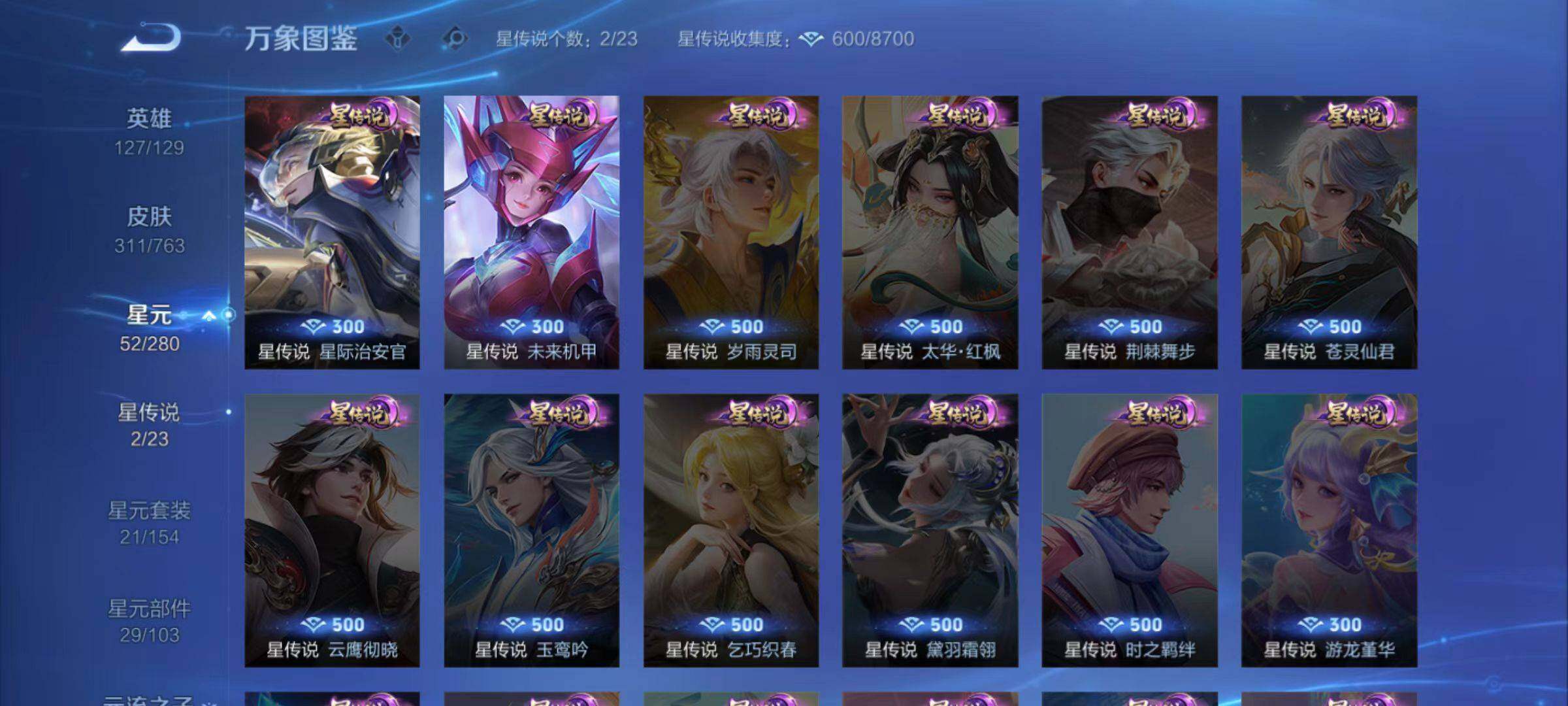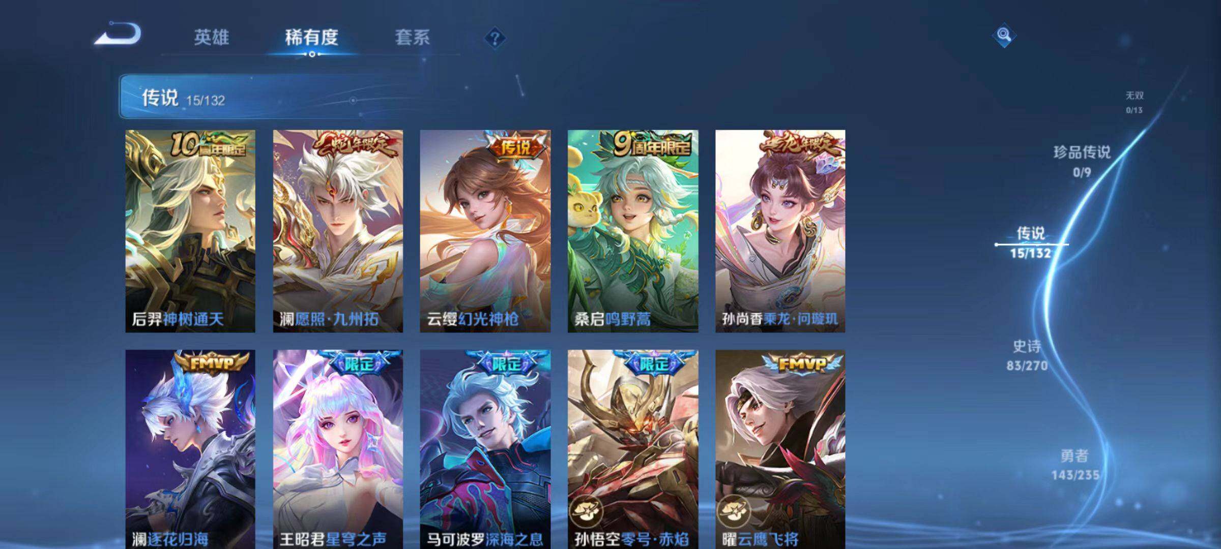 127英雄-311皮肤-安卓q-311皮肤-1典藏皮肤-15传说-82史诗 【英雄全皮】:孙权全皮,空空儿全皮,影全皮 【荣耀典藏】:伽罗最初的交响 【传说皮肤】:后羿神树通天,澜愿照九州拓,云缨幻光神呛,桑启鸣野蒿,孙尚香乘龙问璇玑,澜逐花归海,王昭君星穹之声,马可波罗深海之息,孙悟空零号赤焰,曜云鹰飞将,刘备时之恋人,