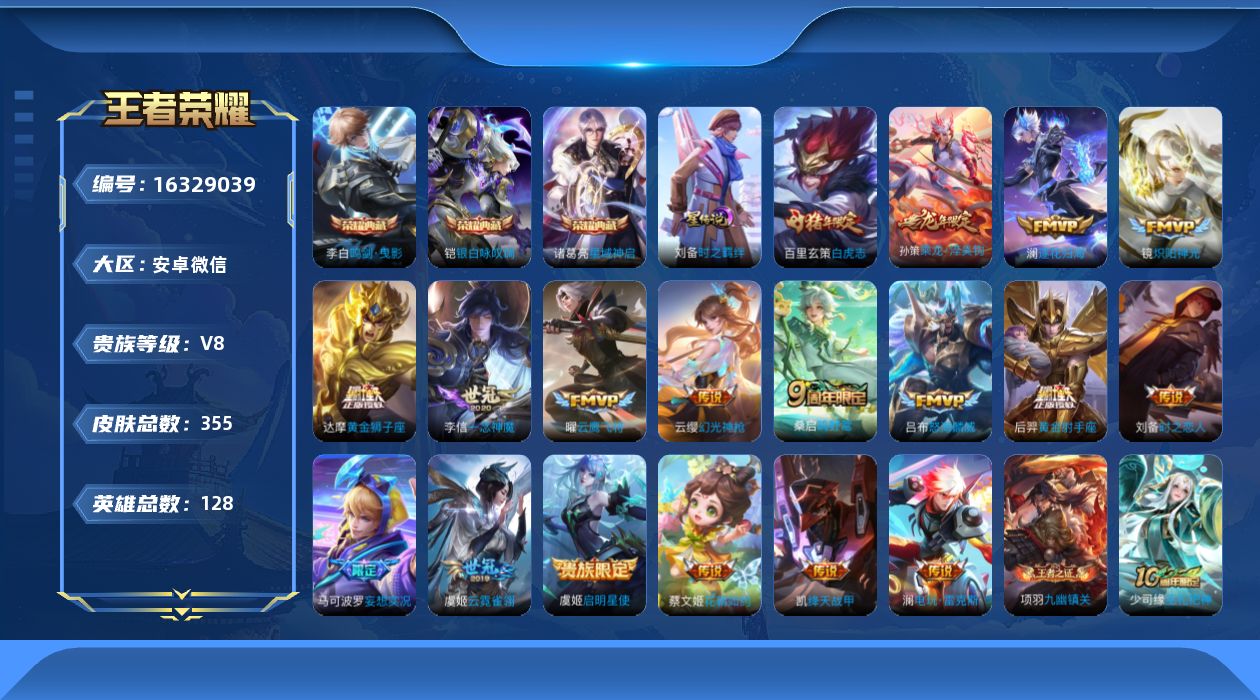 [16329039]安卓wx-v7-至尊星耀iv段位-128英雄-355皮肤-3典藏皮肤-20传说-104史诗-1星传 【英雄全皮】:刘禅全皮,孙权全皮,戈娅全皮,空空儿全皮,影全皮 【荣耀典藏】:李白鸣剑曳影,诸葛亮星域神启,铠银白咏叹调 【传说皮肤】:后羿神树通天,干将莫邪千山共赴,云缨幻光神呛,桑启鸣野蒿,孙策乘龙淬吴钩,澜逐花归海,马可波罗妄想实况,澜电玩雷克斯,吕布怒海麟威,蔡文姬花朝如约,铠绛天战甲,镜炽阳神光,虞姬启明星使,曜云鹰飞将,李信一念神魔,刘备时之恋人,虞姬云霓雀翎,达摩黄金狮子座,百里玄策白虎志,后羿黄金射手座 【限定皮肤】:蔡文姬夏日便利店,大乔绒语心约,虞姬夏日便利店,姜子牙天穹之誓,杨戬破阵退雄兵,狄仁杰阴阳师,赵云皇家上将,赵云引擎之心,扁鹊奇幻香踪,芈月幻夜卜梦,周瑜赤莲之焰,元歌云间偶戏,甄姬幽恒,典韦岱宗,马可波罗暗影游猎,马可波罗妄想实况,狄仁杰魔术师,项羽海滩派对,兰陵王金庭之子,花木兰瑞麟志,孙悟空至尊宝,李元芳匿光侦查者,李元芳云中旅人,虞姬启明星使,杨戬潮玩骑兵,干将莫邪胡桃夹子,雅典娜单词大作战,百里玄策白虎志,百里玄策原初追逐者,沈梦溪大漠名商,裴擒虎擒涛扼浪,狂铁电玩高手,米莱狄胡桃异想国,云中君纤云弄巧,猪八戒猪悟能,上官婉儿梁祝,嫦娥拒霜思,嫦娥暖冬兔眠,西施玲珑珍味,鲁班大师探海日志,桑启海盐诗旅,暃星界游侠,戈娅驭风魔法,艾琳流音漫舞,司空震地狱燃心,阿古朵江河有灵,张良古海寻踪,蒙犽百解令,蒙恬荣光圣徽,高渐离燃音魔法,妲己灵卜魔法,鬼谷子天穹祈灯,伽罗琥珀纪元,孙策乘龙淬吴钩,沈梦溪龙舞盛年,鲁班七号蔬乡物语,李元芳蔬乡物语,刘邦剑破天穹,程咬金群星魔术团,关羽决胜骁骑,镜青焰无极,项羽苍威无极,刘备异域游侠,周瑜熔金海岸 【年限皮肤】:百里玄策白虎志,花木兰瑞麟志,甄姬幽恒,典韦岱宗,孙策乘龙淬吴钩 【赛季限定】:兰陵王金庭之子,张良古海寻踪,李元芳云中旅人,百里玄策原初追逐者,沈梦溪大漠名商,裴擒虎擒涛扼浪,鲁班大师探海日志,桑启海盐诗旅,鬼谷子天穹祈灯,蒙恬荣光圣徽,刘邦剑破天穹,姜子牙天穹之誓 【战令限定】:蔡文姬夏日便利店,虞姬夏日便利店,扁鹊奇幻香踪,芈月幻夜卜梦,周瑜赤莲之焰,元歌云间偶戏,马可波罗暗影游猎,艾琳流音漫舞,杨戬潮玩骑兵,雅典娜单词大作战,狂铁电玩高手,米莱狄胡桃异想国,嫦娥暖冬兔眠,西施
