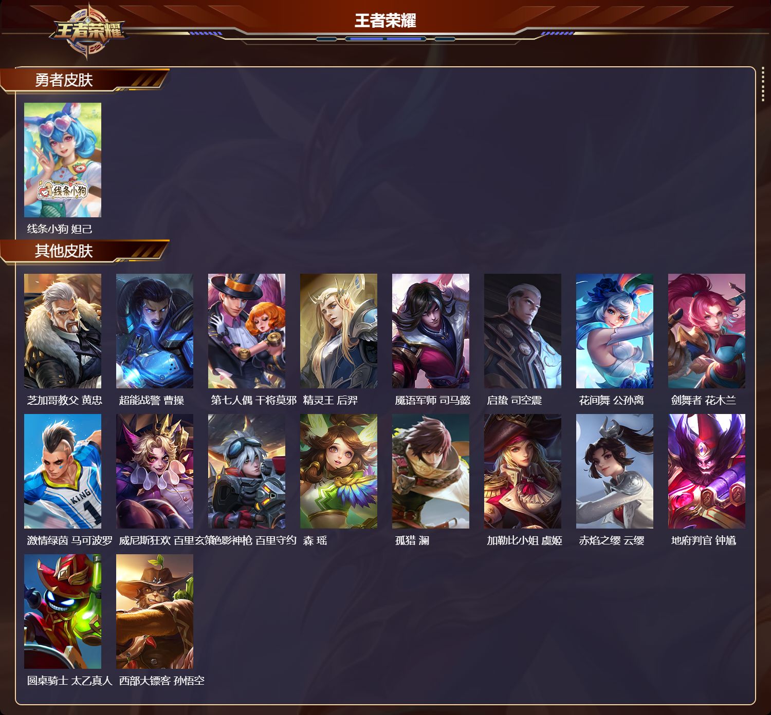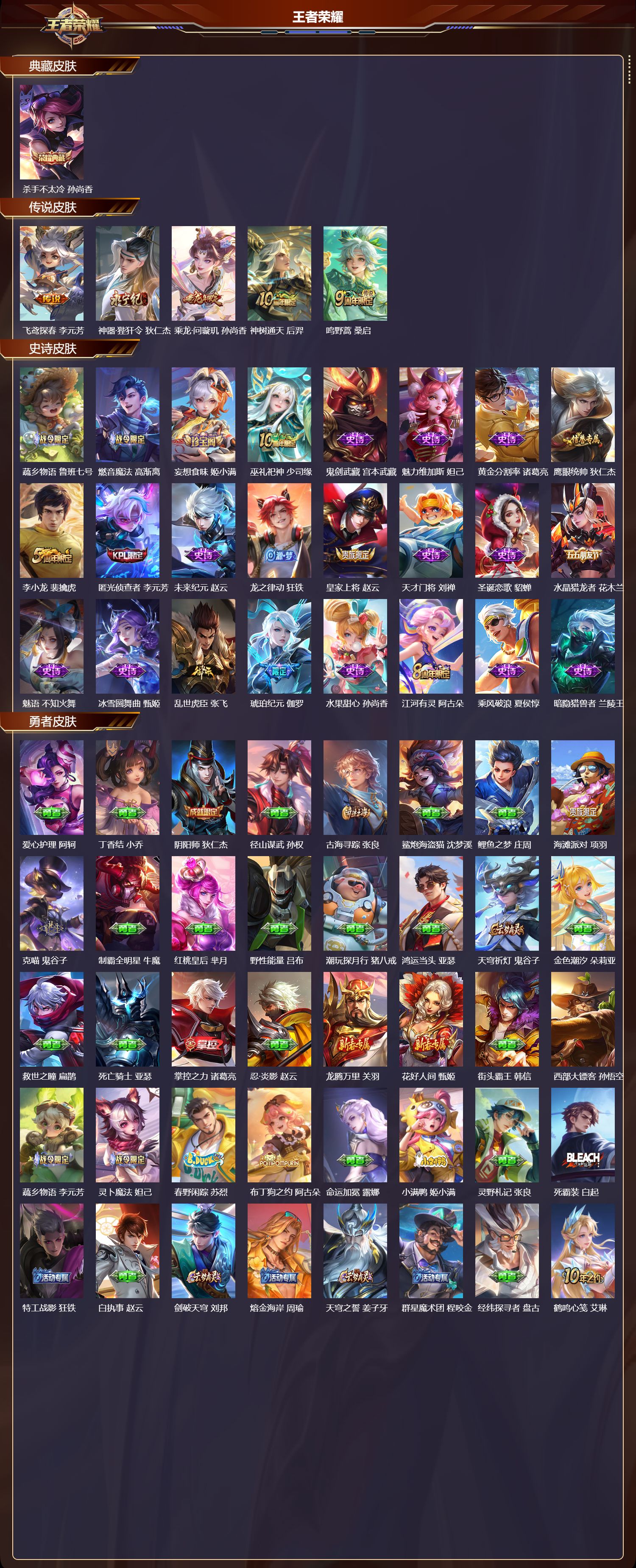 苹果qq/至尊星耀/88皮肤/124英雄/1典藏/0珍品无双/0无双/0珍品传说/5传说/24史诗/7稀有英雄【1 典藏皮肤】杀手不太冷 孙尚香【5 传说皮肤】飞鸢探春 李元芳神器·狴犴令 狄仁杰乘龙·问璇玑 孙尚香神树通天 后羿鸣野蒿 桑启【24 史诗皮肤】蔬乡物语 鲁班七号燃音魔法 高渐离妄想食味 姬小满巫礼祀神 少司缘鬼剑武藏 宫本武藏魅力维加斯 妲己黄金分割率 诸葛