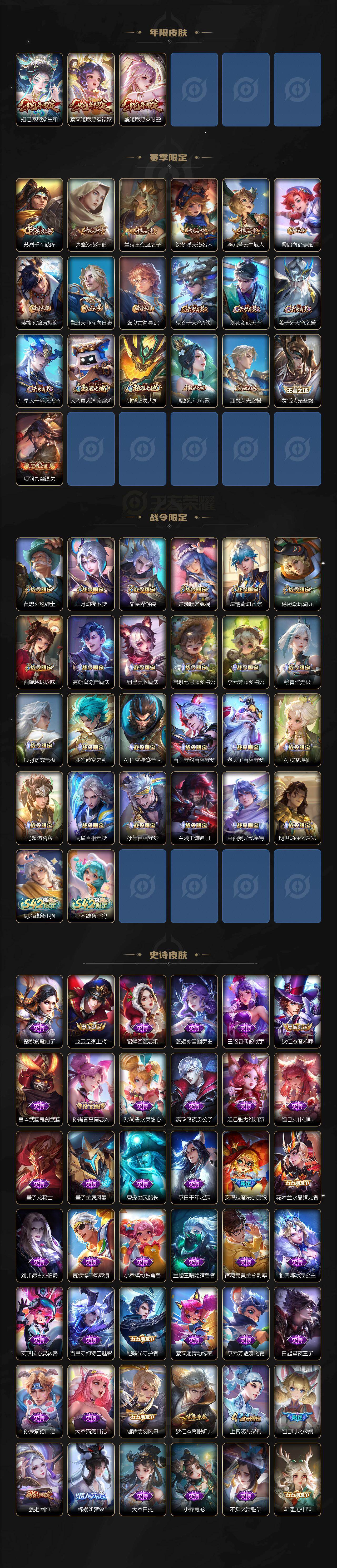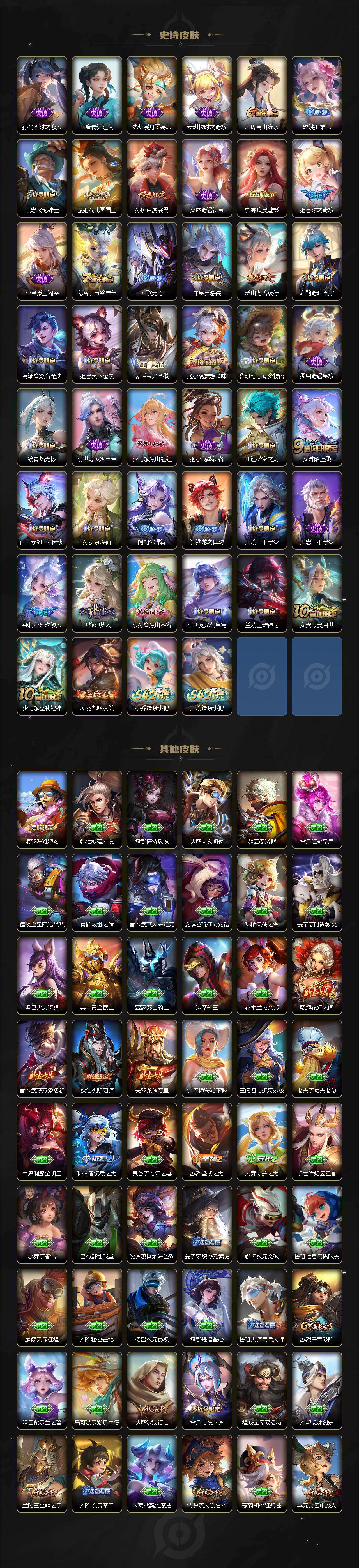 127英雄-302皮肤-贵族8/皮肤302/典藏1/传说16/史诗86/英雄127/朵莉亚全皮/嫦娥全皮/桑启全皮/空空儿全皮/影全皮/少司缘全皮/天鹅之梦 小乔/真我赫兹 瑶/时之魔女 小乔/器灵·落星盏 嫦娥/大耳狗之梦 瑶/神树通天 后羿/续相思 西施/愿照·千秋盛 女娲/愿照·众生和 妲己/愿照·福禄聚 蔡文姬/愿照·岁时盈 虞姬/鸣野蒿 桑启/心动手记 朵莉亚/乘龙·问璇玑 孙尚香/追逃游戏 安琪拉/山海·