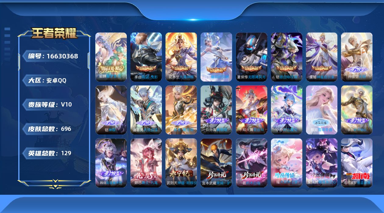[16630368]可二次【特价出售/店主推荐/2省标/6市标/w战孙悟空/1.1w亚连/51段对抗/42段打野/34段发育/33段游走/30段中路】安卓q-v10-最强王者段位-129英雄-696皮肤-6典藏皮肤-1典藏英雄-1珍品无双-6星元-12无双-8珍品传说-123传说-232史诗 【英雄全皮】:墨子全皮,嬴政全皮,刘禅全皮,高渐离全皮,钟无艳全皮,孙膑全皮,扁鹊全皮,白起全皮,元歌全皮,夏侯惇全皮,典韦全皮,宫本武藏全皮,李白全皮,狄仁杰全皮,达摩全皮,项羽全皮,司马懿全皮,安琪拉全皮,露娜全皮,姜子牙全皮,刘邦全皮,孙权全皮,王昭君全皮,花木兰全皮,不知火舞全皮,朵莉亚全皮,娜可露露全皮,橘右京全皮,牛魔全皮,后羿全皮,刘备全皮,李元芳全皮,虞姬全皮,钟馗全皮,女娲全皮,哪吒全皮,雅典娜全皮,太乙真人全皮,鬼谷子全皮,大乔全皮,黄忠全皮,铠全皮,百里玄策全皮,弈星全皮,公孙离全皮,沈梦溪全皮,裴擒虎全皮,狂铁全皮,米莱狄全皮,李信全皮,伽罗全皮,盾山全皮,孙策全皮,上官婉儿全皮,亚连全皮,嫦娥全皮,大司命全皮,马超全皮,海月全皮,曜全皮,蒙犽全皮,蒙恬全皮,澜全皮,阿古朵全皮,桑启全皮,夏洛特全皮,司空震全皮,云缨全皮,金蝉全皮,暃全皮,赵怀真全皮,戈娅全皮,空空儿全皮,影全皮,海诺全皮,姬小满全皮,少司缘全皮 【荣耀典藏】:武则天英雄,夏侯惇无限飓风号,李白鸣剑曳影,花木兰九霄神辉,铠银白咏叹调,虞姬神鉴启示录,伽罗最初的交响 【珍品无双】:貂蝉馥梦繁花 【无双皮肤】:武则天神器明辉仪,妲己青丘九尾,李白碎月剑心,小乔时之魔女,韩信群星魔术团,不知火舞花合斗,公孙离离恨烟,甄姬雪境奇遇,曜器灵螭龙剑,诸葛亮天机白泽,铠神罪,孙悟空无相 【珍品传说】:马可波罗怪盗基德,鲁班七号江户川柯南,孙策时之奇旅,嫦娥器灵落星盏,瑶大耳狗之梦,安琪拉酷洛米之心,暃朽木白哉,宫本武藏黑崎一护 【传说皮肤】:王昭君长夜焕生,后羿神树通天,元歌诡秘之主,大司命死亡执政官,司马懿九山相柳,公孙离云诺千山,西施续相思,杨玉环星之鸣奏,后羿千劫归真,司空震愿照山河定,女娲愿照千秋盛,妲己愿照众生和,澜愿照九州拓,蔡文姬愿照福禄聚,虞姬愿照岁时盈,云缨幻光神呛,裴擒虎祥瑞亨通,嬴政玄雷天君,王昭君映山客,桑启鸣野蒿,庄周牧神诗旅,夏侯惇霜北刀,铠冥王哈迪斯,朵莉亚心动手记,云中君群星魔术团,墨子