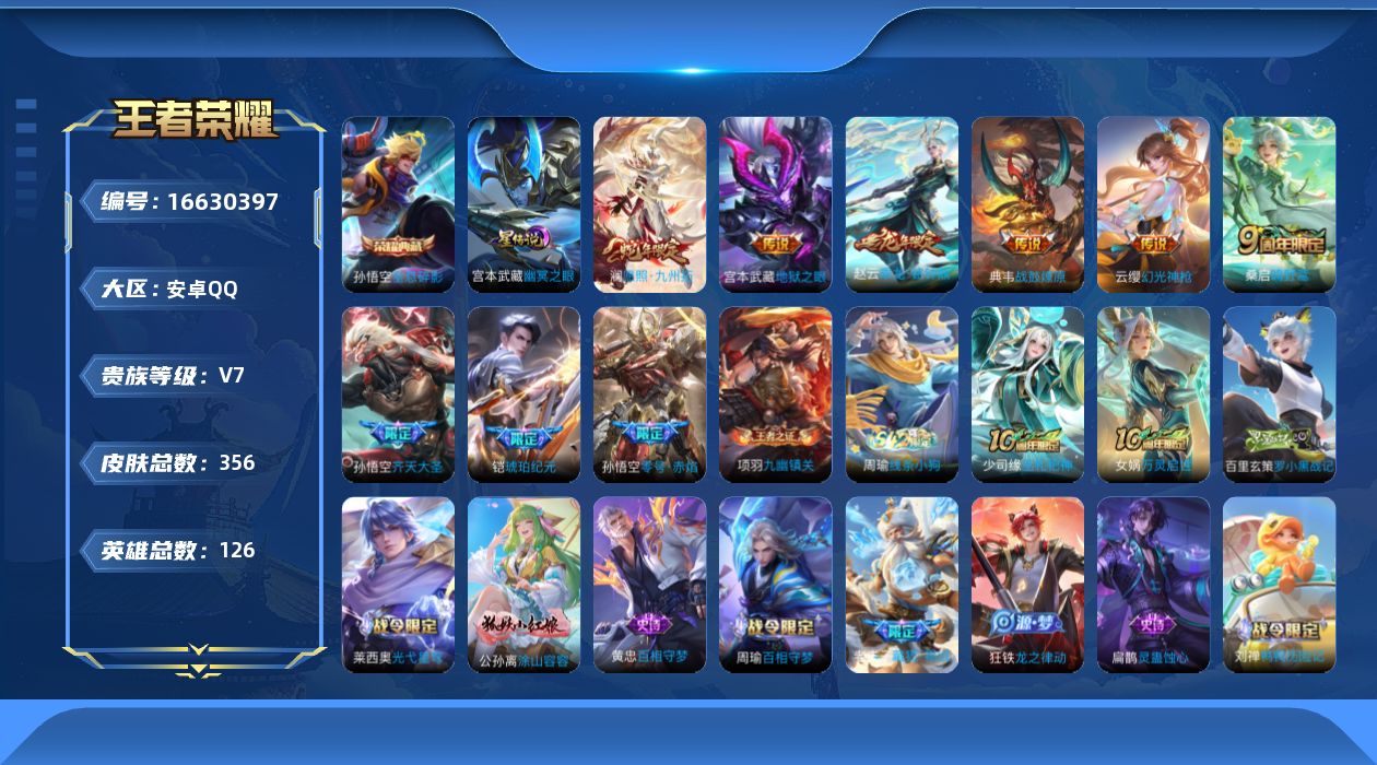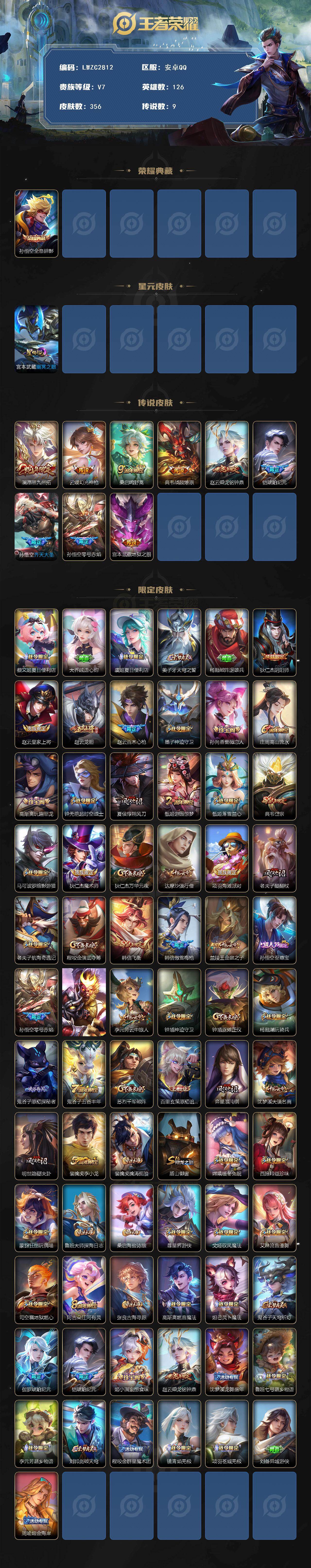[16630397]【店主推荐捡漏号!可直接换绑】安卓q-v7-永恒钻石i段位-126英雄-356皮肤-1典藏皮肤-9传说-85史诗-1星元 【英雄全皮】:孙权全皮,空空儿全皮,影全皮 【荣耀典藏】:孙悟空全息碎影 【传说皮肤】:澜愿照九州拓,云缨幻光神呛,桑启鸣野蒿,典韦战鼓燎原,赵云乘龙铭钟鼎,铠琥珀纪元,孙悟空齐天大圣,孙悟空零号赤焰,宫本武藏地狱之眼 【限定皮肤】:蔡文姬夏日便利店,大乔绒语心约,虞姬夏日便利店,姜子牙天穹之誓,杨戬破阵退雄兵,狄仁杰阴阳师,赵云皇家上将,赵云龙胆,赵云百木心呛,墨子神迹守卫,孙尚香蔷薇恋人,庄周高山流水,高渐离玩趣恶龙,钟无艳超时空战士,夏侯惇朔风刀,甄姬游园惊梦,甄姬落雪兰心,典韦岱宗,马可波罗暗影游猎,狄仁杰魔术师,狄仁杰万华元夜,达摩沙漠行僧,项羽海滩派对,老夫子醍醐杖,老夫子航海奇遇记,程咬金演武夺筹,韩信飞衡,韩信傲雪梅呛,兰陵王金庭之子,孙悟空至尊宝,孙悟空零号赤焰,孙悟空齐天大圣,李元芳云中旅人,钟馗神迹守卫,钟馗驱傩正仪,杨戬潮玩骑兵,鬼谷子原初探秘者,鬼谷子五谷丰年,苏烈千军破阵,百里玄策原初追逐者,弈星混沌棋,沈梦溪大漠名商,明世隐疑决卦,裴擒虎李小龙,裴擒虎擒涛扼浪,盾山御銮,嫦娥暖冬兔眠,西施玲珑珍味,蒙犽狂想玩偶喵,鲁班大师探海日志,桑启海盐诗旅,暃星界游侠,戈娅驭风魔法,艾琳流音漫舞,司空震地狱燃心,阿古朵江河有灵,张良古海寻踪,高渐离燃音魔法,妲己灵卜魔法,鬼谷子天穹祈灯,伽罗琥珀纪元,铠琥珀纪元,姬小满妄想食味,赵云乘龙铭钟鼎,沈梦溪龙舞盛年,鲁班七号蔬乡物语,李元芳蔬乡物语,刘邦剑破天穹,程咬金群星魔术团,镜青焰无极,项羽苍威无极,刘备异域游侠,周瑜熔金海岸 【年限皮肤】:典韦岱宗,韩信飞衡,赵云乘龙铭钟鼎,澜愿照九州拓 【赛季限定】:盾山御銮,夏侯惇朔风刀,弈星混沌棋,明世隐疑决卦,老夫子醍醐杖,鬼谷子原初探秘者,狄仁杰万华元夜,程咬金演武夺筹,钟馗驱傩正仪,苏烈千军破阵,达摩沙漠行僧,兰陵王金庭之子,沈梦溪大漠名商,李元芳云中旅人,桑启海盐诗旅,裴擒虎擒涛扼浪,鲁班大师探海日志,张良古海寻踪,鬼谷子天穹祈灯,刘邦剑破天穹,姜子牙天穹之誓,东皇太一噬灭天穹,太乙真人谧流熔炉,钟馗虚灵犬护,甄姬逆浪荇歌,亚瑟荣光之誓,百里玄策原初追逐者,牛魔星界战将,项羽九幽镇关 【战令限定】:钟馗神迹守卫,马可波罗暗影游猎