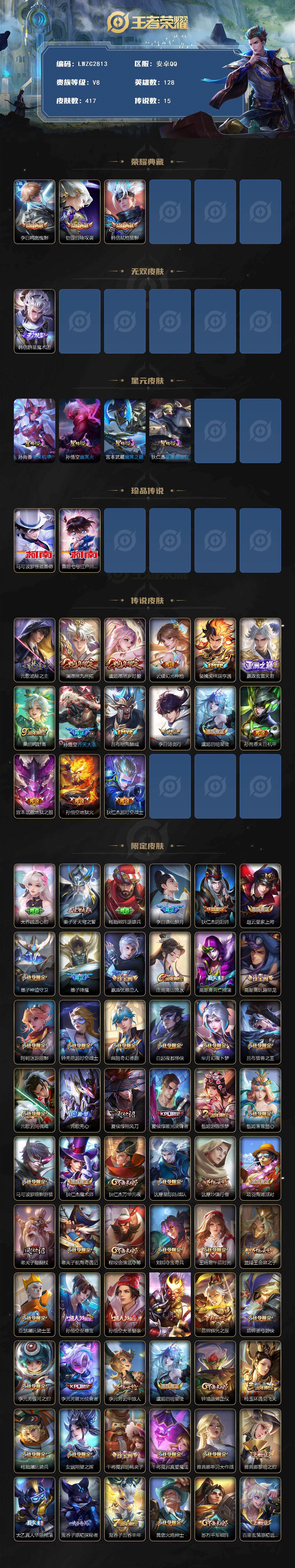 [16630416]【特价急出/详情看图】安卓q-v8-最强王者段位-128英雄-417皮肤-3典藏皮肤-1无双-2珍品传说-4星元-15传说-121史诗 【英雄全皮】:元歌全皮,刘邦全皮,孙权全皮,苍全皮,鬼谷子全皮,蒙恬全皮,戈娅全皮,影全皮 【荣耀典藏】:李白鸣剑曳影,铠银白咏叹调,韩信弑呛猎影 【无双皮肤】:韩信群星魔术团 【珍品传说】:马可波罗怪盗基德,鲁班七号江户川柯南 【传说皮肤】:元歌诡秘之主,澜愿照九州拓,虞姬愿照岁时盈,云缨幻光神呛,裴擒虎祥瑞亨通,嬴政玄雷天君,桑启鸣野蒿,孙悟空齐天大圣,吕布怒海麟威,李白诗剑行,虞姬启明星使,孙尚香末日机甲,宫本武藏地狱之眼,孙悟空地狱火,狄仁杰超时空战士 【限定皮肤】:大乔绒语心约,姜子牙天穹之誓,杨戬破阵退雄兵,李白谪仙醉月,狄仁杰阴阳师,赵云皇家上将,墨子神迹守卫,墨子降魔,嬴政优雅恋人,庄周高山流水,高渐离死亡摇滚,高渐离玩趣恶龙,阿轲迷踪丽影,钟无艳超时空战士,扁鹊奇幻香踪,白起夜都怪侠,芈月幻夜卜梦,吕布猎兽之王,元歌云间偶戏,元歌无心,夏侯惇朔风刀,夏侯惇匿光决锋者,甄姬游园惊梦,甄姬落雪兰心,马可波罗暗影游猎,狄仁杰魔术师,狄仁杰万华元夜,达摩星际陆战队,达摩沙漠行僧,项羽海滩派对,老夫子醍醐杖,老夫子航海奇遇记,程咬金演武夺筹,刘邦夺宝奇兵,王昭君午后时光,兰陵王金庭之子,亚瑟潮玩骑士王,孙悟空至尊宝,孙悟空大圣娶亲,孙悟空齐天大圣,后羿辉光之辰,后羿圣弓游侠,李元芳银河之约,李元芳匿光侦查者,李元芳云中旅人,虞姬启明星使,钟馗驱傩正仪,杨玉环遇见飞天,杨戬潮玩骑兵,女娲朔望之晖,干将莫邪胡桃夹子,干将莫邪真爱魔法,雅典娜单词大作战,雅典娜黎明之约,太乙真人华丽摇滚,鬼谷子原初探秘者,鬼谷子五谷丰年,黄忠火炮绅士,苏烈千军破阵,百里玄策原初追逐者,弈星混沌棋,梦奇顽趣,公孙离玉兔公主,沈梦溪星空之诺,沈梦溪大漠名商,明世隐疑决卦,明世隐吟游魔法,裴擒虎李小龙,裴擒虎擒涛扼浪,狂铁电玩高手,米莱狄胡桃异想国,云中君纤云弄巧,盾山御銮,猪八戒西部大镖客,上官婉儿梁祝,嫦娥拒霜思,嫦娥暖冬兔眠,西施玲珑珍味,蒙犽狂想玩偶喵,鲁班大师探海日志,镜匿光追影者,桑启海盐诗旅,暃星界游侠,戈娅驭风魔法,艾琳流音漫舞,司空震地狱燃心,阿古朵江河有灵,张良古海寻踪,蒙犽百解令,蒙恬荣光圣徽,高渐离燃音魔法,妲己灵卜魔法,鬼谷子