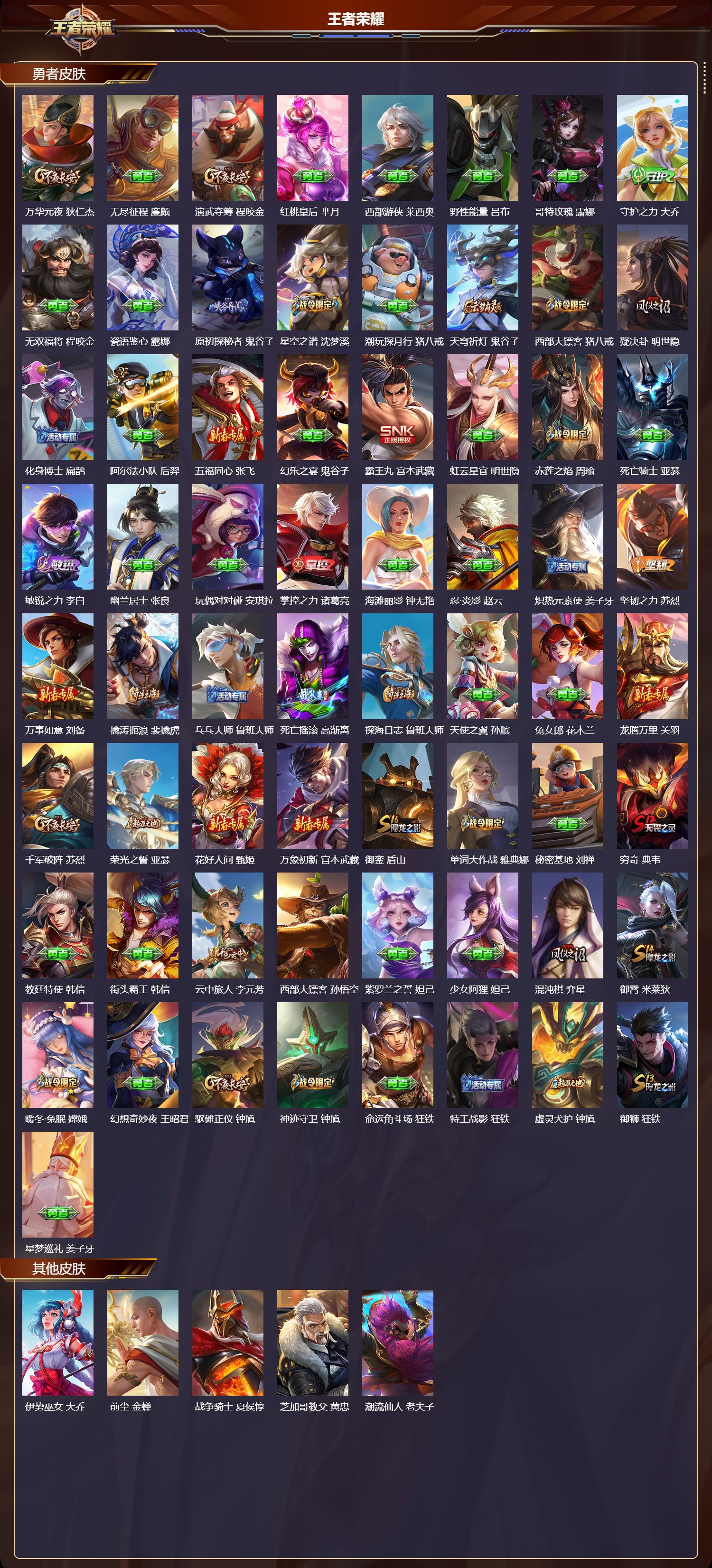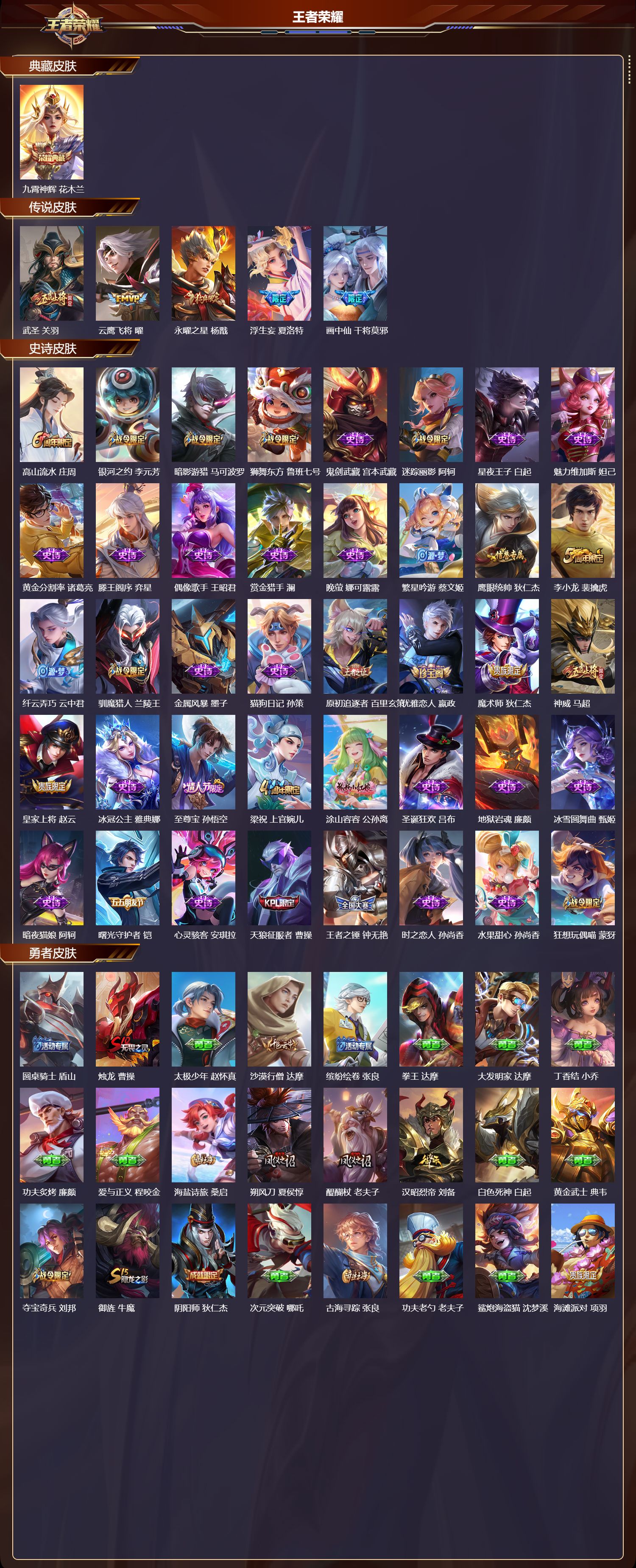 123英雄-183皮肤-安卓qq/永恒钻石/183皮肤/123英雄/1典藏/0珍品无双/0无双/0珍品传说/5传说/40史诗/7稀有英雄【1 典藏皮肤】九霄神辉 花木兰【5 传说皮肤】武圣 关羽云鹰飞将 曜永曜之星 杨戬浮生妄 夏洛特画中仙 干将莫邪【40 史诗皮肤】高山流水 庄周银河之约 李元芳暗影游猎 马可波罗狮舞东方 鲁班七号鬼剑武藏 宫本武藏迷踪丽影 阿轲星夜王子 白起魅力维加斯 妲己