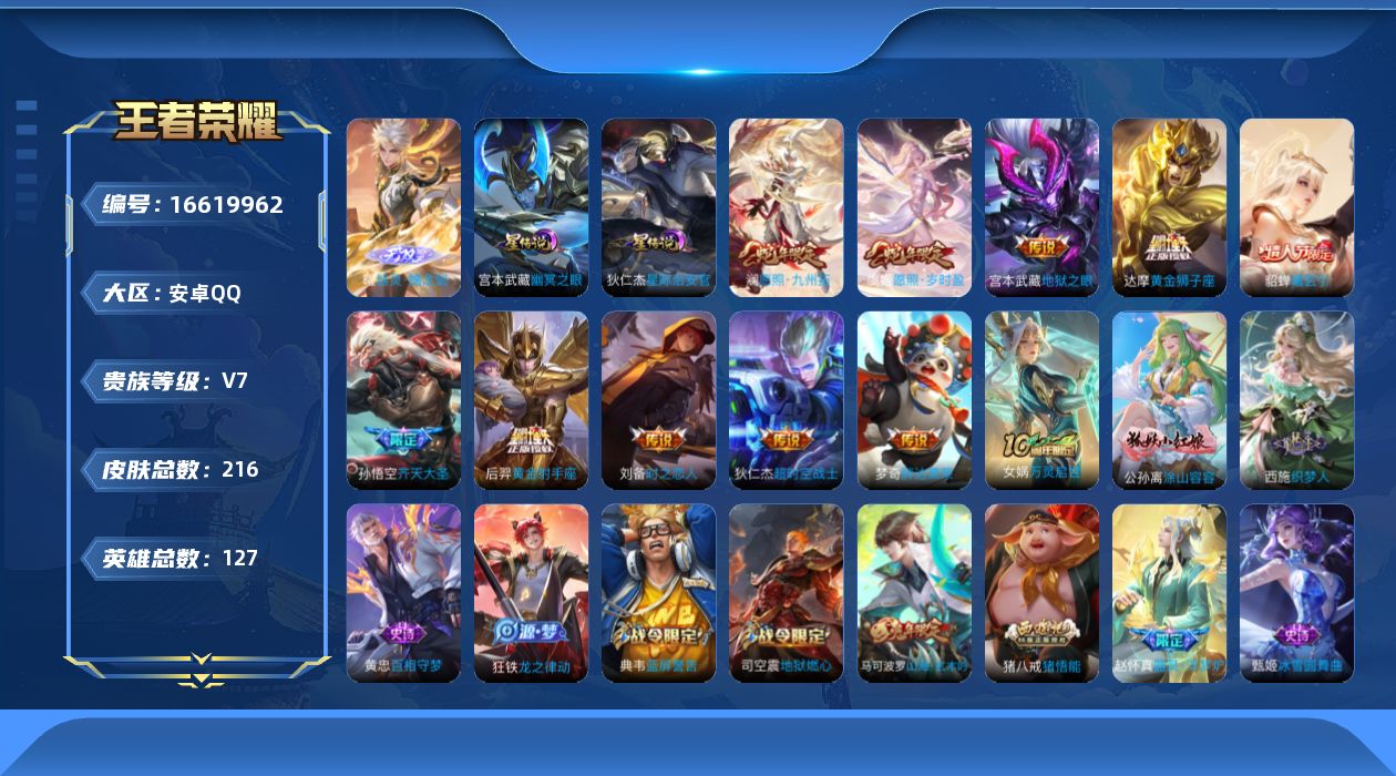 127英雄-216皮肤-【精品号手慢无】2月12号可换绑,贵7,王者印记13,消耗任意点券恢复v7,星币4055,天幕财神纳福,鲜花525,无双皮器灵·螭龙剑,传说皮黄金狮子座黄金射手座地狱之眼胖达荣荣时之恋人-刘备超时空战士-狄仁杰貂蝉曦玄引神树通天..
