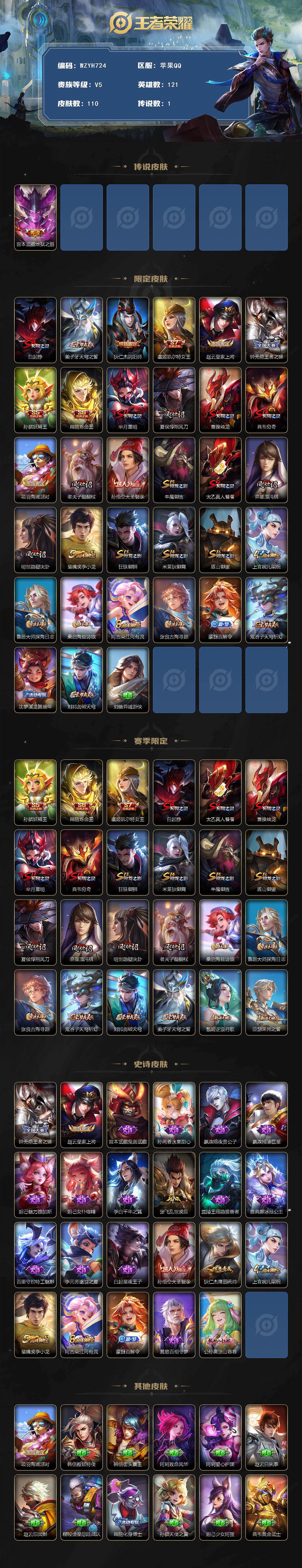 【wzyh724】贵族5/皮肤110/传说1/史诗23/英雄121/宫本武藏地狱之眼/白起狰/姜子牙天穹之誓/狄仁杰阴阳师/虞姬凯尔特女王/赵云皇家上将/钟无艳王者之锤/孙膑妖精王/扁鹊炼金王/芈月重明/夏侯惇朔风刀/曹操烛龙/典韦穷奇/项羽海滩派对/老夫子醍醐杖/孙悟空大圣娶亲/牛魔御旌/太乙真人饕餮/弈星混沌棋/明世隐疑决卦/裴擒虎李小龙/狂铁御狮/米莱狄御霄/盾山御銮/上官婉儿梁祝/鲁班大师探海日志/桑启海盐诗旅/阿古朵江河有灵/张良古海寻踪/蒙犽百解令/鬼谷子天穹祈灯/沈梦溪龙舞盛年/刘邦剑破天穹/刘备异域游侠/甄姬逆浪荇歌/亚瑟荣光之誓/宫本武藏鬼剑武藏/孙尚香水果甜心/嬴政暗夜贵公子/嬴政摇滚巨星/妲己魅力维加斯/妲己女仆咖啡/李白千年之狐/张飞乱世虎臣/兰陵王暗隐猎兽者/雅典娜冰冠公主/百里守约特工魅影/李元芳逐浪之夏/白起星夜王子/狄仁杰鹰眼统帅/黄忠百相守梦/公孙离涂山容容/韩信教廷特使/韩信街头霸王/阿轲致命风华/阿轲爱心护理/赵云白执事/赵云忍炎影/程咬金星际陆战队/扁鹊化身博士/孙膑天使之翼/妲己少女阿狸/典韦黄金武士/亚瑟死亡骑士/达摩拳王/花木兰兔女郎/甄姬花好人间/宫本武藏万象初新/刘备纽约教父/刘备汉昭烈帝/李元芳黑猫爱糖果/关羽龙腾万里/钟无艳海滩丽影/宫本武藏霸王丸/老夫子功夫老勺/鬼谷子幻乐之宴/安琪拉如懿/明世隐虹云星官/张良幽兰居士/沈梦溪鲨炮海盗猫/刘禅秘密基地/程咬金无双福将/猪八戒潮玩探月行/钟无艳聚星闪耀/曹操决胜大满贯/盘古敬我三分/苍苍林狼骑/莱西奥踏浪烽翎/鬼谷子克喵/艾琳鹤鸣心笺/曹操逐霄之志/貂蝉异域舞娘/王昭君精灵公主/曹操超能战警/孙悟空西部大镖客/后羿精灵王/刘禅英喵野望/雅典娜战争女神/马可波罗激情绿茵/苍维京掠夺者/杨戬埃及法老/诸葛亮星航指挥官/公孙离花间舞/元歌午夜歌剧院/司马懿魇语军师/盘古创世神祝/马超幸存者/鲁班大师归虚梦演/澜孤猎/司空震启蛰