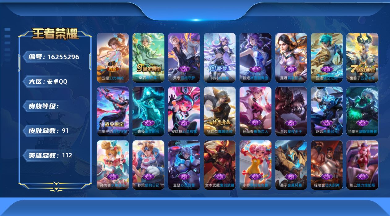 [16255296]hw8661安卓q-vundefined-尊贵铂金i-112英雄-91皮肤-0典藏-0无双-0珍品传说-3传说-21史诗 【稀有英雄】 不知火舞 橘右京 夏洛特 韩信 艾琳 赵云 【传说皮肤】 幻光神呛 神树通天 鸣野蒿 【限定皮肤】 紫霞仙子 【史诗皮肤】 紫霞仙子 心灵战警 五谷丰年 鬼剑武藏 星夜王子 魅力维加斯 鹰眼统帅 金属风暴 猫狗日记 未来纪元 功夫厨神 破空之剑 蔷薇恋人 冰雪圆舞曲 心灵骇客 缤纷独角兽 百相守梦 水果甜心 化蝶舞 幽灵船长 暗隐猎兽者