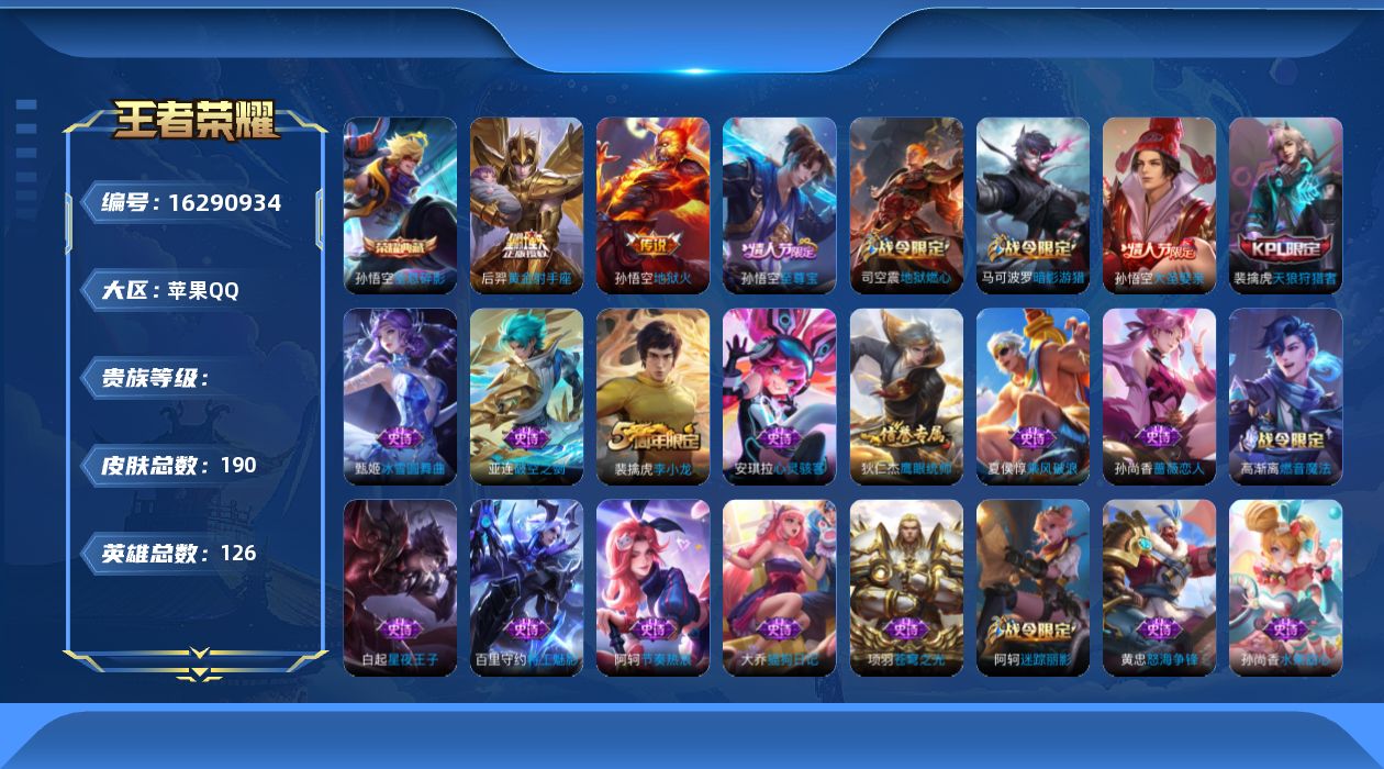 [16290934]hw8754苹果q-vundefined-永恒钻石i-126英雄-190皮肤-1典藏-0无双-0珍品传说-2传说-37史诗 【稀有英雄】 嬴政 不知火舞 橘右京 夏洛特 娜可露露 韩信 艾琳 赵云 【典藏皮肤】 全息碎影 【传说皮肤】 地狱火 黄金射手座 【限定皮肤】 至尊宝 大圣娶亲 暗影游猎 狂想玩偶喵 【史诗皮肤】 蔬乡物语 暗影游猎 燃音魔法 苍穹之光 狮舞东方 猫狗日记 德古拉伯爵 迷踪丽影 星夜王子 怒海争锋 地狱燃心 魅力维加斯