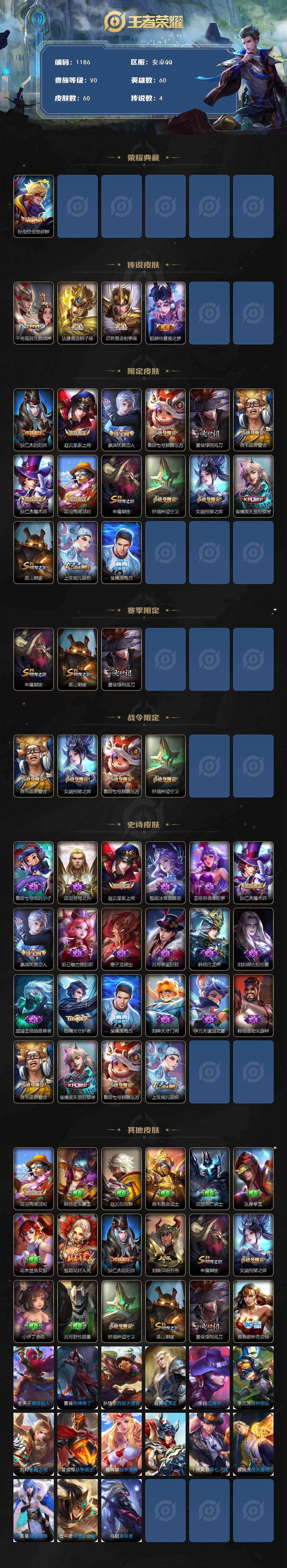 2244904 绝版梅西神奇女侠 安卓q-v7-秩序白银ii段位-60英雄-60皮肤-1典藏皮肤-4传说-22史诗 【荣耀典藏】:孙悟空全息碎影 【传说皮肤】:干将莫邪久胜战神,达摩黄金狮子座,后羿黄金射手座,貂蝉仲夏夜之梦 【限定皮肤】:狄仁杰阴阳师,赵云皇家上将,嬴政优雅恋人,鲁班七号狮舞东方,夏侯惇朔风刀,典韦蓝屏警告,狄仁杰魔术师,项羽海滩派对,牛魔御旌,钟馗神迹守卫,女娲朔望之晖,裴擒虎天狼狩猎者,盾山御銮,上官婉儿梁祝,裴擒虎梅西 【赛季限定】:牛魔御旌,盾山御銮,夏侯惇朔风刀 【战令限定】:典韦蓝屏警告,女娲朔望之晖,鲁班七号狮舞东方,钟馗神迹守卫 【史诗皮肤】:鲁班七号电玩小子,项羽苍穹之光,赵云皇家上将,甄姬冰雪圆舞曲,王昭君偶像歌手,狄仁杰魔术师,嬴政优雅恋人,妲己魅力维加斯,墨子龙骑士,吕布圣诞狂欢,韩信白龙吟,刘邦德古拉伯爵,兰陵王暗隐猎兽者,铠曙光守护者,裴擒虎梅西,刘禅天才门将,李元芳逐浪之夏,程咬金功夫厨神,典韦蓝屏警告,裴擒虎天狼狩猎者,鲁班七号狮舞东方,上官婉儿梁祝 【其他皮肤】:项羽海滩派对,韩信街头霸王,赵云忍炎影,典韦黄金武士,亚瑟死亡骑士,达摩拳王,花木兰兔女郎,甄姬花好人间,狄仁杰阴阳师,刘备汉昭烈帝,牛魔御旌,女娲朔望之晖,小乔丁香结,吕布野性能量,钟馗神迹守卫,盾山御銮,夏侯惇朔风刀,雅典娜神奇女侠,老夫子潮流仙人,曹操死神来了,孙悟空西部大镖客,后羿精灵王,李白范海辛,李元芳特种部队,刘邦圣殿之光,夏侯惇战争骑士,雅典娜战争女神,苍维京掠夺者,干将莫邪第七人偶,裴擒虎街头旋风,弈星踏雪寻梅,云中君荷鲁斯之眼,马超幸存者 【内测皮肤】:嬴政优雅恋人 【