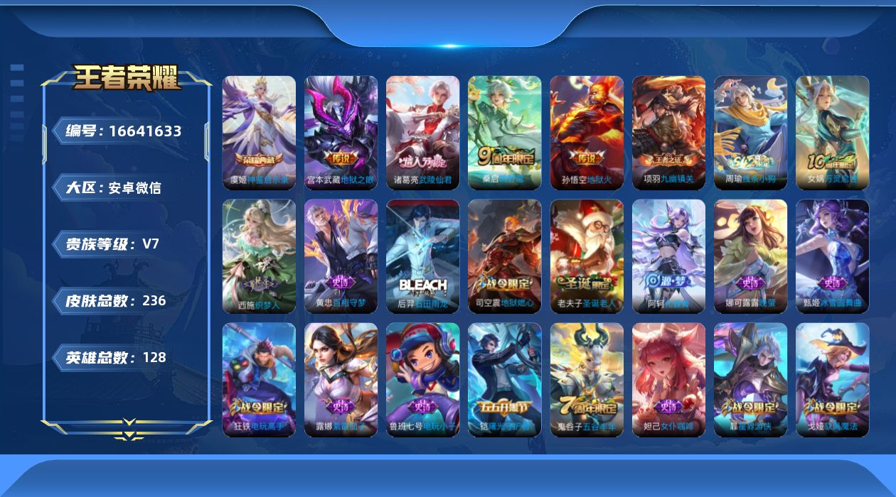 [16641633]v7 1典藏 5传说 128英雄 236皮肤 可修改实名 男号 社交永久限制 【英雄全皮】敖隐全皮大禹全皮 【稀有英雄】敖隐小龙人大司命嬴政始皇帝韩信韩跳跳夏洛特夏师傅艾琳橘右京橘子娜可露露鸟人不知火舞赵云金蝉唐僧戈娅 【荣耀水晶】神鉴启示录 【传说皮】神树通天地狱火地狱之眼 【珍宝阁皮】优雅恋人蔷薇恋人 【赛季/战令皮】噬灭天穹s37古海寻踪s33星界游侠海盐诗旅s30擒涛扼浪s31潮玩骑兵奇幻香踪探海日志s32驭风魔法玲珑珍味流音漫舞顽趣-梦奇地狱燃心剑破天穹s35天穹祈灯s34天穹之誓s36暖冬·兔眠狮心王s3蜃楼王s4妖精王s5炼金王s6凯尔特女王s7狰s8饕餮s9烛龙s10重明s11穷奇s12御狮s13朔风刀s17驱傩正仪s24千军破阵s25圣弓游侠真爱魔法沙漠行僧s26幻夜卜梦吟游魔法夜都怪侠金庭之子s27电玩高手电玩铁子午后时光大漠名商s28云中旅人s29超时空战士-钟无艳落雪兰心 【史诗皮】星界战将百相守梦-黄忠线条小狗-周瑜九幽镇关万灵启世化蝶舞织梦人石田雨龙紫霞仙子电玩小子小书包特工魅影千年之狐江河有灵高渐离燃音魔法蒙恬荣光圣徽晚萤偶像歌手末日机甲-吕布猫狗日记-孙策猫狗日记-大乔乱世虎臣节奏热浪女仆咖啡摇滚巨星水果甜心绅士熊喵天才门将心灵骇客暗隐猎兽者鬼剑武藏心灵战警舞动绿茵缤纷独角兽乘风破浪曙光守护者箭羽风息金属风暴原初追逐者圣诞狂欢圣诞恋歌鹰眼统帅魅力维加斯黎明之约 【限定皮】鸣野蒿武陵仙君小桃花遇见飞天高山流水五谷丰年游园惊梦圣诞老人 【普通皮】谧流熔炉苍林狼骑雪境奇遇-西施劲辣红锅景韶洛都漠中幻影街头霸王龙舞盛年熔金海岸铁骨偃魂玫蓝誓约浪漫序章罗小黑战记-哪吒荣光之誓鹤鸣心笺克喵溯影追猎线条小狗-桑启班班快跑虚灵犬护