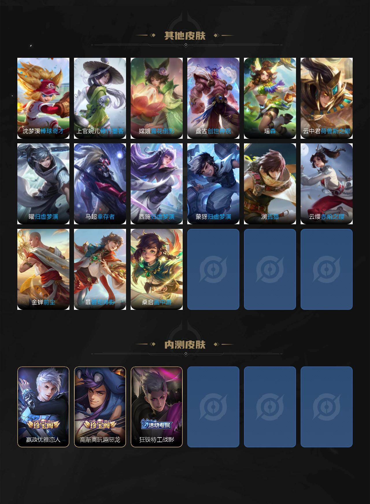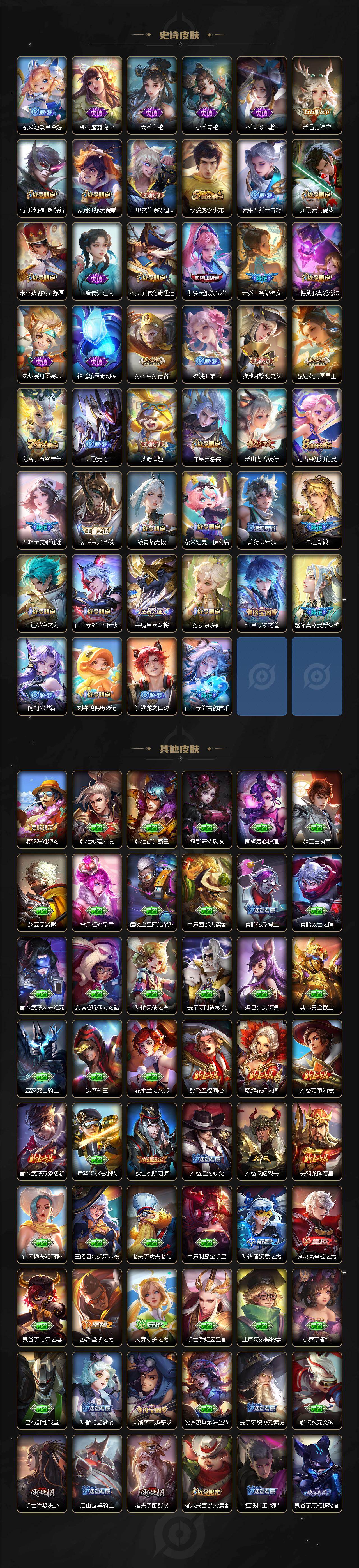 126英雄-273皮肤-【全皮瑶】v8-永恒钻石ii段位-126英雄-273皮肤-1典藏皮肤-2无双-4珍品传说-19传说-76史诗禁榜 【英雄全皮】:瑶全皮,影全皮 【荣耀典藏】:瑶拾光映像 【无双皮肤】:瑶真我赫兹,曜器灵螭龙剑 【珍品传说】:马可波罗怪盗基德,鲁班七号江户川柯南,瑶大耳狗之梦,安琪拉酷洛米之心 【传说皮肤】:公孙离云诺千山,西施续相思,司空震愿照山河定,女娲愿照千秋盛,妲己愿照众生和,澜愿照九州
