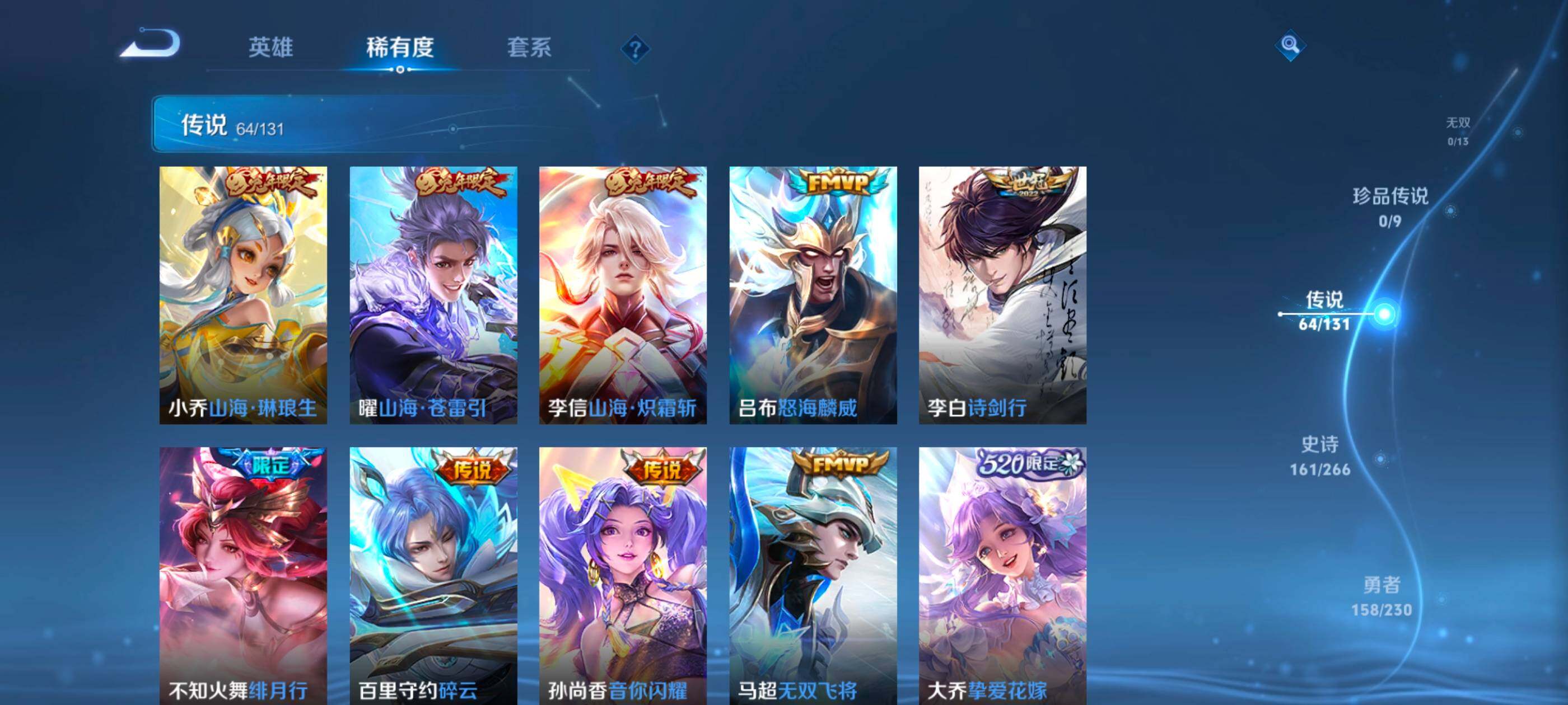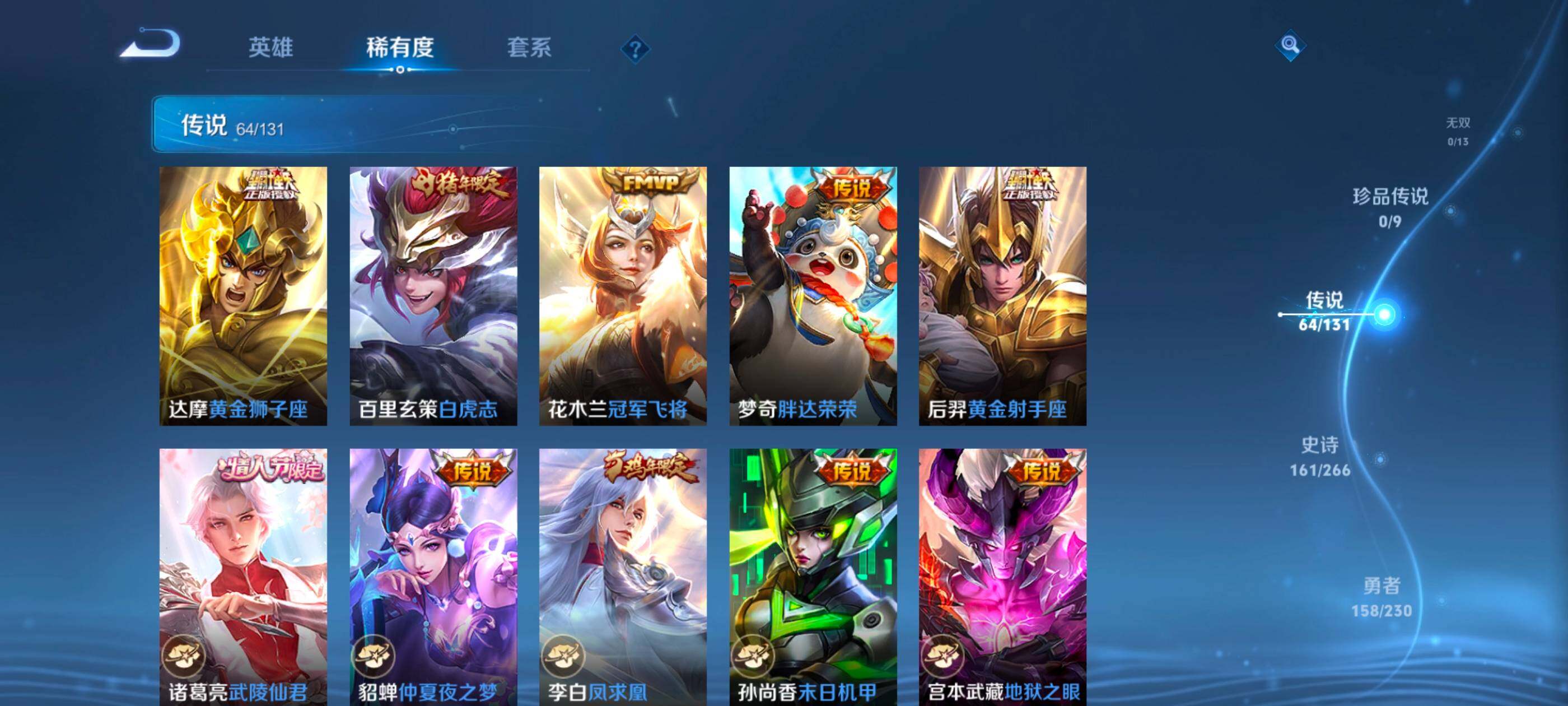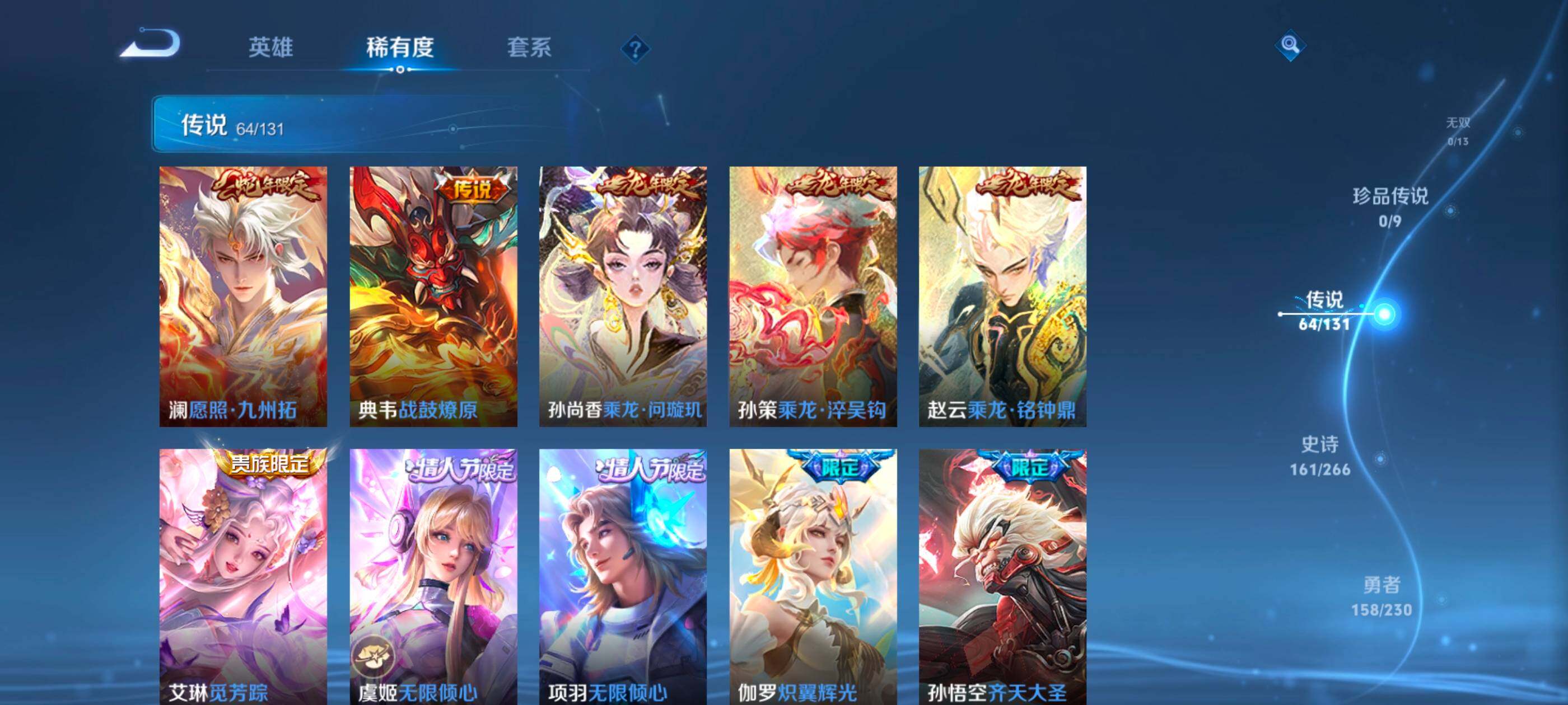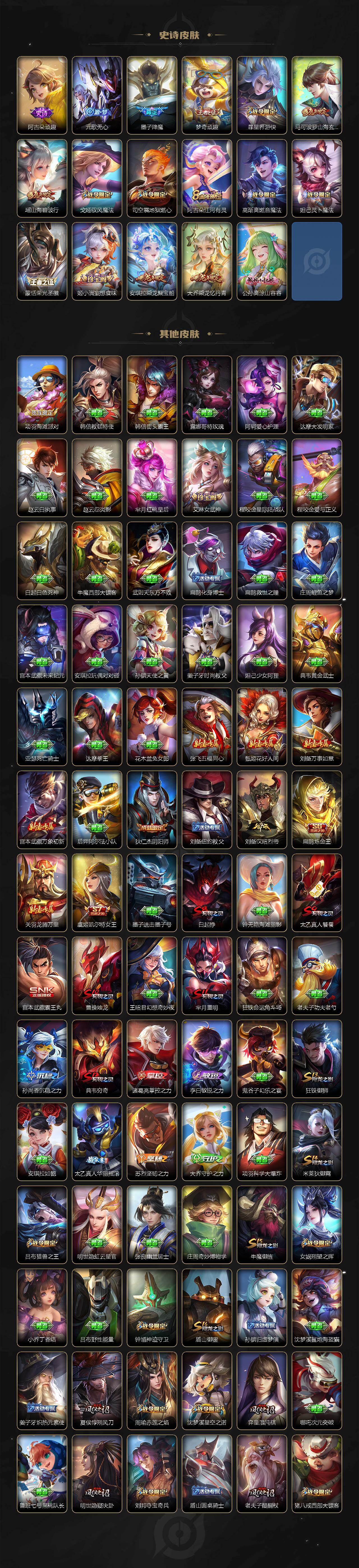 128英雄-467皮肤-安卓q-v10-至尊星耀i段位-128英雄-467皮肤-4典藏皮肤-1典藏英雄-64传说-160史诗 【英雄全皮】:典韦全皮,刘邦全皮,李信全皮,金蝉全皮,影全皮 【荣耀典藏】:武则天英雄,孙悟空全息碎影,小乔天鹅之梦,李白鸣剑曳影,铠银白咏叹调 【传说皮肤】:澜愿照九州拓,典韦战鼓燎原,孙尚香乘龙问璇玑,孙策乘龙淬吴钩,赵云乘龙铭钟鼎,艾琳觅芳踪,虞姬无限倾心,项羽无限倾心,伽罗炽翼辉光,孙