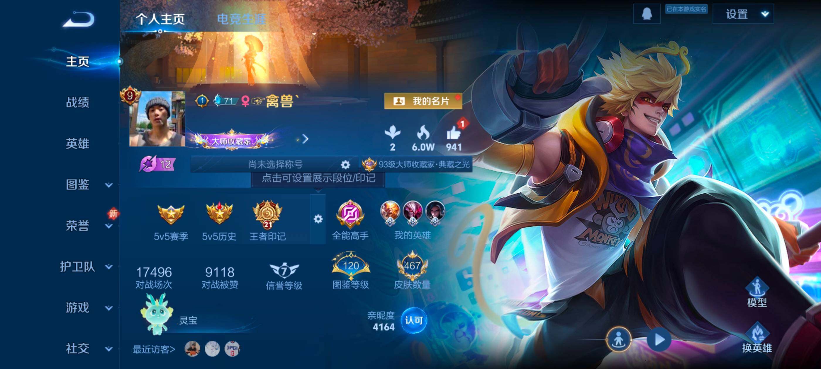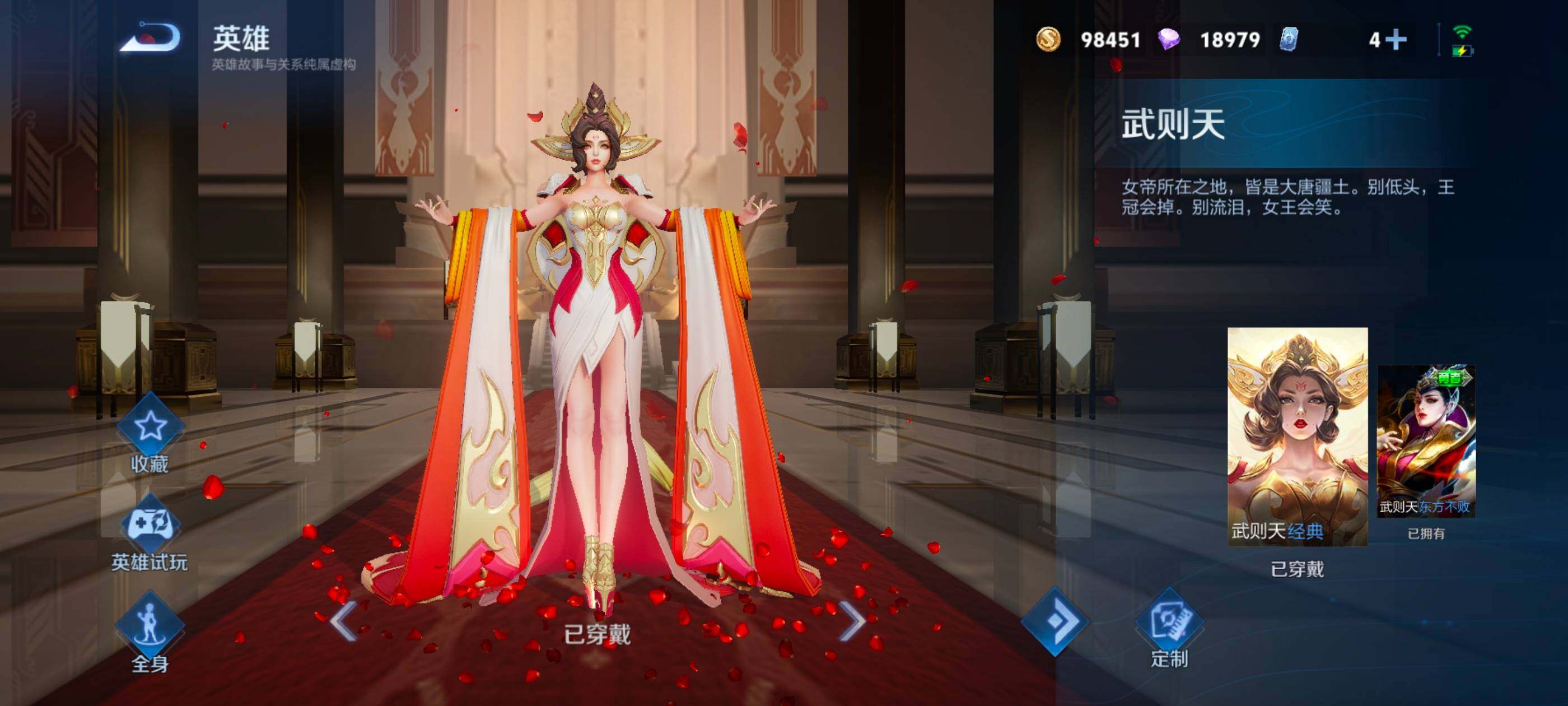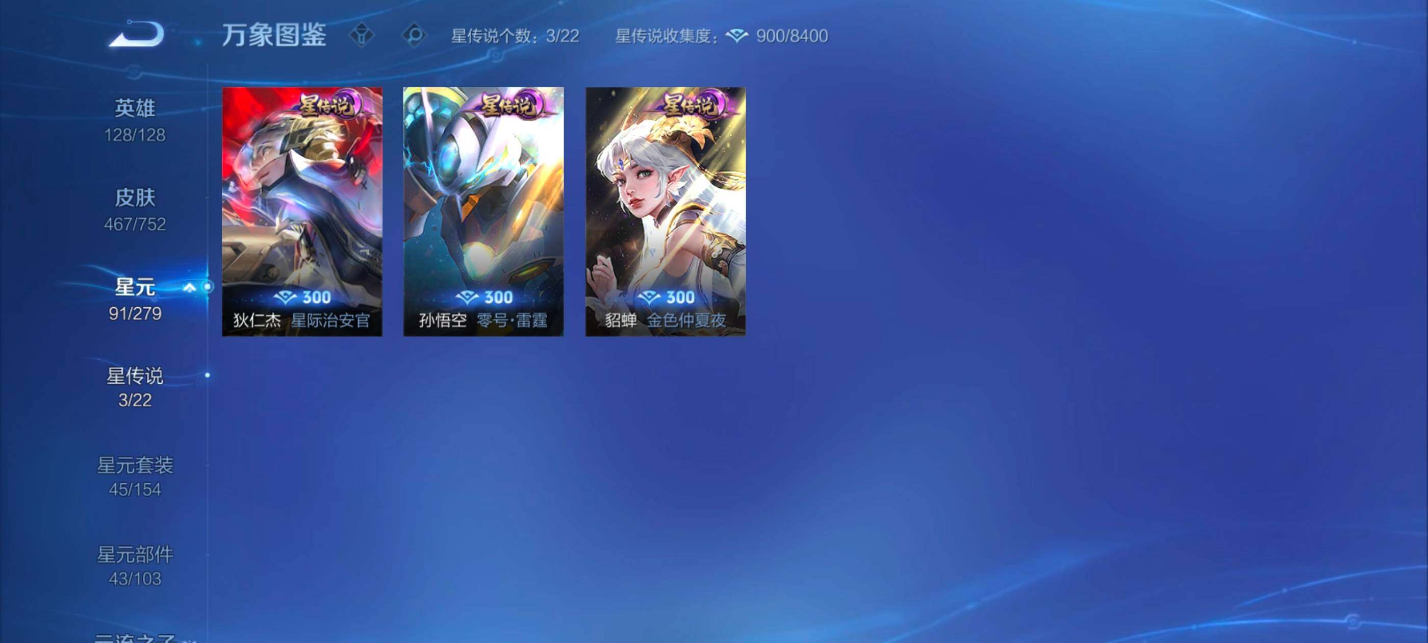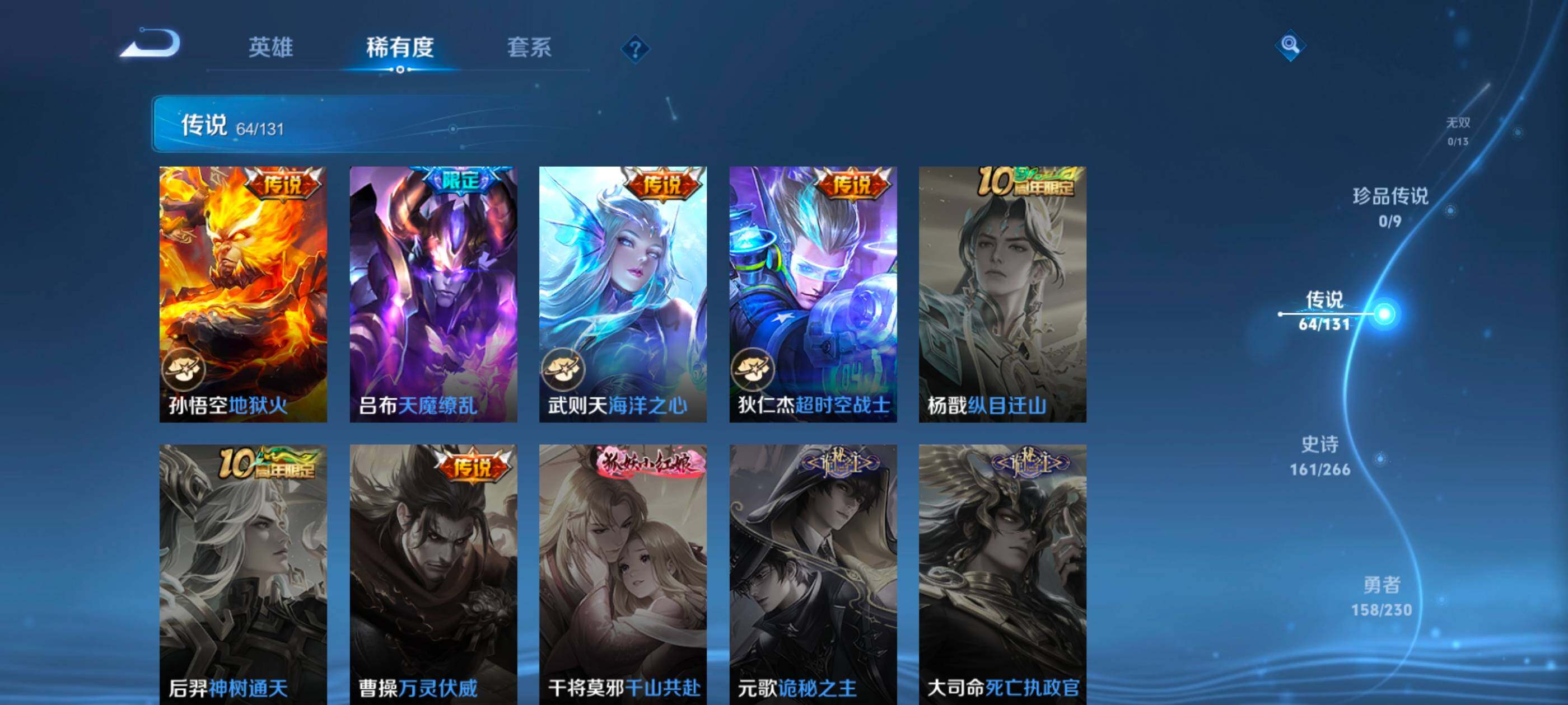 128英雄-467皮肤-安卓q-v10-至尊星耀i段位-128英雄-467皮肤-4典藏皮肤-1典藏英雄-64传说-160史诗 【英雄全皮】:典韦全皮,刘邦全皮,李信全皮,金蝉全皮,影全皮 【荣耀典藏】:武则天英雄,孙悟空全息碎影,小乔天鹅之梦,李白鸣剑曳影,铠银白咏叹调 【传说皮肤】:澜愿照九州拓,典韦战鼓燎原,孙尚香乘龙问璇玑,孙策乘龙淬吴钩,赵云乘龙铭钟鼎,艾琳觅芳踪,虞姬无限倾心,项羽无限倾心,伽罗炽翼辉光,孙
