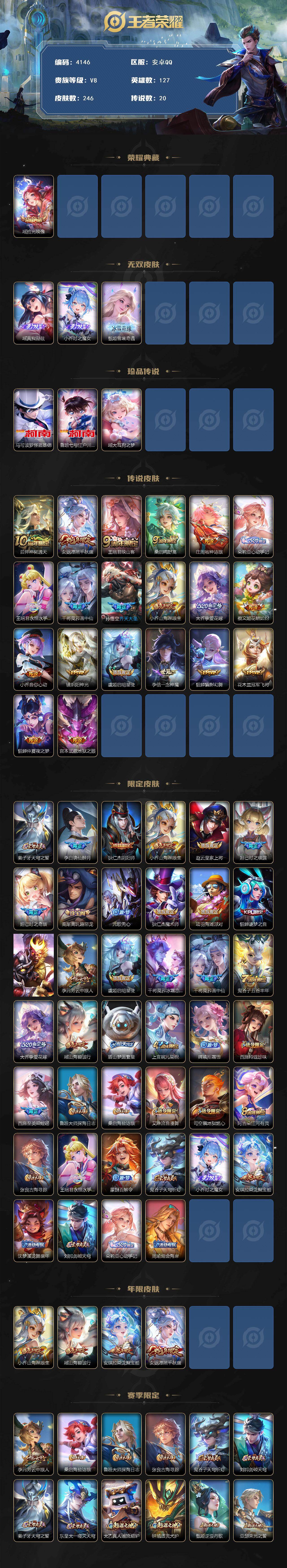 贵族8-贵族积分73968-246皮1典藏20传说3无双3珍品传说-4个英雄全皮 小女号 安卓手q535区246皮1典藏20传说3无双3珍品传说v8
