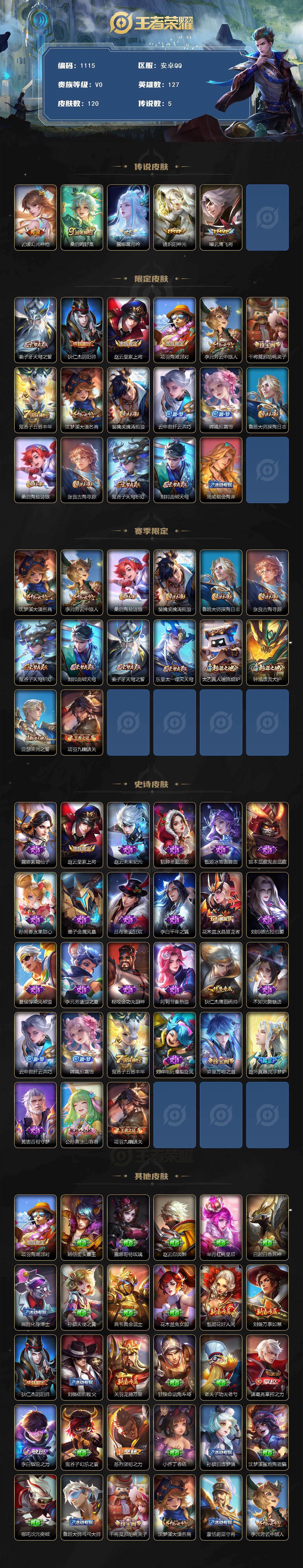 2206745 王者荣耀账号 安卓q-v0-至尊星耀iii段位-127英雄-120皮肤-5传说-27史诗 【英雄全皮】:孙权全皮 【传说皮肤】:云缨幻光神呛,桑启鸣野蒿,露娜霜月吟,镜炽阳神光,曜云鹰飞将 【限定皮肤】:姜子牙天穹之誓,狄仁杰阴阳师,赵云皇家上将,项羽海滩派对,李元芳云中旅人,干将莫邪胡桃夹子,鬼谷子五谷丰年,沈梦溪大漠名商,裴擒虎擒涛扼浪,云中君纤云弄巧,嫦娥拒霜思,鲁班大师探海日志,桑启海盐诗旅,张良古海寻踪,鬼谷子天穹祈灯,刘邦剑破天穹,周瑜熔金海岸 【赛季限定】:沈梦溪大漠名商,李元芳云中旅人,桑启海盐诗旅,裴擒虎擒涛扼浪,鲁班大师探海日志,张良古海寻踪,鬼谷子天穹祈灯,刘邦剑破天穹,姜子牙天穹之誓,东皇太一噬灭天穹,太乙真人谧流熔炉,钟馗虚灵犬护,亚瑟荣光之誓,项羽九幽镇关 【史诗皮肤】:露娜紫霞仙子,赵云皇家上将,赵云未来纪元,貂蝉圣诞恋歌,甄姬冰雪圆舞曲,宫本武藏鬼剑武藏,孙尚香水果甜心,墨子金属风暴,吕布圣诞狂欢,李白千年之狐,花木兰水晶猎龙者,刘邦德古拉伯爵,夏侯惇乘风破浪,李元芳逐浪之夏,程咬金功夫厨神,阿轲节奏热浪,狄仁杰鹰眼统帅,不知火舞魅语,云中君纤云弄巧,嫦娥拒霜思,鬼谷子五谷丰年,刘禅电玩爆裂旋风,弈星万物之道,赵怀真器灵浮梦炉,黄忠百相守梦,公孙离涂山容容,项羽九幽镇关 【其他皮肤】:项羽海滩派对,韩信街头霸王,露娜哥特玫瑰,赵云忍炎影,芈月红桃皇后,白起白色死神,扁鹊化身博士,孙膑天使之翼,典韦黄金武士,花木兰兔女郎,甄姬花好人间,刘备万事如意,狄仁杰阴阳师,刘备纽约教父,关羽龙腾万里,狂铁命运角斗场,老夫子功夫老勺,诸葛亮掌控之力,李白敏锐之力,鬼谷子幻乐之宴,苏烈坚韧之力,小乔丁香结,孙膑归虚梦演,沈梦溪鲨炮海盗猫,哪吒次元突破,鲁班大师乓乓大师,干将莫邪胡桃夹子,沈梦溪大漠名商,蒙恬蔚蓝守将,李元芳云中旅人,桑启海盐诗旅,海月幻泉雾影,猪八戒潮玩探月行,白起乐园追猎者,裴擒虎擒涛扼浪,太乙真人劲辣红锅,鲁班大师探海日志,李元芳妄想特派,张良古海寻踪,后羿完美运算,鬼谷子天穹祈灯,嫦娥漠中幻影,廉颇功夫炙烤,刘邦剑破天穹,姜子牙天穹之誓,周瑜熔金海岸,东皇太一噬灭天穹,干将莫邪雾都夜雨,苍苍林狼骑,太乙真人谧流熔炉,典韦铁骨偃魂,西施雪境奇遇,姜子牙星梦巡礼,少司缘灵卦秘语,戈娅玫蓝誓约,钟馗虚灵犬护,张良灵野札记,露娜命运加冕,云中君云械蓝图,莱西奥踏浪烽翎,亚瑟荣光之誓,孙权径山谋武,艾琳鹤鸣心笺,桑启线条小狗,鲁班七号福禄兄弟,露娜绯红之刃,狄仁杰锦衣卫,曹操超能战警,兰陵王隐刃,关羽天启骑士,蔡文姬蔷薇王座,夏侯惇战争骑士,雅典娜战争女神,马可波罗激情绿茵,太乙真人圆桌骑士,黄忠芝加哥教父,明世隐占星师,弈星踏雪寻梅,司马懿魇语军师,盾山极冰防御线,伽罗花见巫女,马超幸存者,蒙犽归虚梦演,镜冰刃幻境,澜孤猎,云缨赤焰之缨,金蝉前尘,暃碧珀绯影 【内测皮肤】:干将莫邪胡桃夹子 【