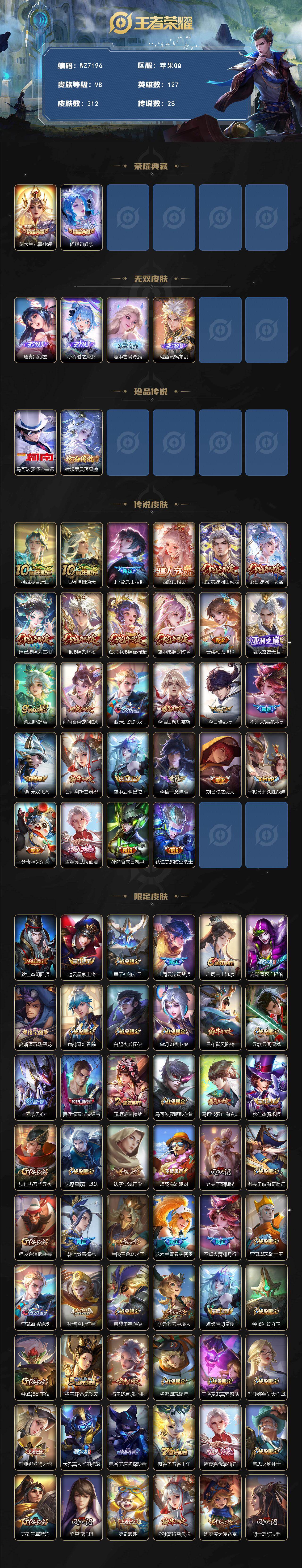 苹果q-v8-最强王者段位-127英雄-312皮肤-2典藏皮肤-4无双-2珍品传说-28传说-92史诗 【英雄全皮】:司马懿全皮,孙权全皮,李信全皮,蒙恬全皮,影全皮 【荣耀典藏】:花木兰九霄神辉,貂蝉幻阙歌 【无双皮肤】:瑶真我赫兹,小乔时之魔女,甄姬雪境奇遇,曜器灵螭龙剑 【珍品传说】:马可波罗怪盗基德,嫦娥器灵落星盏 【传说皮肤】:杨戬纵目迁山,后羿神树通天,司马懿九山相柳,西施续相思,