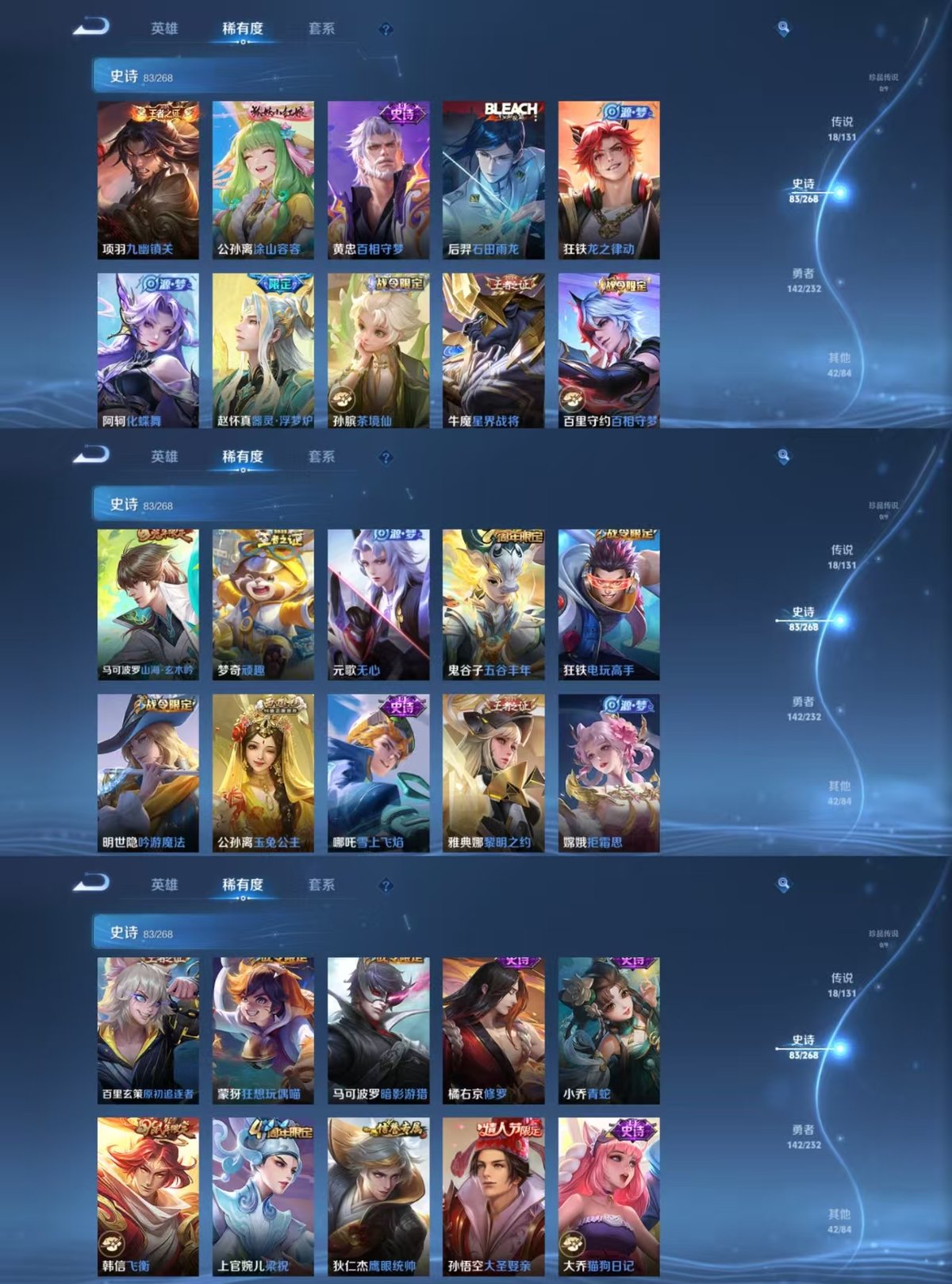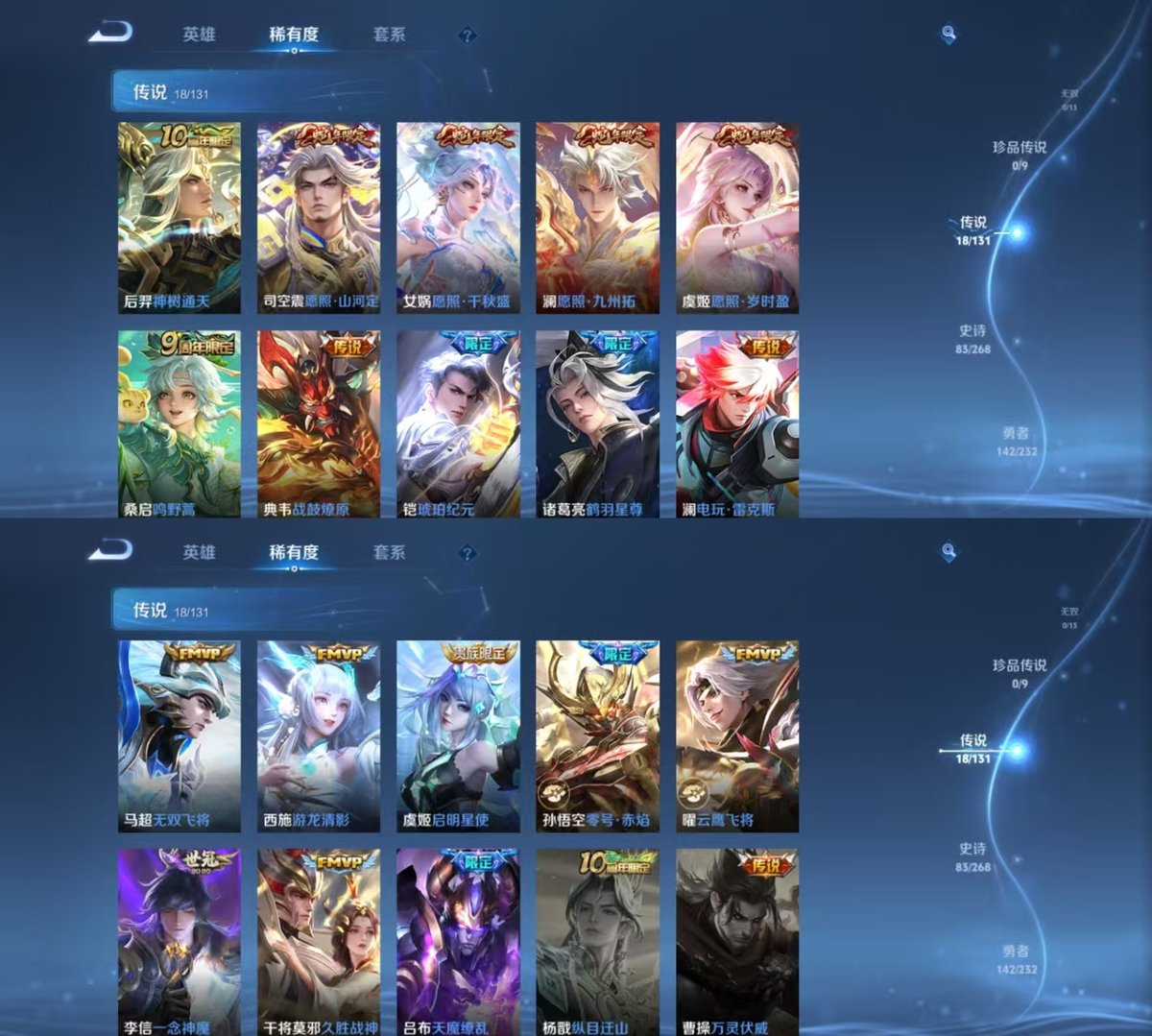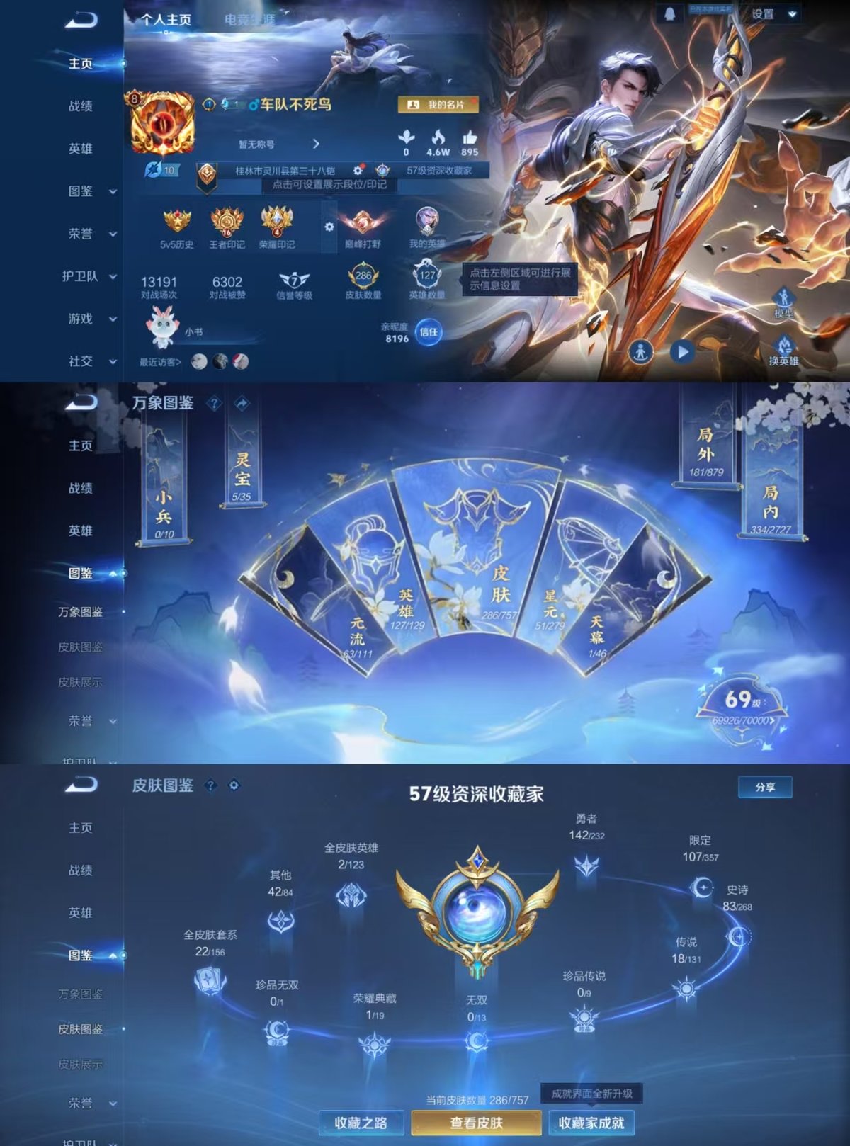 127英雄-286皮肤-实名: 可修改 贵族等级: v8 英雄数: 127 皮肤数: 286 荣耀水晶: 银白咏叹调 传说皮: 云鹰飞将久胜战神一念神魔零号·赤焰游龙清影无双飞将电玩·雷克斯鹤羽星尊琥珀纪元铠典韦战鼓燎原神树通天 限定皮: 遇见飞天李小龙梁祝引擎之心天魔缭乱飞衡至尊宝大圣娶亲默契交锋-花木兰高山流水玉兔公主五谷丰年山海·玄木吟鸣野蒿逐霄战戟愿照·千秋盛愿