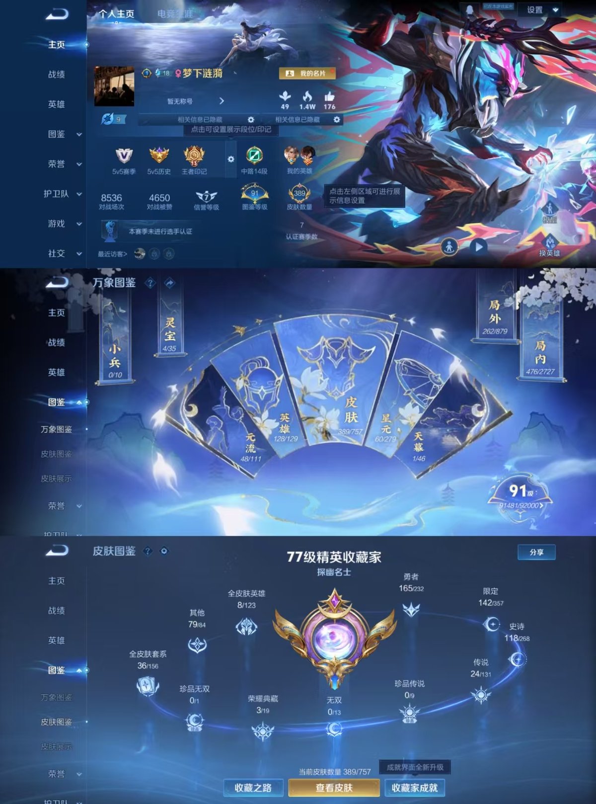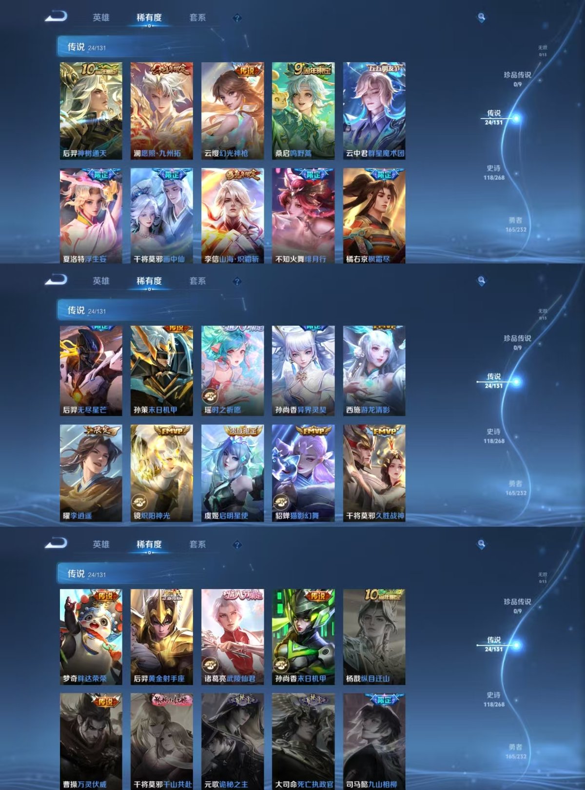 128英雄-389皮肤-实名: 可修改 贵族等级: v8 英雄数: 128 皮肤数: 389 荣耀水晶: 鸣剑·曳影九霄神辉千魇归渊 传说皮: 黄金射手座猫影幻舞久胜战神炽阳神光末日机甲-孙尚香胖达荣荣李游龙清影末日机甲-孙策山海·炽霜斩画中仙浮生妄云中君群星魔术团幻光神呛神树通天 限定皮: 冰锋战神李小龙游园惊梦梁祝烈魂异界灵契天狼溯光者神威朱雀志真爱至上武陵仙君