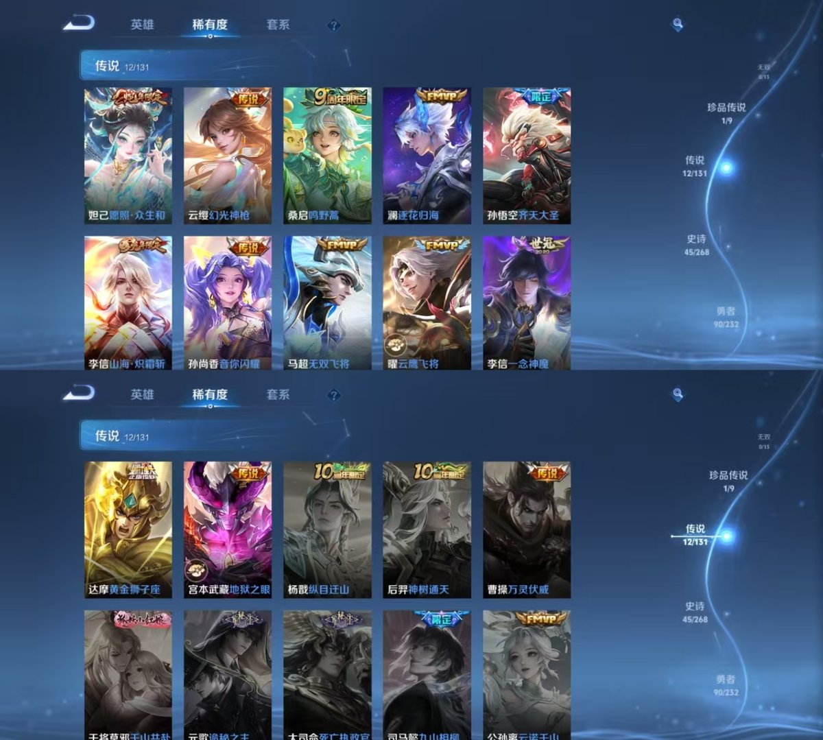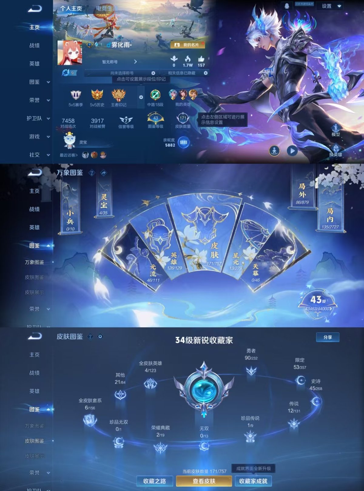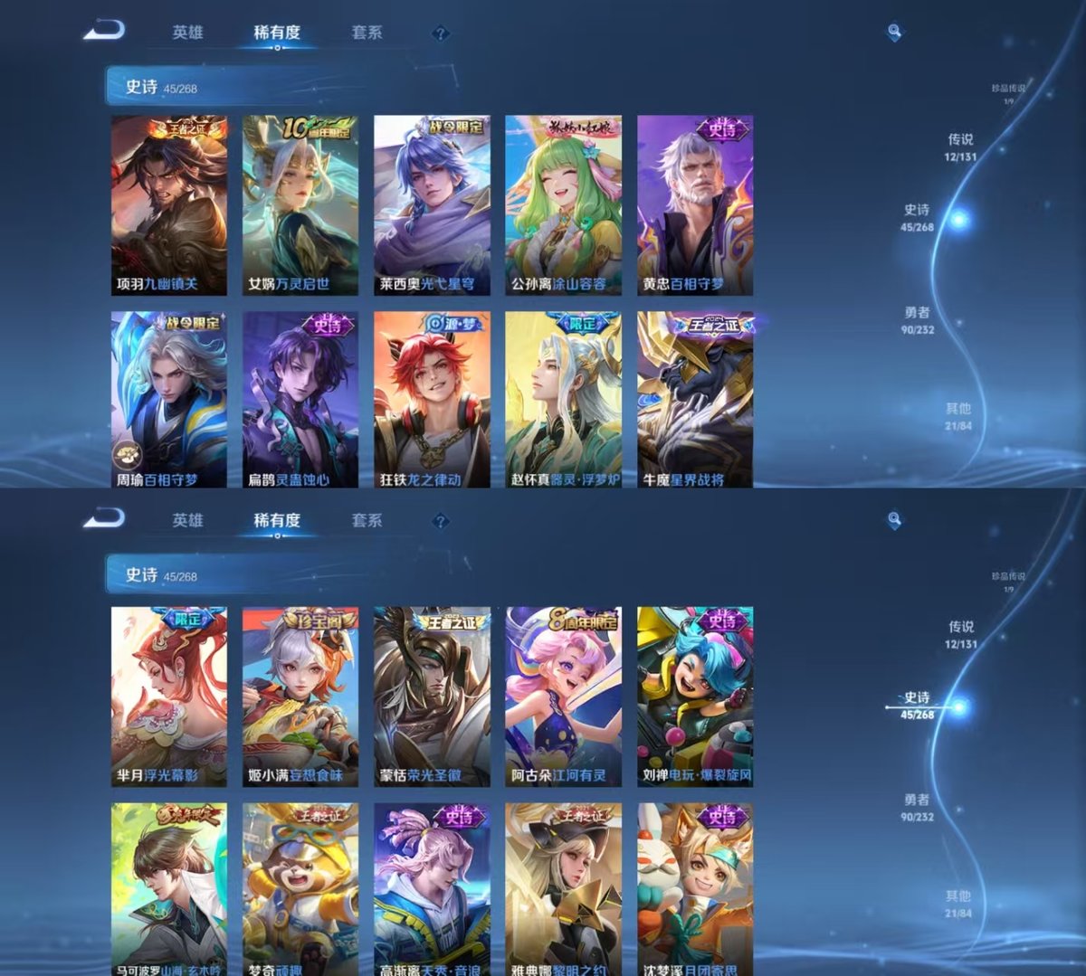 126英雄-171皮肤-实名: 可修改 贵族等级: v7 英雄数: 126 皮肤数: 171 荣耀水晶: 鸣剑·曳影弑呛猎影 珍品传说: 器灵·落星盏 传说皮: 黄金狮子座云鹰飞将一念神魔地狱之眼无双飞将音你闪耀山海·炽霜斩澜逐花归海幻光神呛 限定皮: 梁祝山海·玄木吟齐天大圣鸣野蒿愿照·众生和