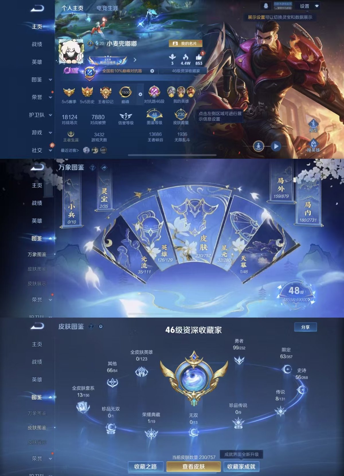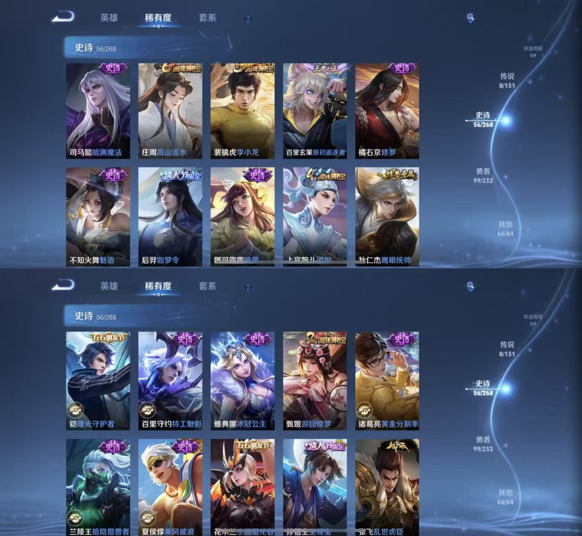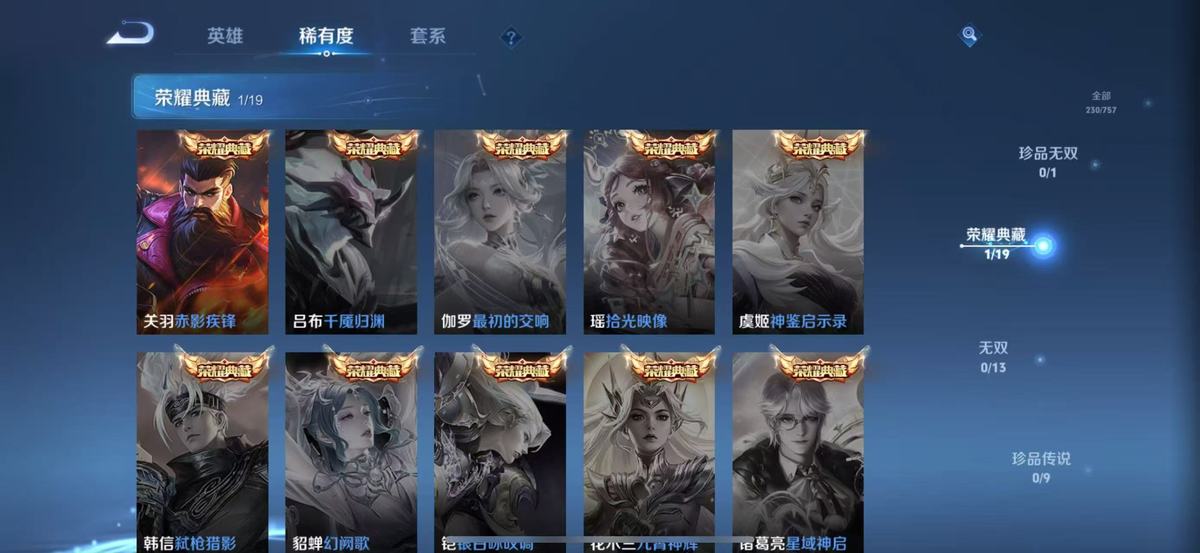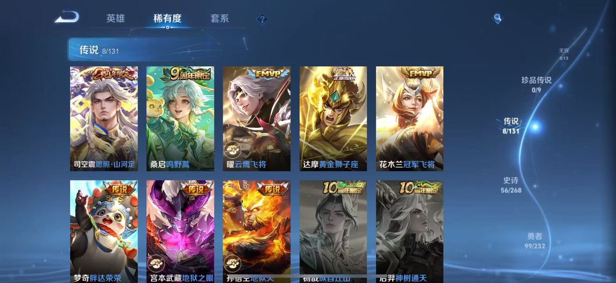 126英雄-230皮肤-实名: 可修改 贵族等级: v7 英雄数: 126 皮肤数: 230 荣耀水晶: 赤影疾锋 传说皮: 黄金狮子座冠军飞将云鹰飞将地狱火地狱之眼胖达荣荣 限定皮: 遇见飞天李小龙游园惊梦梁祝玄武志至尊宝如梦令-后羿高山流水五谷丰年鸣野蒿愿照·山河定