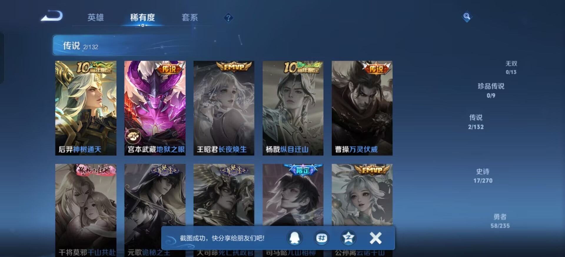 v3 1典藏 2传说 111英雄 91皮肤 可修改实名 男号 【英雄全皮】蚩奼全皮大禹全皮 【稀有英雄】大司命嬴政始皇帝韩信韩跳跳夏洛特夏师傅橘右京橘子娜可露露鸟人不知火舞赵云金蝉唐僧戈娅 【荣耀水晶】全息碎影猴子典藏 【传说皮】神树通天地狱之眼