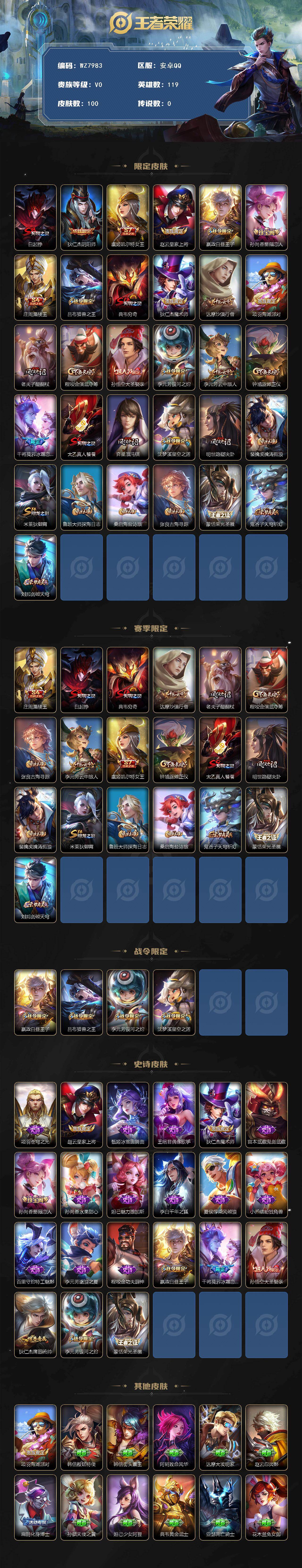 安卓q-v0-荣耀黄金i段位-119英雄-100皮肤-21史诗 【限定皮肤】:白起狰,狄仁杰阴阳师,虞姬凯尔特女王,赵云皇家上将,嬴政白昼王子,孙尚香蔷薇恋人,庄周蜃楼王,吕布猎兽之王,典韦穷奇,狄仁杰魔术师,达摩沙漠行僧,项羽海滩派对,老夫子醍醐杖,程咬金演武夺筹,孙悟空大圣娶亲,李元芳银河之约,李元芳云中旅人,钟馗驱傩正仪,干将莫邪冰霜恋舞曲,太乙真人饕餮,弈星混沌棋,沈梦溪星空之诺,明世