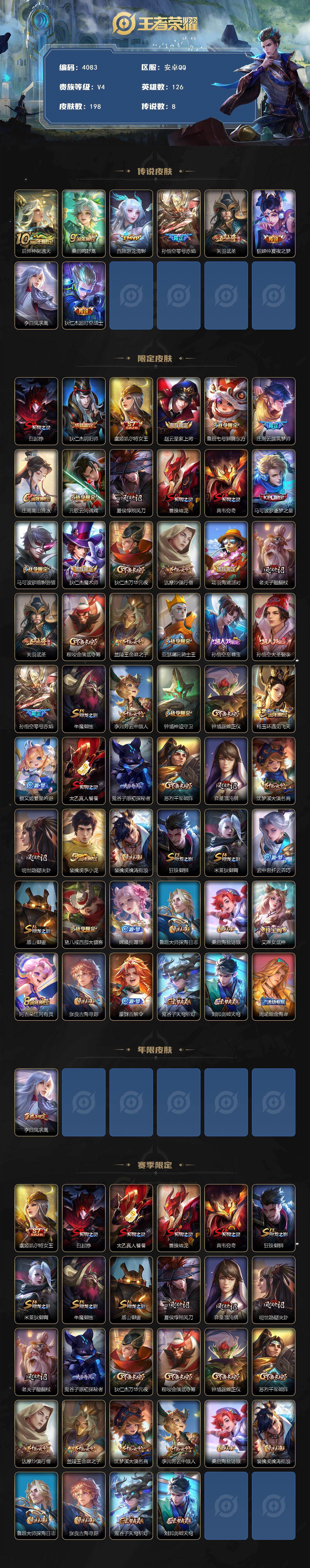 126英雄-198皮肤-贵族4/皮肤198/传说8/史诗48/英雄126/神树通天 后羿/鸣野蒿 桑启/游龙清影 西施/零号·赤焰 孙悟空/武圣 关羽/仲夏夜之梦 貂蝉/凤求凰 李白/超时空战士 狄仁杰/狰 白起/阴阳师 狄仁杰/凯尔特女王 虞姬/皇家上将 赵云/狮舞东方 鲁班七号/云端筑梦师 庄周/高山流水 庄周/云间偶戏 元歌/朔风刀 夏侯惇/烛龙 曹操/穷奇 典韦/逐梦之星 马可波罗/暗影游猎 马可波罗/魔术师
