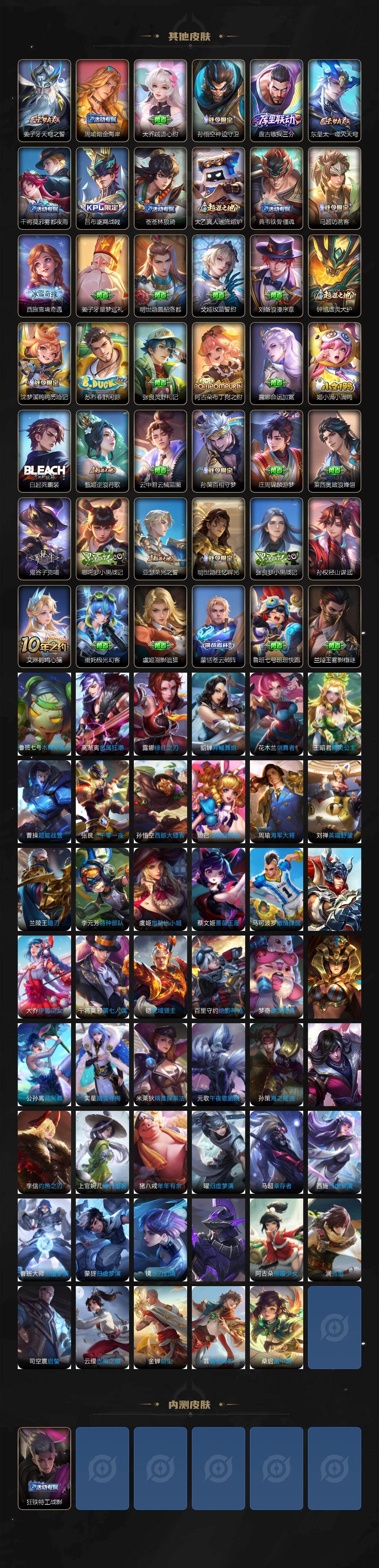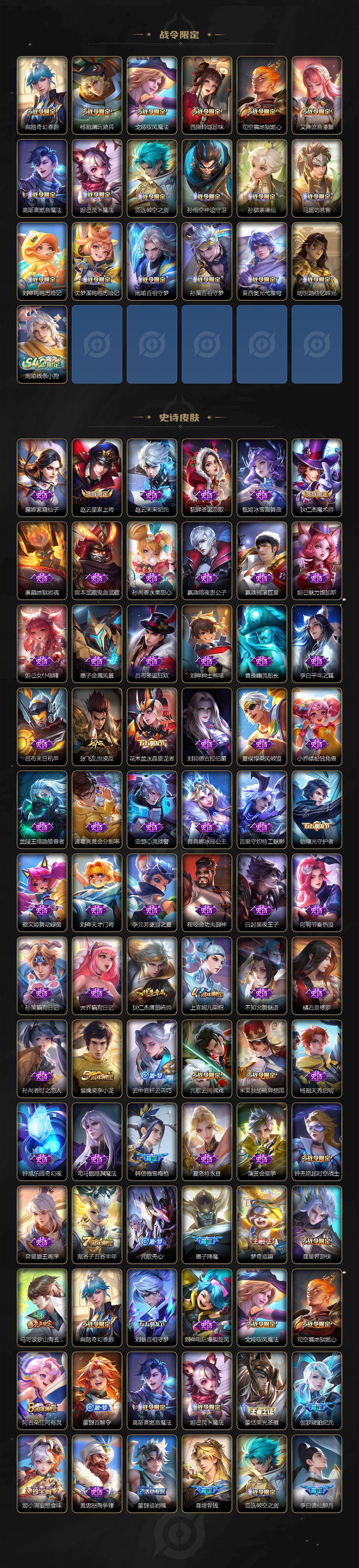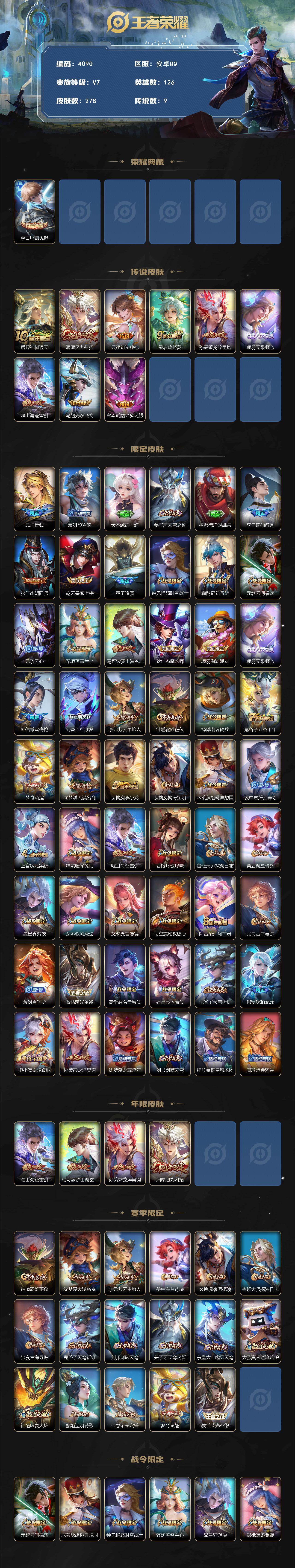 126英雄-278皮肤-贵族7/皮肤278/典藏1/传说9/史诗88/英雄126/刘禅全皮/孙权全皮/蒙恬全皮/戈娅全皮/鸣剑·曳影 李白/神树通天 后羿/愿照·九州拓 澜/幻光神呛 云缨/鸣野蒿 桑启/乘龙·淬吴钩 孙策/无限倾心 项羽/山海·苍雷引 曜/无双飞将 马超/地狱之眼 宫本武藏/埋骨钱 暃/顽岩魄 蒙犽/绒语心约 大乔/天穹之誓 姜子牙/破阵·退雄兵 杨戬/谪仙醉月 李白/阴阳师 狄仁杰/皇家上将 赵云