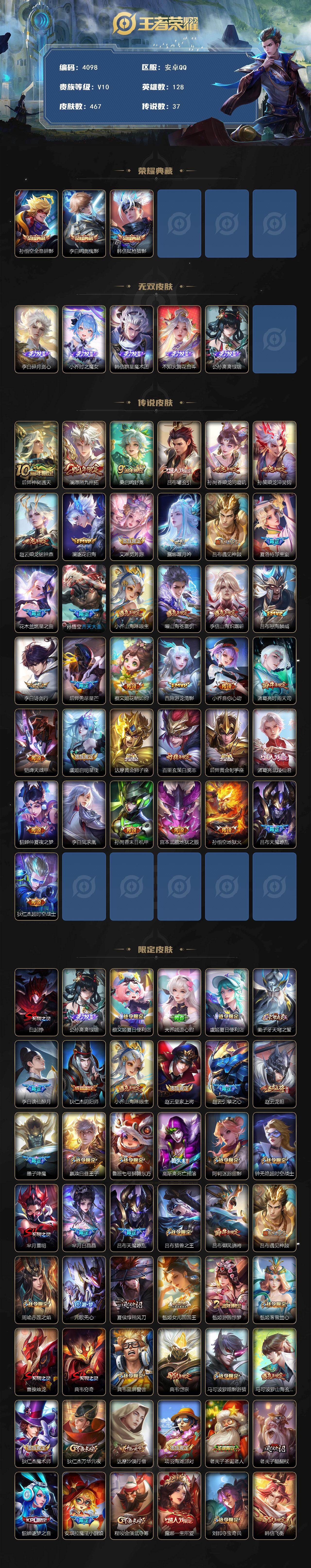 贵族10-流光积分983-467皮-3典藏-5无双-37传说-10全皮-龙腾四海天幕-赞萌露比小兵-改名卡3-灵宝改名卡1-星传说玉鸾吟-幽冥火-星际治安官-金色仲夏夜安卓手q532区467皮3典藏37传说5无双v10