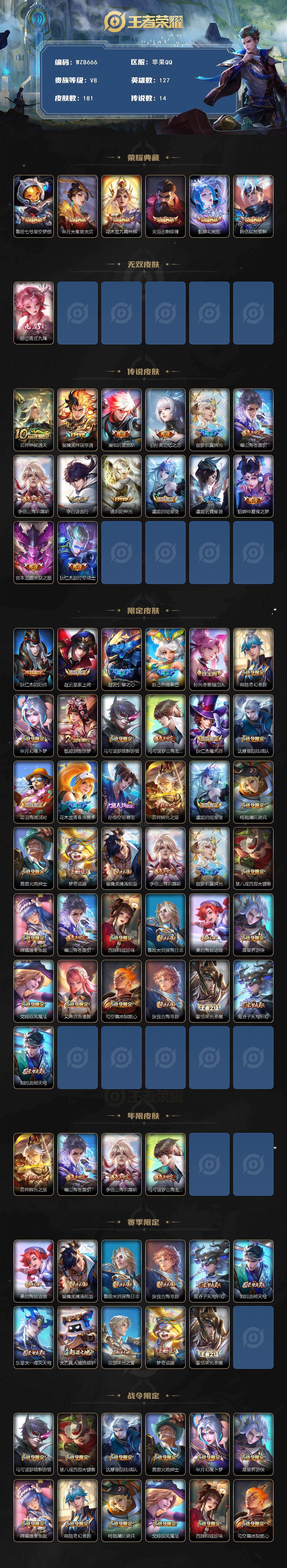 苹果q-v8-至尊星耀v段位-127英雄-181皮肤-6典藏皮肤-1无双-14传说-49史诗 【英雄全皮】:孙权全皮,戈娅全皮,影全皮 【荣耀典藏】:鲁班七号星空梦想,芈月大秦宣太后,花木兰九霄神辉,关羽赤影疾锋,貂蝉幻阙歌,韩信弑呛猎影 【无双皮肤】:妲己青丘九尾 【传说皮肤】:后羿神树通天,裴擒虎祥瑞亨通,澜电玩雷克斯,公孙离记忆之芯,伽罗炽翼辉光,曜山海苍雷引,李信山海炽霜斩,李白诗剑行