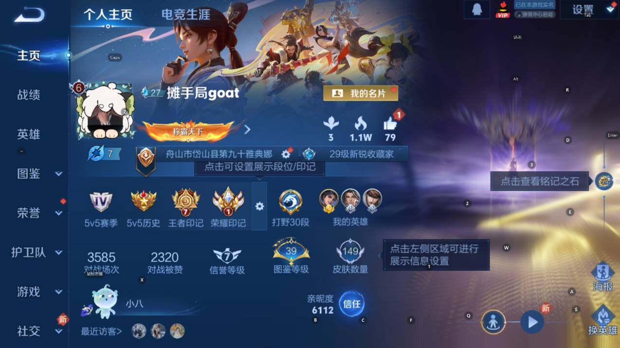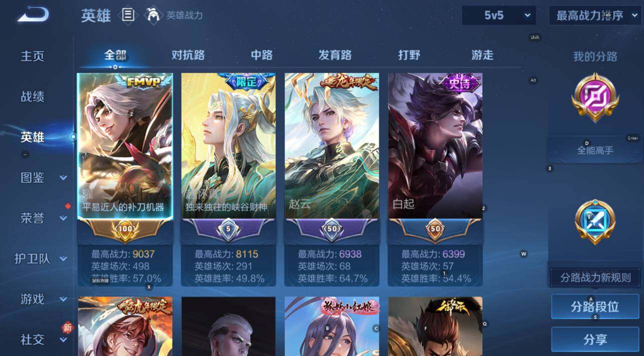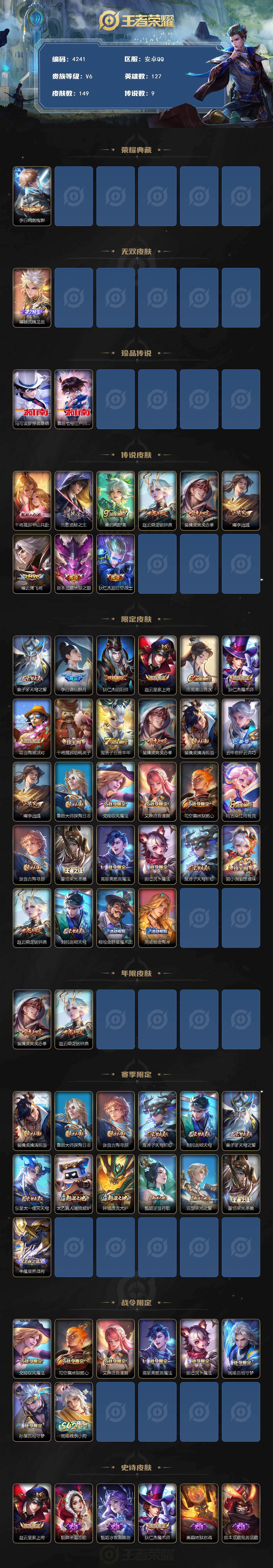 可二次 贵族6-打野30段-金标曜-149皮-1典藏-1无双-2珍品传说-9传说-3全皮英雄 安卓手q421区