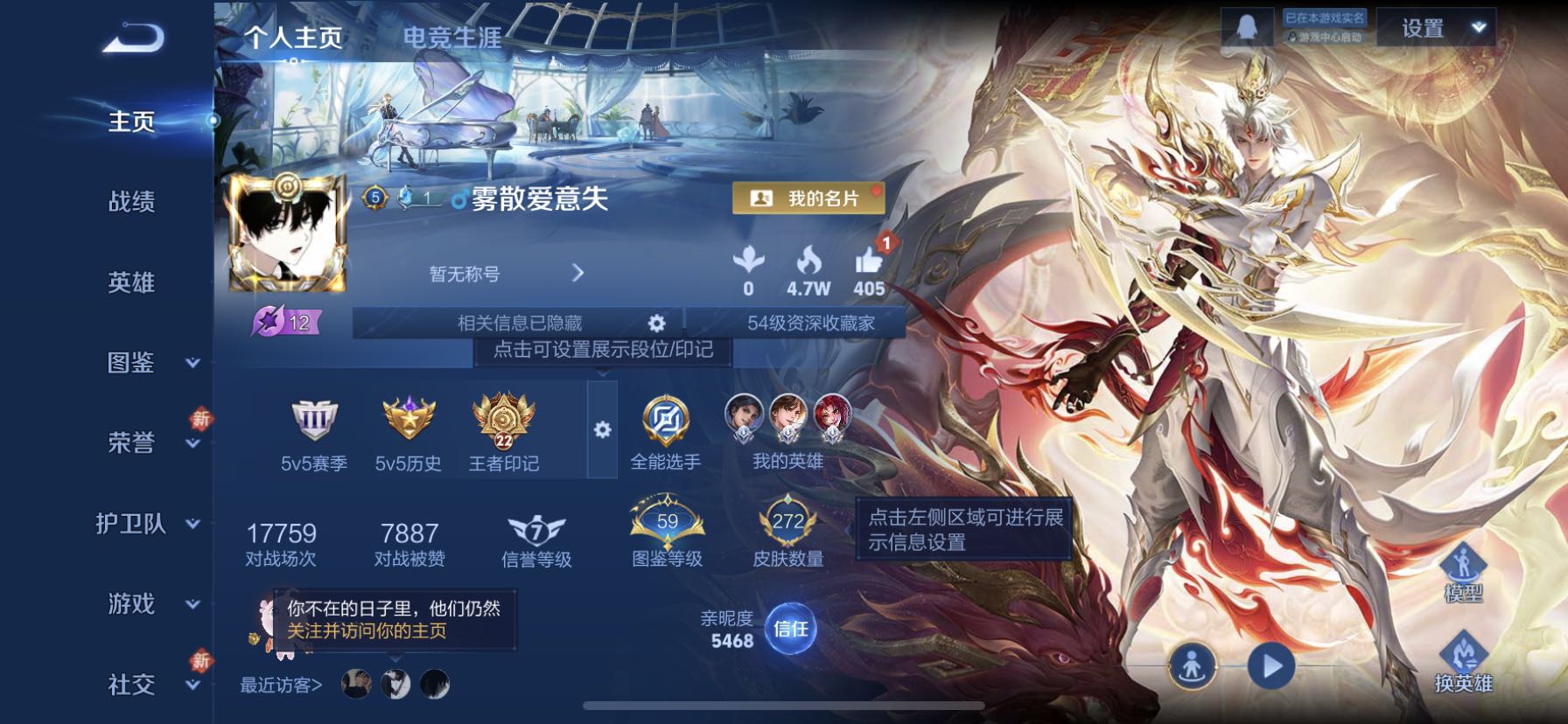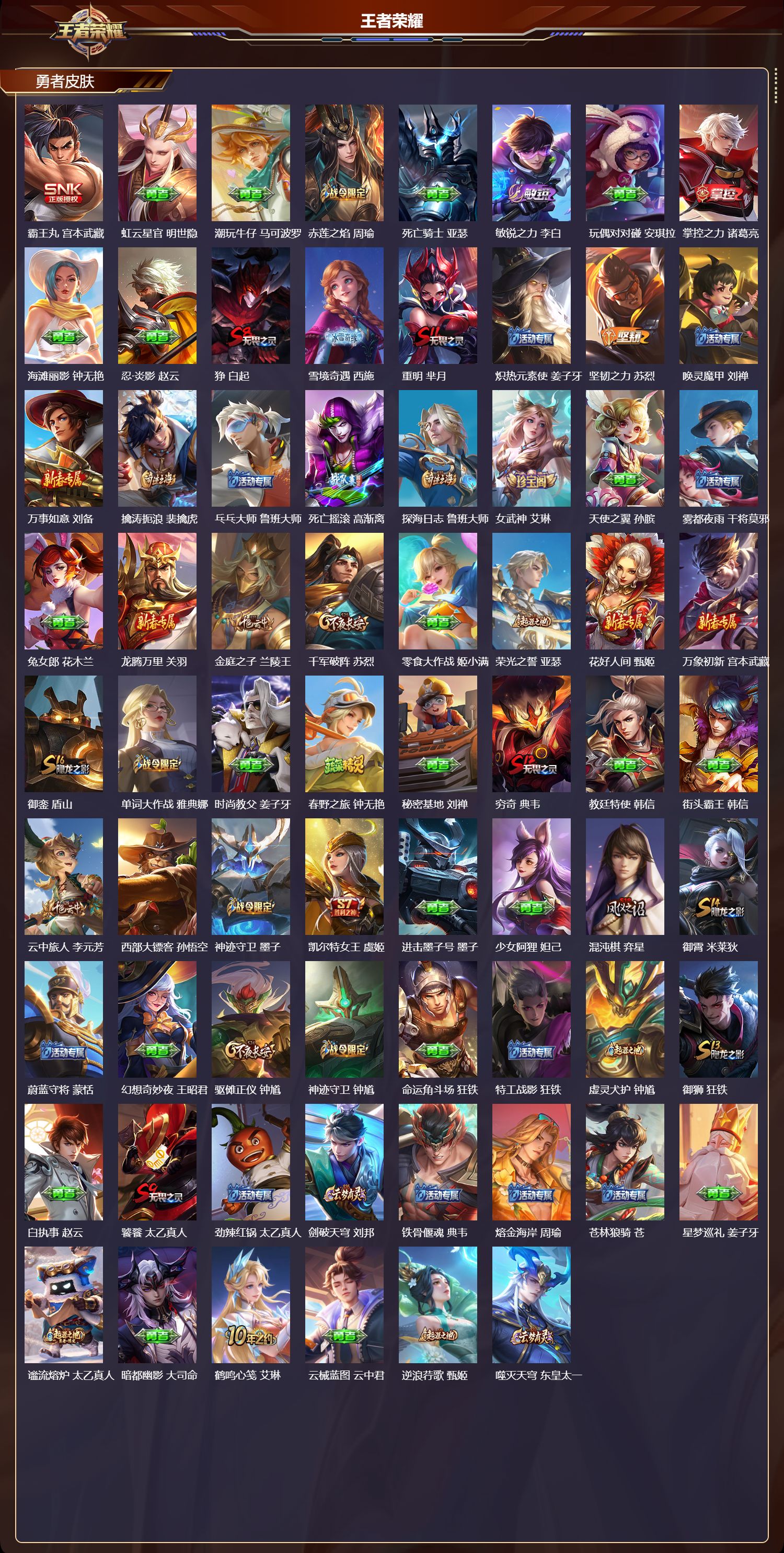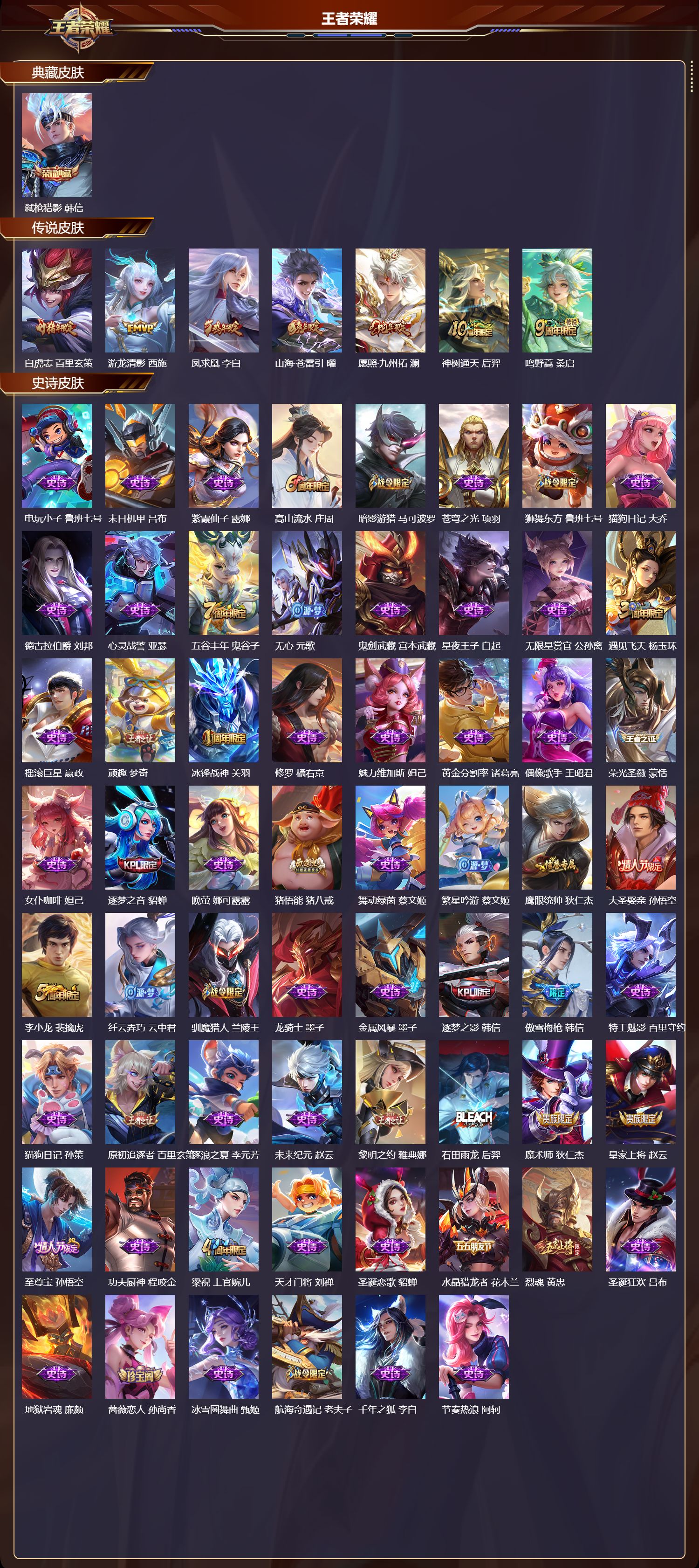 苹果qq/永恒钻石/272皮肤/125英雄/1典藏/0珍品无双/0无双/0珍品传说/7传说/79史诗/8稀有英雄【1 典藏皮肤】弑呛猎影 韩信【7 传说皮肤】白虎志 百里玄策游龙清影 西施凤求凰 李白山海·苍雷引 曜愿照·九州拓 澜神树通天 后羿鸣野蒿 桑启【79 史诗皮肤】电玩小子 鲁班七号末日机甲 吕布紫霞仙子 露娜高山流水 庄周暗影游猎 马可波罗苍穹之光 项羽狮舞