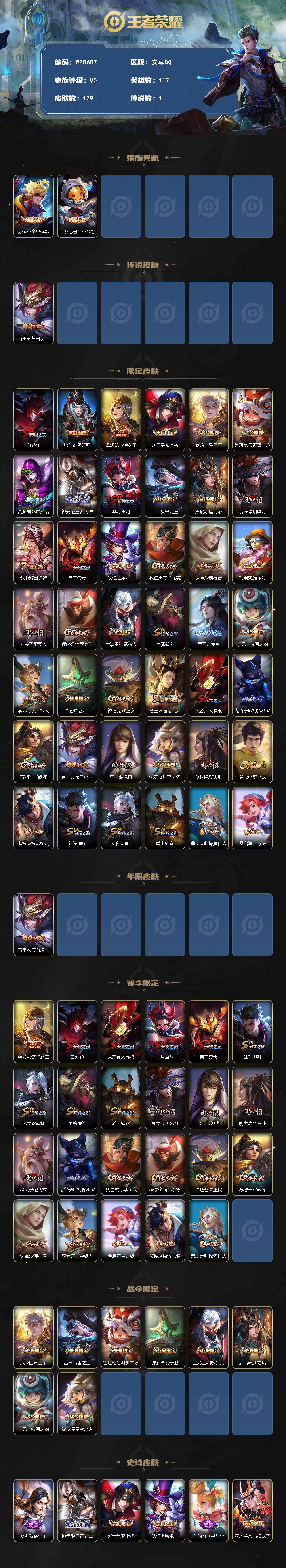 安卓q-v0-秩序白银iii段位-117英雄-129皮肤-2典藏皮肤-1传说-17史诗 【荣耀典藏】:孙悟空全息碎影,鲁班七号星空梦想 【传说皮肤】:百里玄策白虎志 【限定皮肤】:白起狰,狄仁杰阴阳师,虞姬凯尔特女王,赵云皇家上将,嬴政白昼王子,鲁班七号狮舞东方,高渐离死亡摇滚,钟无艳王者之锤,芈月重明,吕布猎兽之王,周瑜赤莲之焰,夏侯惇朔风刀,甄姬游园惊梦,典韦穷奇,狄仁杰魔术师,狄仁杰万华