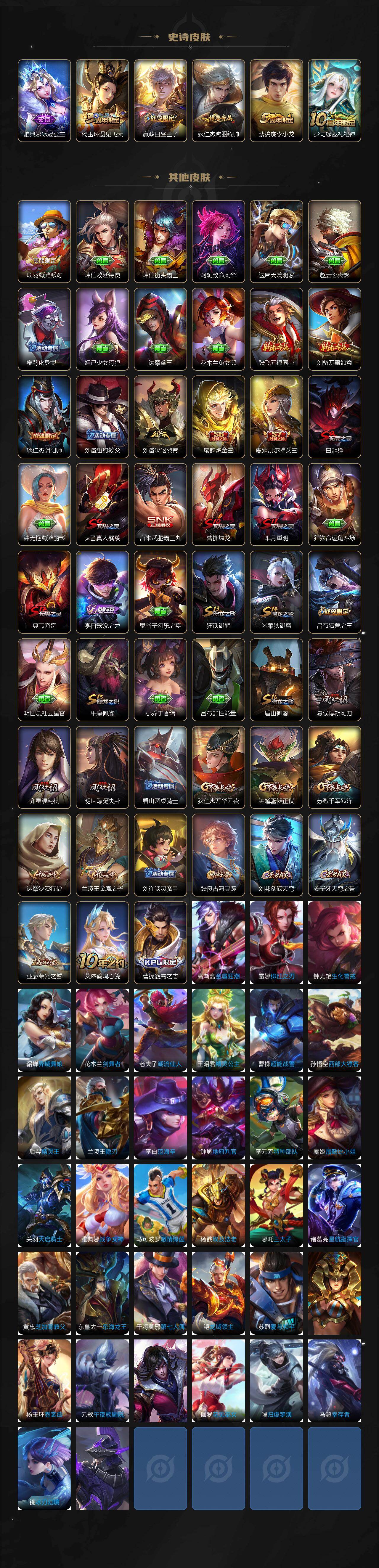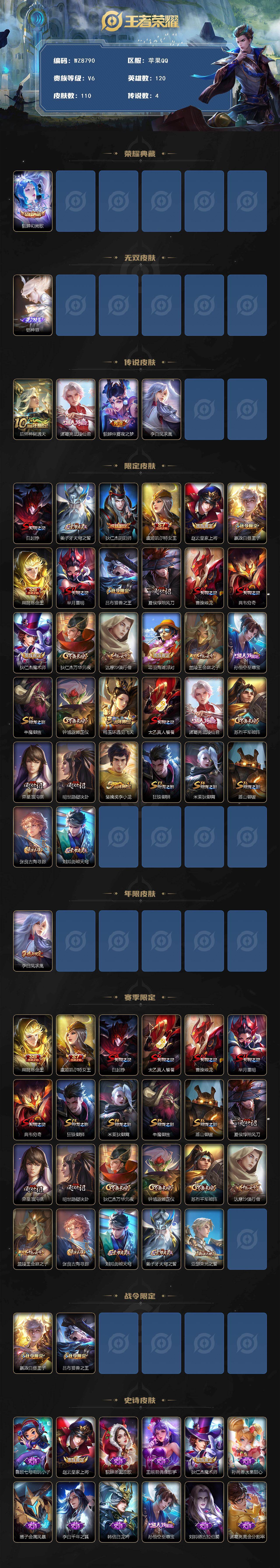 苹果q-v6-最强王者段位-120英雄-110皮肤-1典藏皮肤-1无双-4传说-18史诗 【荣耀典藏】:貂蝉幻阙歌 【无双皮肤】:铠神罪 【传说皮肤】:后羿神树通天,诸葛亮武陵仙君,貂蝉仲夏夜之梦,李白凤求凰 【限定皮肤】:白起狰,姜子牙天穹之誓,狄仁杰阴阳师,虞姬凯尔特女王,赵云皇家上将,嬴政白昼王子,扁鹊炼金王,芈月重明,吕布猎兽之王,夏侯惇朔风刀,曹操烛龙,典韦穷奇,狄仁杰魔术师,狄仁杰