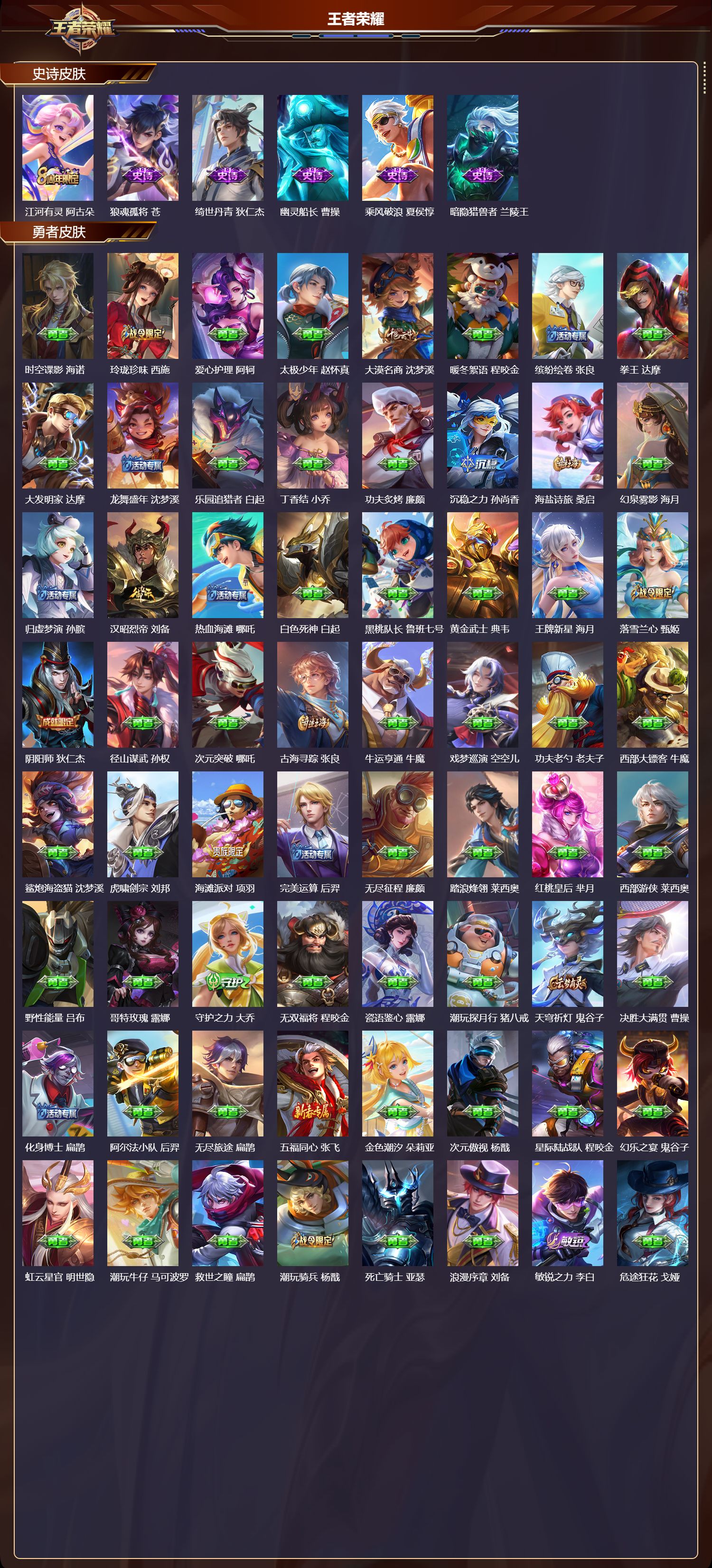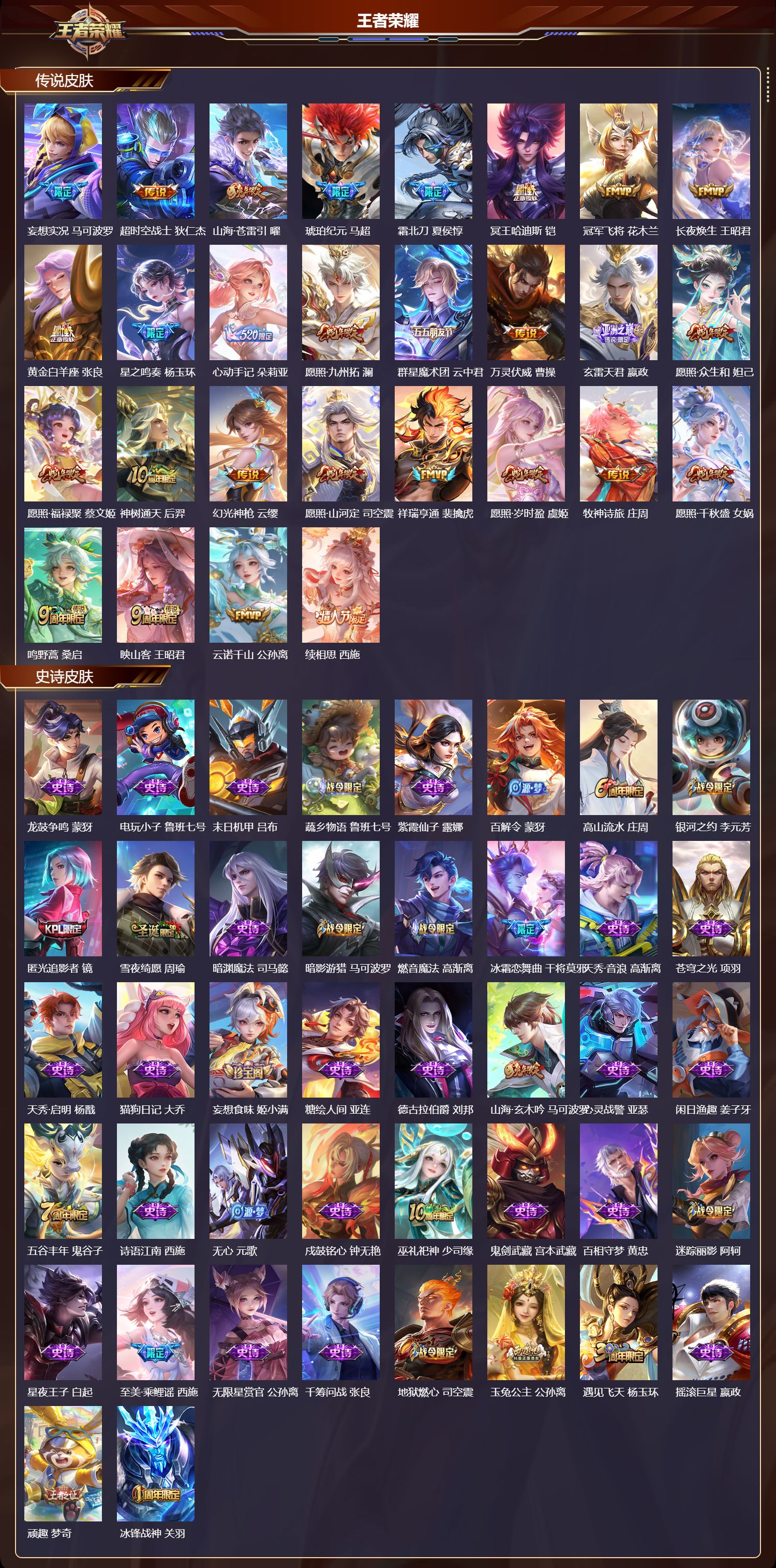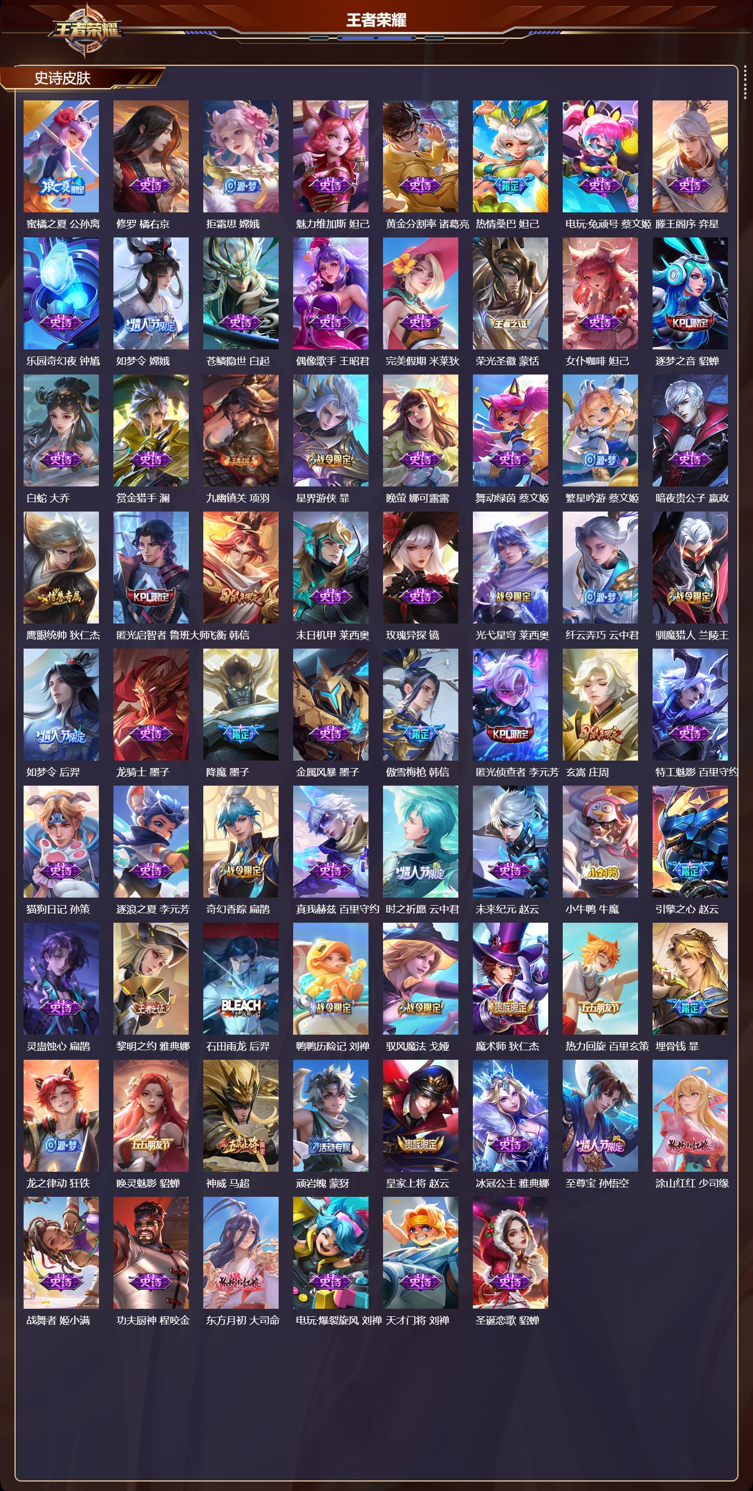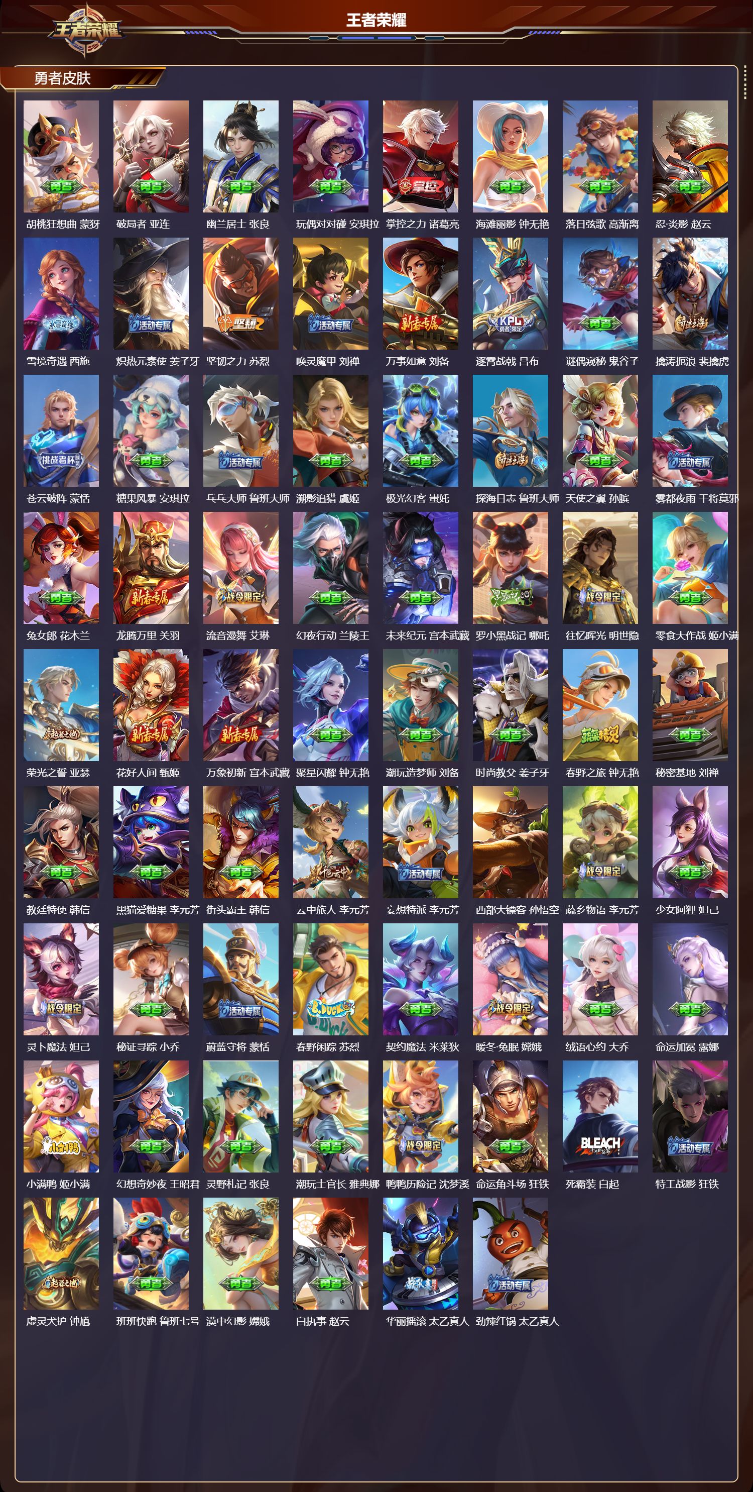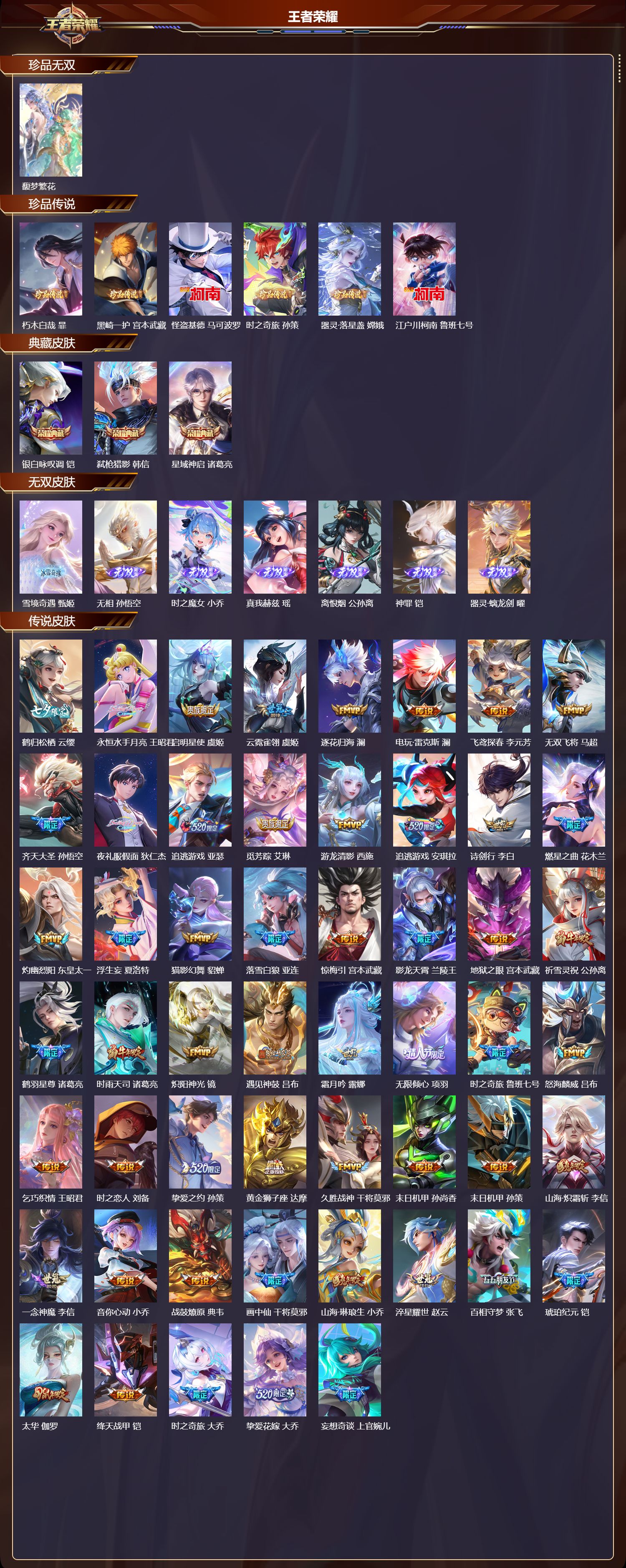 苹果微信/至尊星耀/534皮肤/128英雄/3典藏/1珍品无双/7无双/6珍品传说/81传说/188史诗/9稀有英雄【1 珍品无双】馥梦繁花【6 珍品传说】朽木白哉 暃黑崎一护 宫本武藏怪盗基德 马可波罗时之奇旅 孙策器灵·落星盏 嫦娥江户川柯南 鲁班七号【3 典藏皮肤】银白咏叹调 铠弑呛猎影 韩信星域神启 诸葛亮【7 无双皮肤】雪境奇遇 甄姬无相 孙悟空时之魔女 小乔真