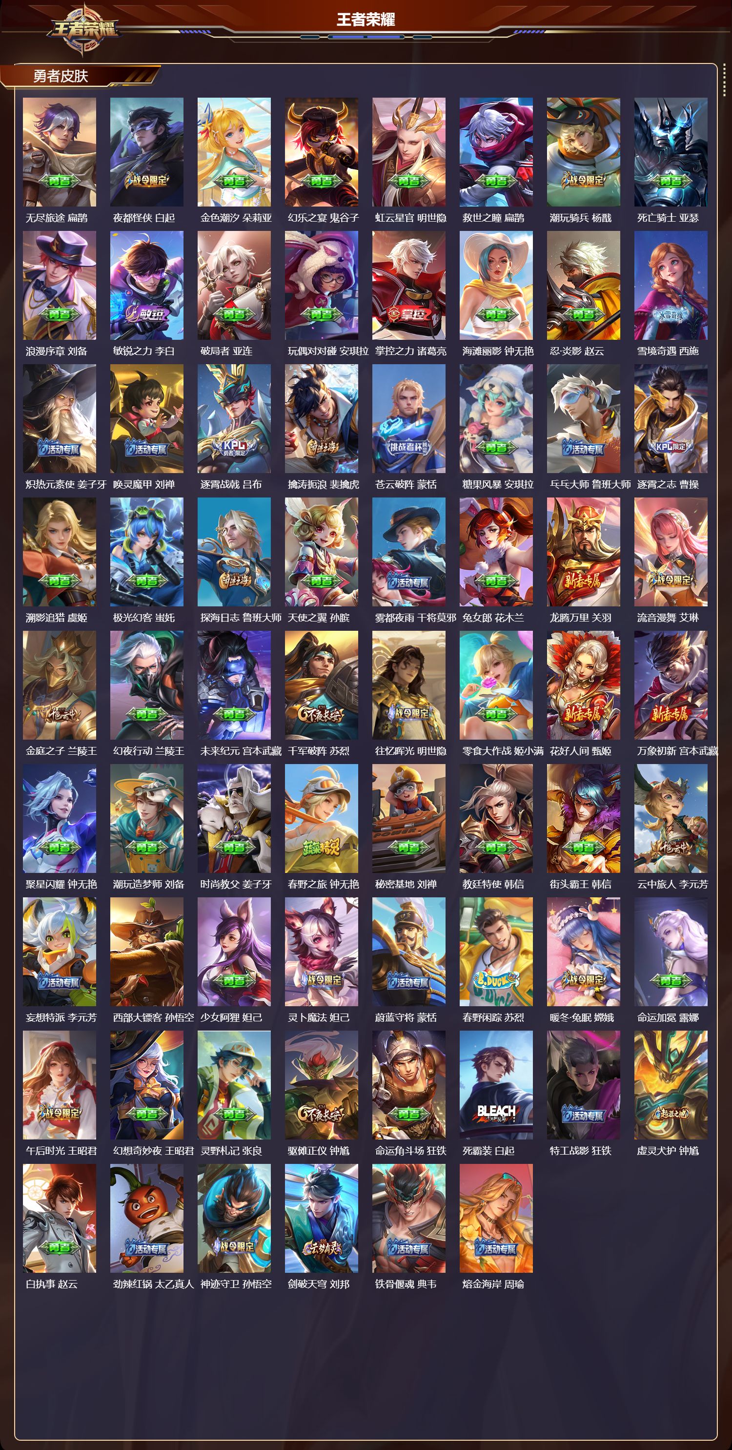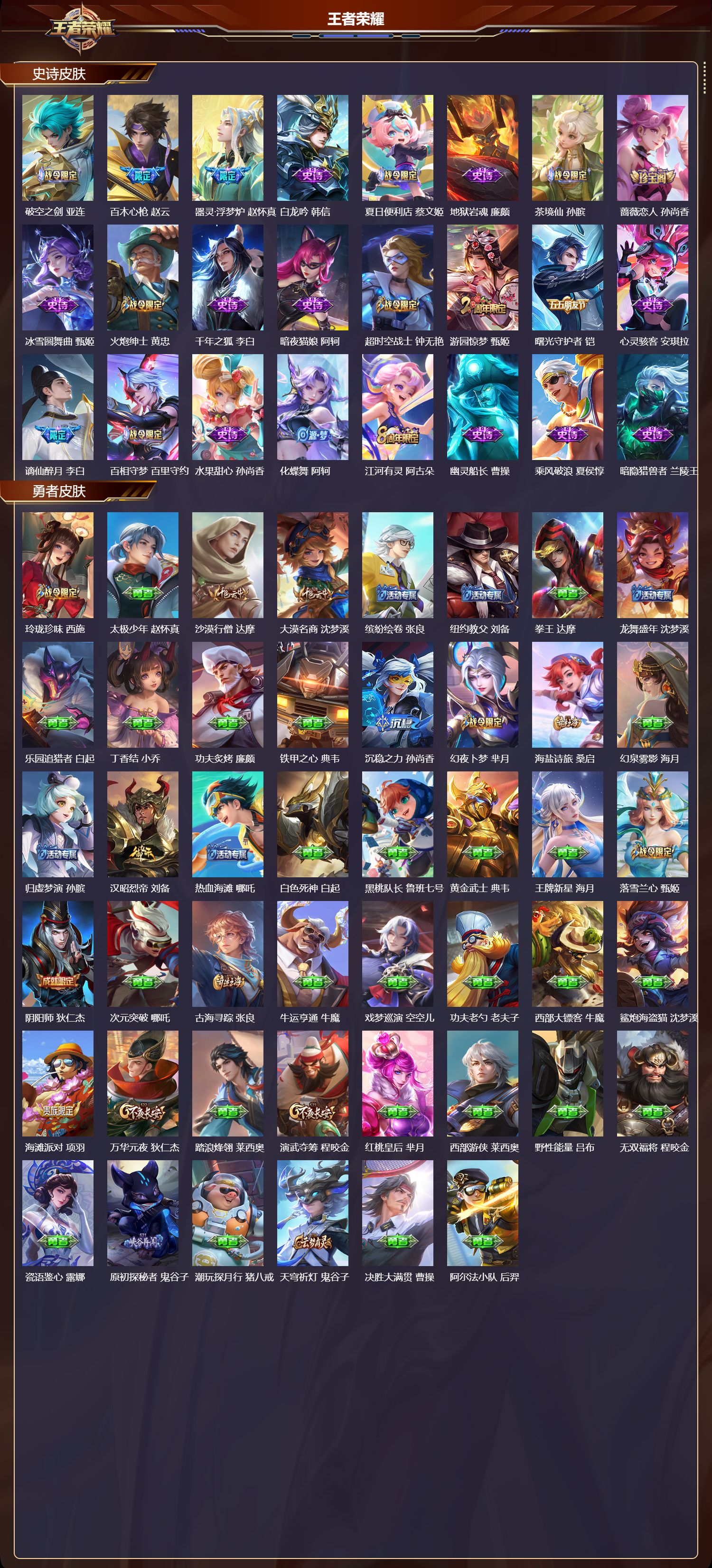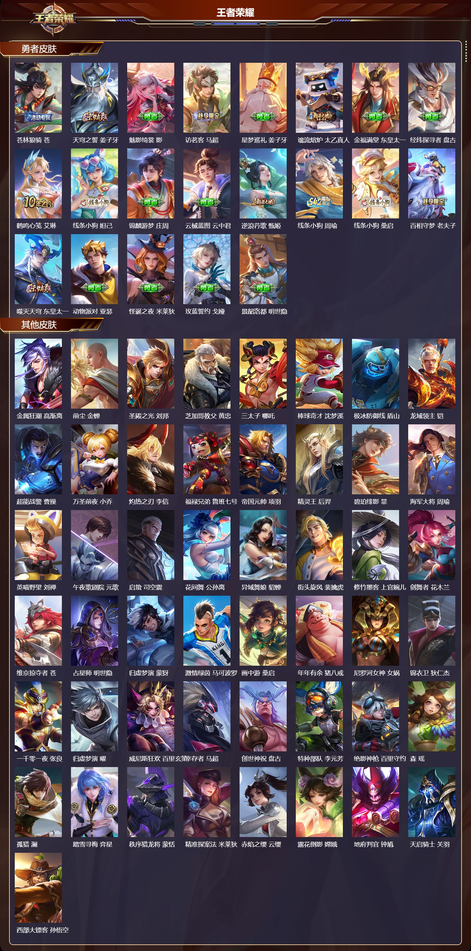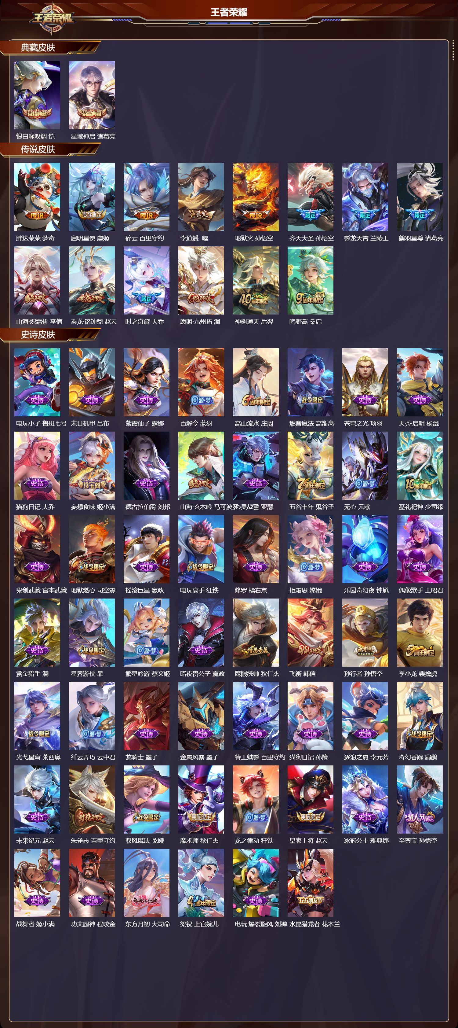 128英雄-280皮肤-安卓qq/至尊星耀/280皮肤/128英雄/2典藏/0珍品无双/0无双/0珍品传说/14传说/78史诗/9稀有英雄【2 典藏皮肤】银白咏叹调 铠星域神启 诸葛亮【14 传说皮肤】胖达荣荣 梦奇启明星使 虞姬碎云 百里守约李 曜地狱火 孙悟空齐天大圣 孙悟空影龙天霄 兰陵王鹤羽星尊 诸葛亮山海·炽霜斩 李信乘龙·铭钟鼎 赵云时之奇旅 大乔愿照·九州拓 澜神树通天 后