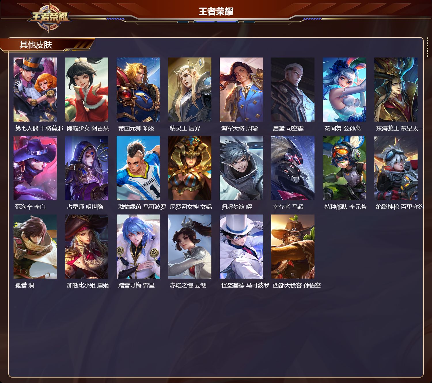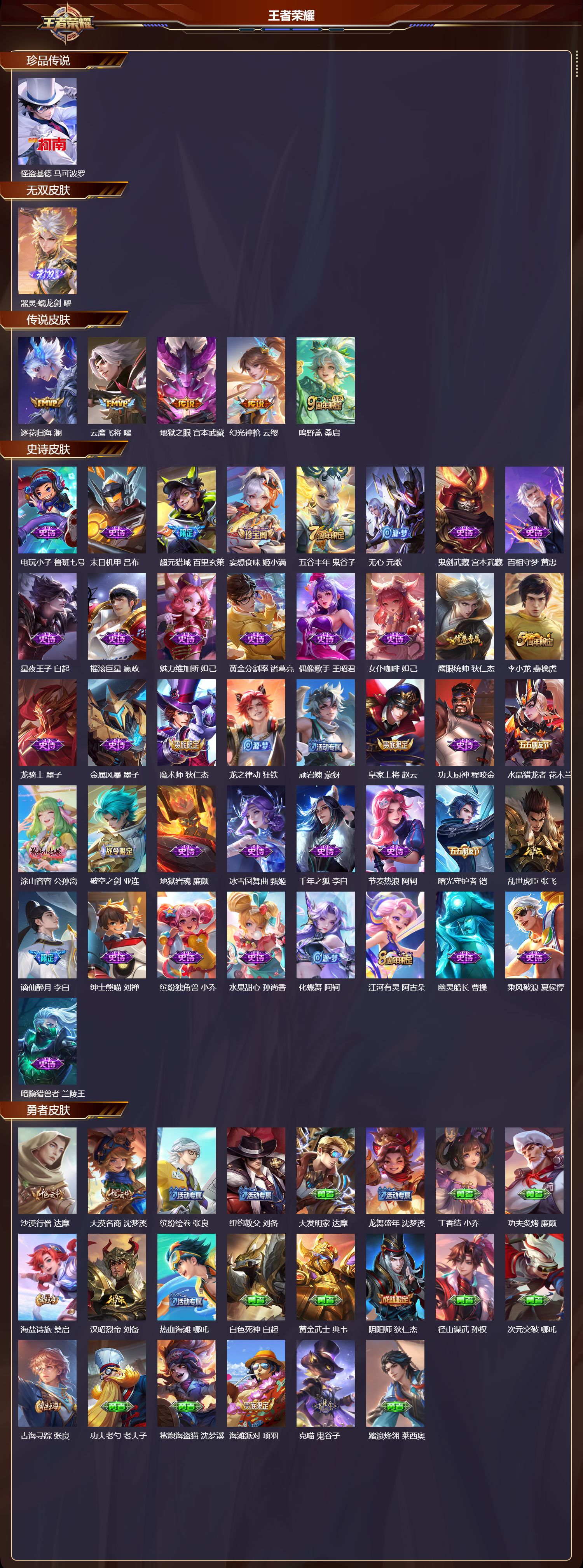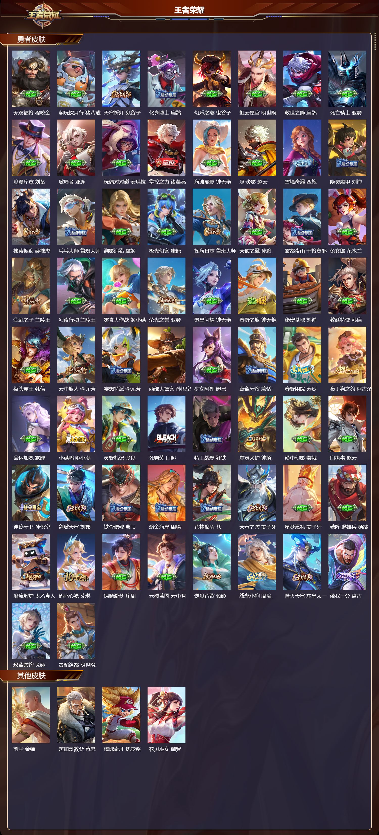 126英雄-161皮肤-安卓qq/最强王者/161皮肤/126英雄/0典藏/0珍品无双/1无双/1珍品传说/5传说/41史诗/7稀有英雄【1 珍品传说】怪盗基德 马可波罗【1 无双皮肤】器灵·螭龙剑 曜【5 传说皮肤】逐花归海 澜云鹰飞将 曜地狱之眼 宫本武藏幻光神呛 云缨鸣野蒿 桑启【41 史诗皮肤】电玩小子 鲁班七号末日机甲 吕布超元猎域 百里玄策妄想食味 姬小满五谷丰年 鬼谷子无心 元歌鬼