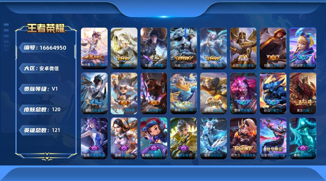[16664950]安卓wx-v0-永恒钻石ii段位-118英雄-115皮肤-11传说-27史诗 【英雄全皮】:影全皮 【传说皮肤】:孙尚香乘龙问璇玑,马可波罗妄想实况,马超无双飞将,西施游龙清影,李元芳飞鸢探春,铠绛天战甲,镜炽阳神光,李信一念神魔,刘备时之恋人,虞姬云霓雀翎,后羿黄金射手座 【限定皮肤】:姜子牙天穹之誓,狄仁杰阴阳师,赵云皇家上将,赵云引擎之心,马可波罗妄想实况,狄仁杰魔术师,项羽海滩派对,老夫子航海奇遇记,孙悟空孙行者,黄忠烈魂,百里玄策原初追逐者,裴擒虎擒涛扼浪,西施玲珑珍味,鲁班大师探海日志,戈娅驭风魔法,张良古海寻踪,高渐离燃音魔法,妲己灵卜魔法,鬼谷子天穹祈灯,伽罗琥珀纪元,孙尚香乘龙问璇玑,曹操夜都魔契,刘邦剑破天穹 【年限皮肤】:黄忠烈魂,孙尚香乘龙问璇玑 【赛季限定】:张良古海寻踪,百里玄策原初追逐者,裴擒虎擒涛扼浪,鲁班大师探海日志,鬼谷子天穹祈灯,刘邦剑破天穹,姜子牙天穹之誓 【战令限定】:老夫子航海奇遇记,西施玲珑珍味,戈娅驭风魔法,高渐离燃音魔法,妲己灵卜魔法 【史诗皮肤】:鲁班七号电玩小子,露娜紫霞仙子,赵云皇家上将,甄姬冰雪圆舞曲,狄仁杰魔术师,廉颇地狱岩魂,孙尚香水果甜心,妲己魅力维加斯,墨子金属风暴,刘禅绅士熊喵,曹操幽灵船长,李白千年之狐,赵云引擎之心,花木兰水晶猎龙者,诸葛亮黄金分割率,程咬金功夫厨神,阿轲节奏热浪,黄忠烈魂,百里玄策原初追逐者,老夫子航海奇遇记,孙悟空孙行者,澜赏金猎手,戈娅驭风魔法,妲己灵卜魔法,高渐离燃音魔法,伽罗琥珀纪元,曹操夜都魔契,百里守约百相守梦 【其他皮肤】:项羽海滩派对,韩信教廷特使,露娜哥特玫瑰,达摩大发明家,赵云白执事,芈月红桃皇后,程咬金星际陆战队,白起白色死神,牛魔西部大镖客,扁鹊救世之瞳,宫本武藏未来纪元,安琪拉玩偶对对碰,亚瑟死亡骑士,张飞五福同心,狄仁杰阴阳师,刘备汉昭烈帝,诸葛亮掌控之力,小乔丁香结,沈梦溪鲨炮海盗猫,姜子牙炽热元素使,盾山圆桌骑士,狂铁特工战影,鲁班大师乓乓大师,刘禅唤灵魔甲,蒙恬蔚蓝守将,裴擒虎擒涛扼浪,太乙真人劲辣红锅,鲁班大师探海日志,西施玲珑珍味,姬小满零食大作战,李元芳妄想特派,哪吒热血海滩,张良古海寻踪,钟无艳聚星闪耀,亚连破局者,后羿完美运算,鬼谷子天穹祈灯,妲己灵卜魔法,嫦娥漠中幻影,廉颇功夫炙烤,刘邦剑破天穹,姜子牙天穹之誓,东皇太一噬灭天穹,